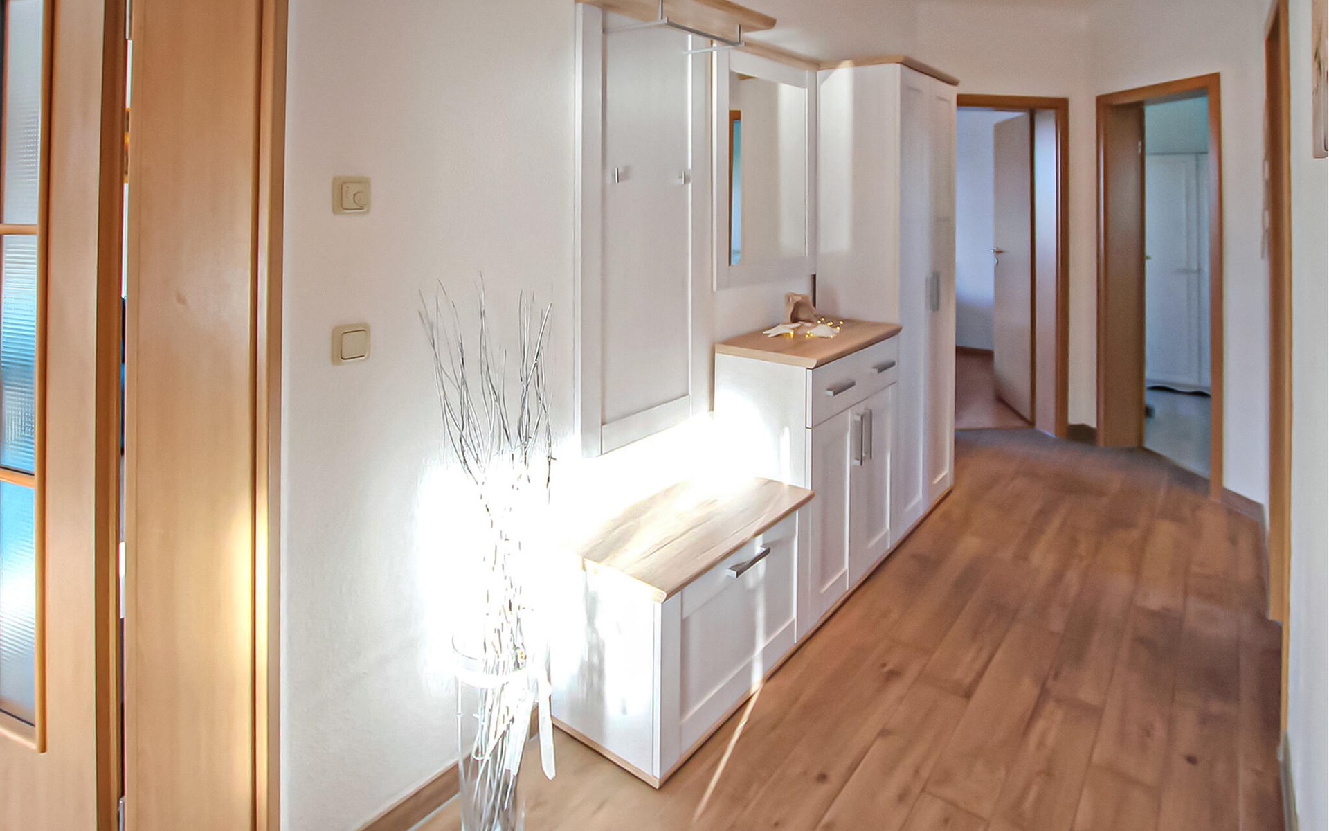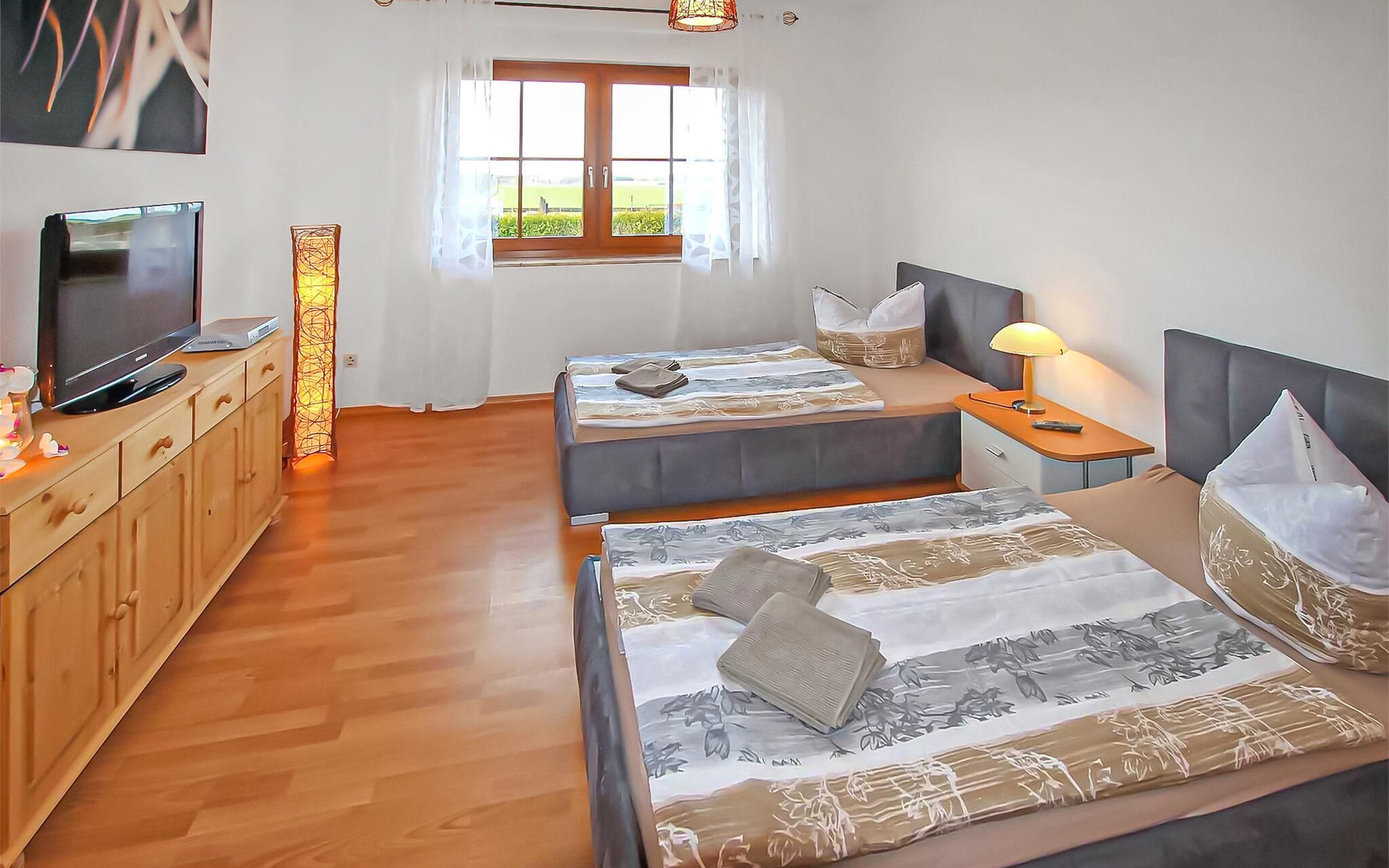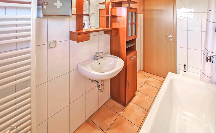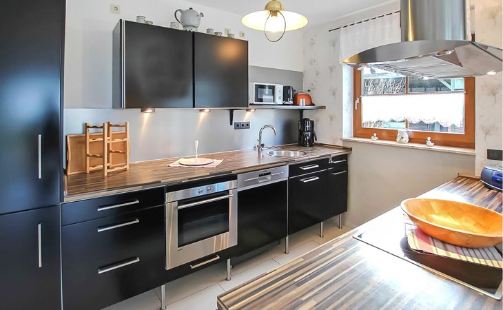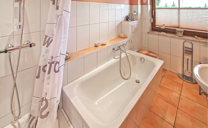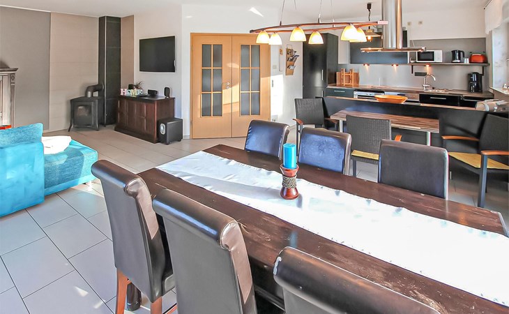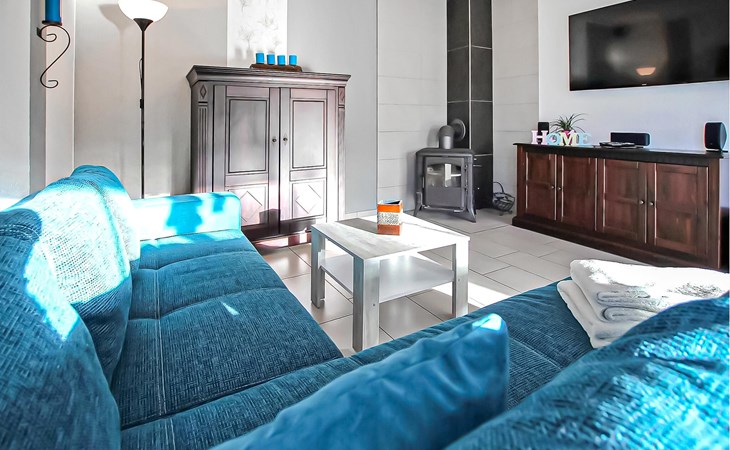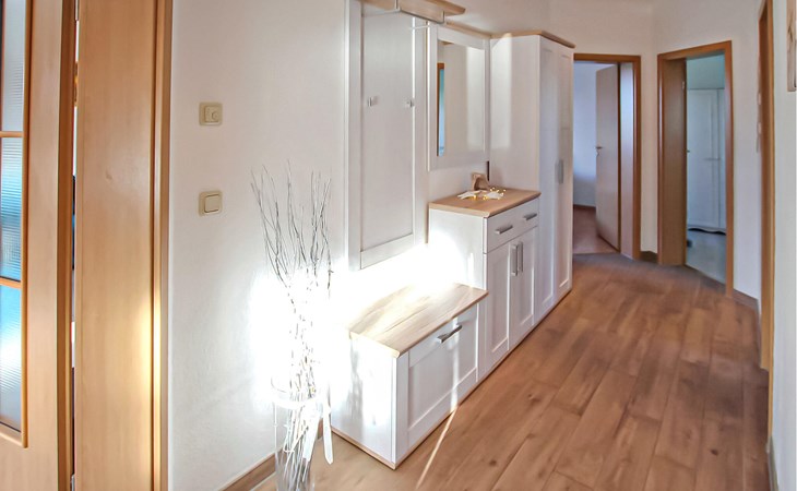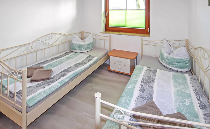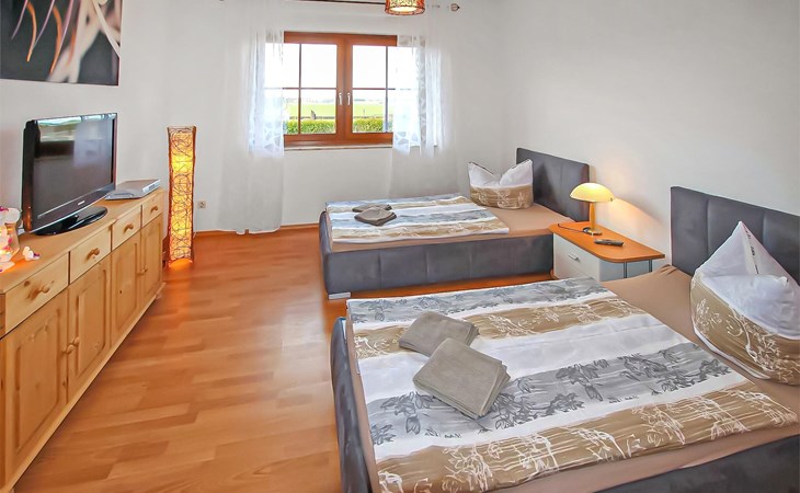 Het ca. 86 m² grote appartement voor maximaal 5 personen, voorzien van vloerverwarming en buitenzonwering, strekt zich uit over de gehele benedenverdieping en beschikt over een grote woonkamer (open haard incl. brandhout, slaapbank, eettafel, flatscreen TV, radio, CD-speler, DVD-Bluray speler) met open, moderne keuken (eethoek, elektrisch fornuis met oven, vaatwasser, magnetron, koelkast, vriezer, diverse kleine keukenapparaten), twee slaapkamers, twee badkamers, een apart toilet en een apart toilet. Er zijn twee slaapkamers (2 eenpersoonsbedden; kunnen ook worden samengevoegd, 1 x twee eenpersoonsbedden, beide met extra tv), een badkamer (douche, bad, wc, haardroger), een ruime hal en een groot, gemeubileerd terras met een prachtig uitzicht op het platteland.