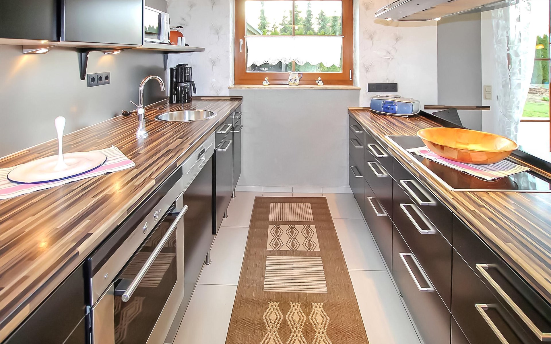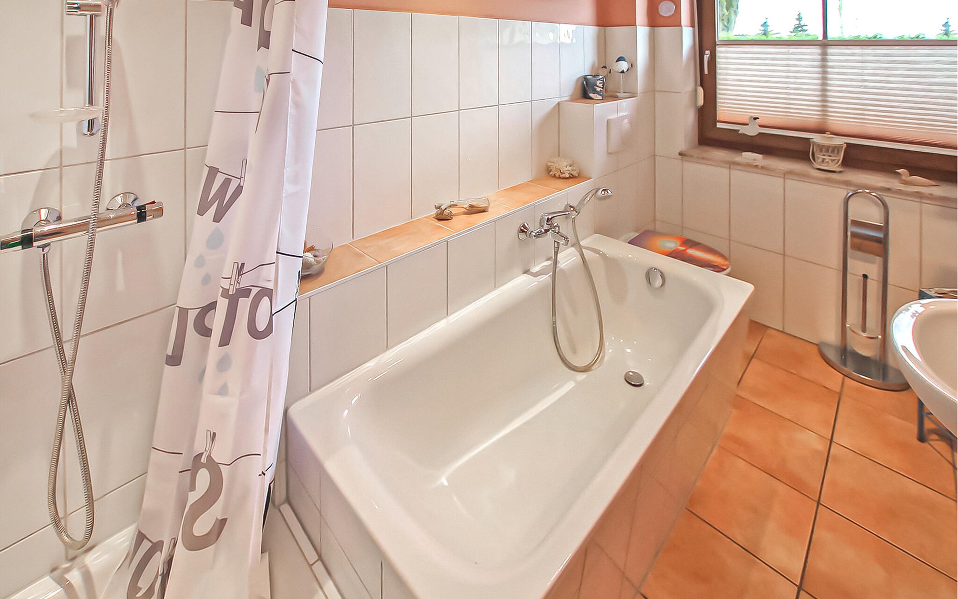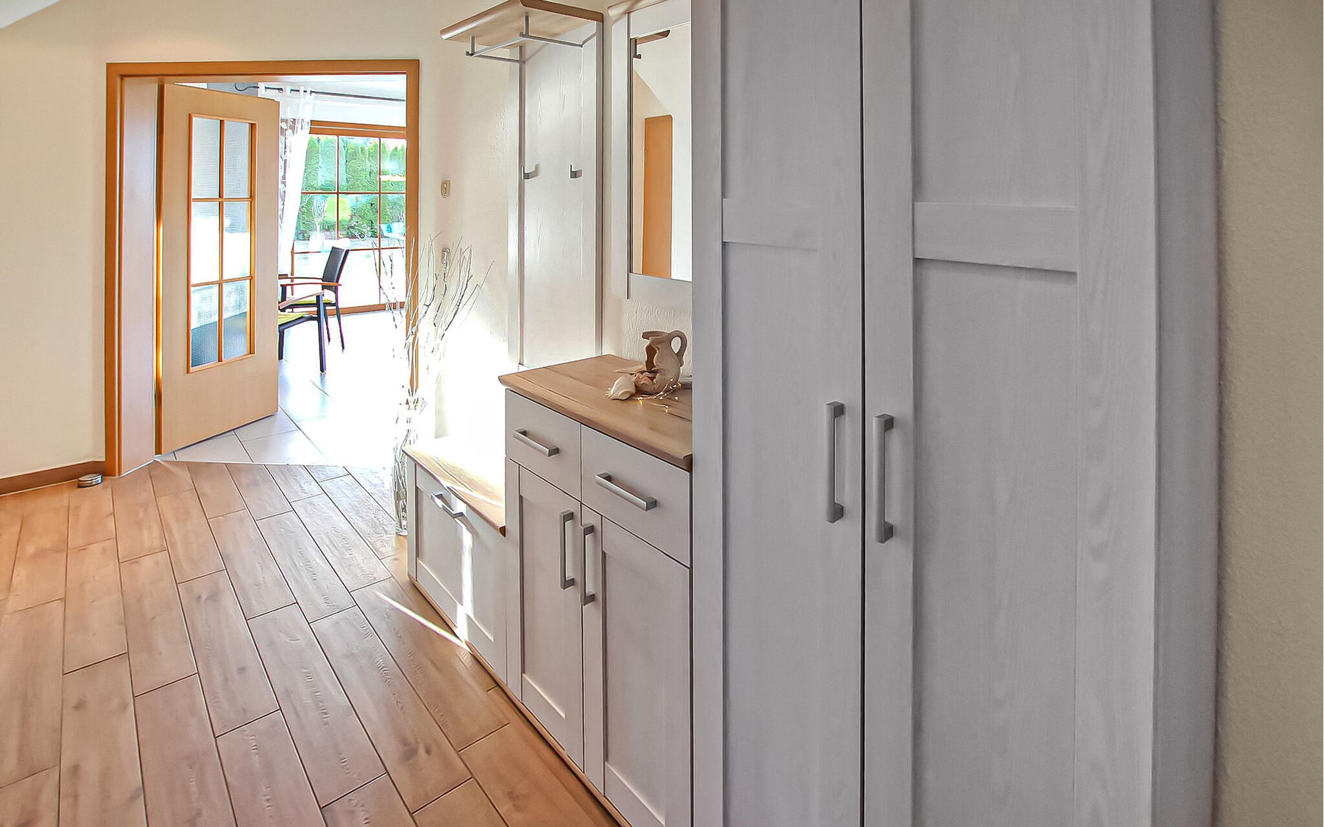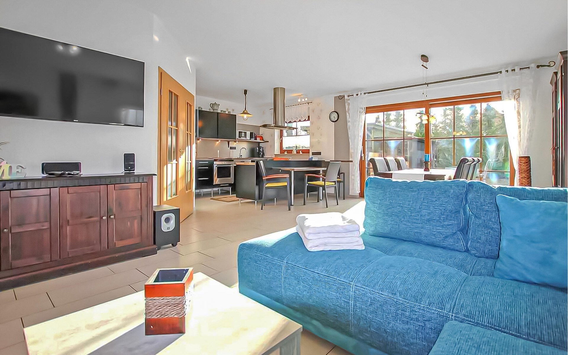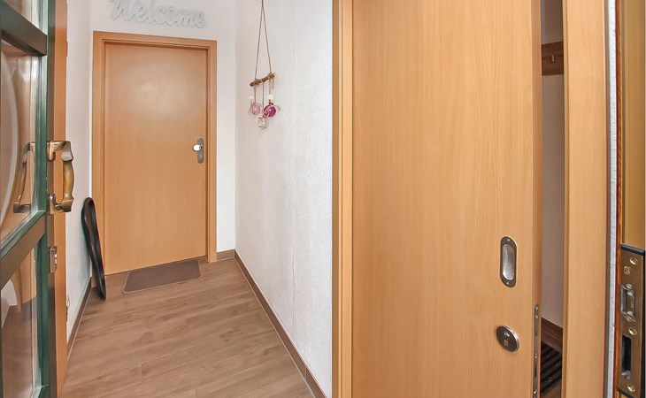Het ca. 86 m² grote appartement voor maximaal 5 personen, voorzien van vloerverwarming en buitenzonwering, strekt zich uit over de gehele benedenverdieping en beschikt over een grote woonkamer (open haard incl. brandhout, slaapbank, eettafel, flatscreen TV, radio, CD-speler, DVD-Bluray speler) met open, moderne keuken (eethoek, elektrisch fornuis met oven, vaatwasser, magnetron, koelkast, vriezer, diverse kleine keukenapparaten), twee slaapkamers, twee badkamers, een apart toilet en een apart toilet. Er zijn twee slaapkamers (2 eenpersoonsbedden; kunnen ook worden samengevoegd, 1 x twee eenpersoonsbedden, beide met extra tv), een badkamer (douche, bad, wc, haardroger), een ruime hal en een groot, gemeubileerd terras met een prachtig uitzicht op het platteland.