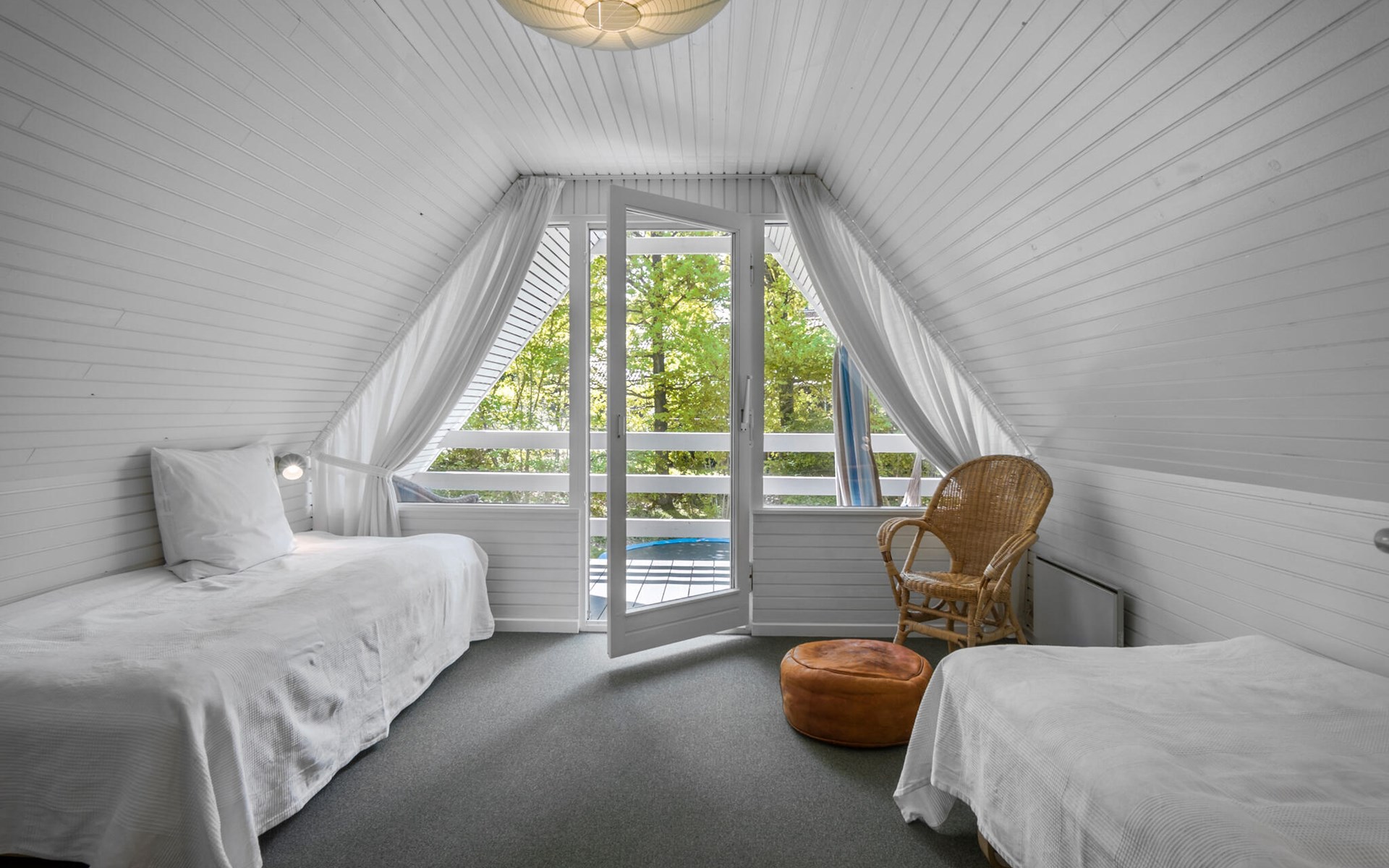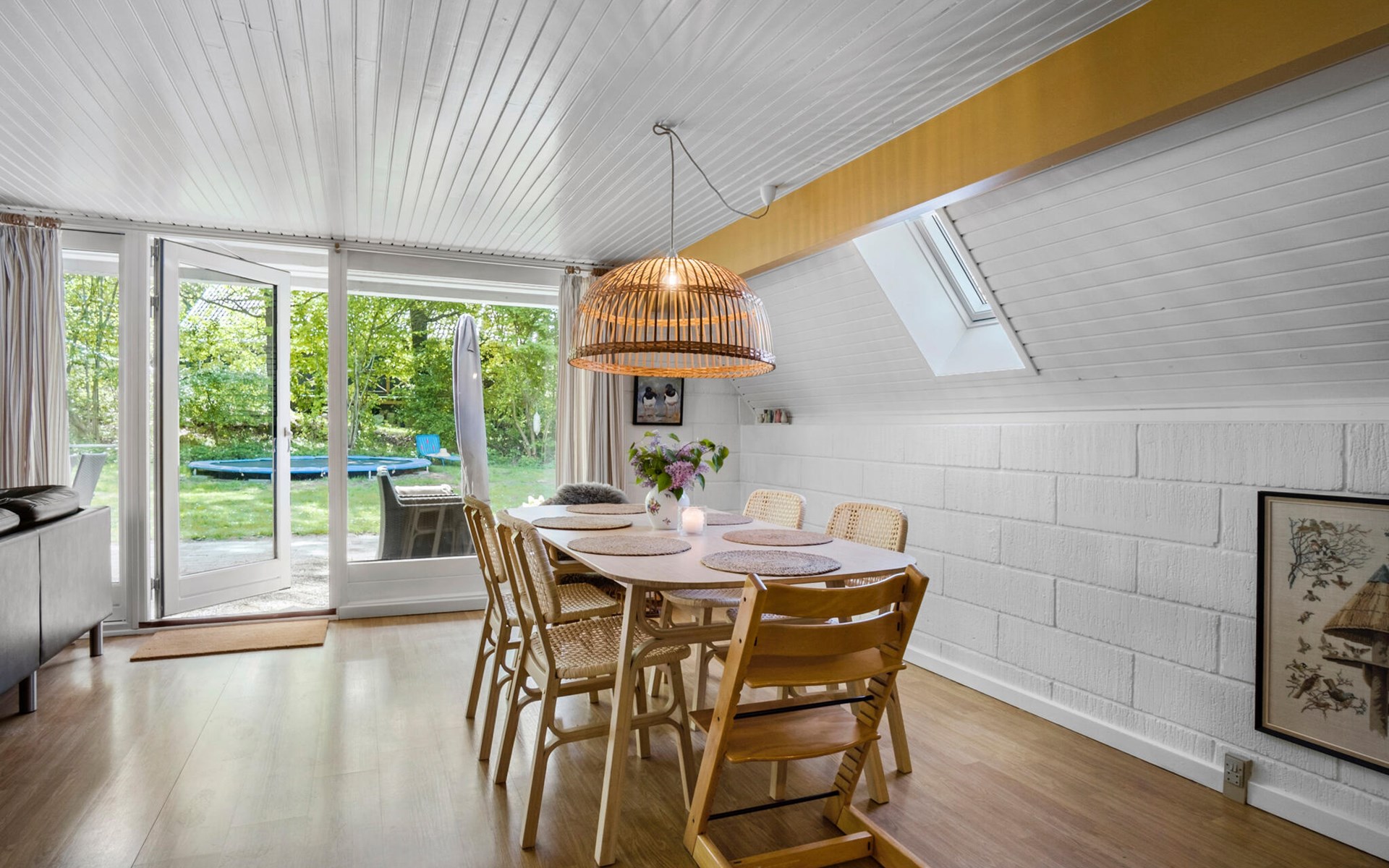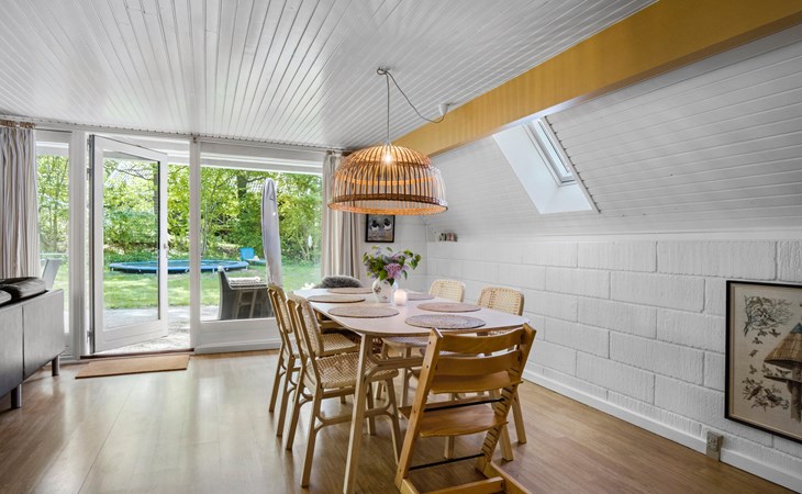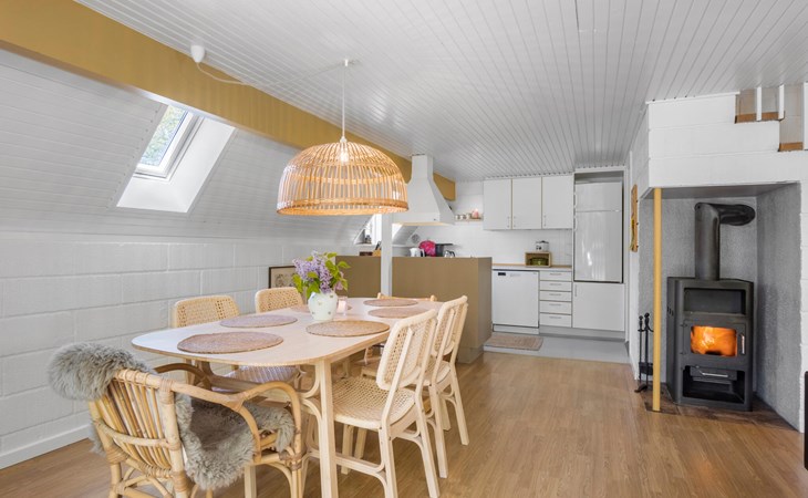 Welkom in je stijlvol gemoderniseerde vakantiehuis, dat een gezellige sfeer combineert met functioneel comfort en gelegen is op een groot natuurperceel in een rustige omgeving. Voel de nabijheid van de kust vanaf het eerste moment en laat het leven van alledag achter je. Stap binnen in de lichte, open woonkamer met houtkachel, comfortabele zithoek en directe toegang tot het terras. Kook samen in de praktische keuken en geniet van je maaltijden aan de aangrenzende eettafel. Er is ook een tv voor ontspannen avonden. Vanaf het bovenste balkon kun je genieten van een weids uitzicht op het groen.