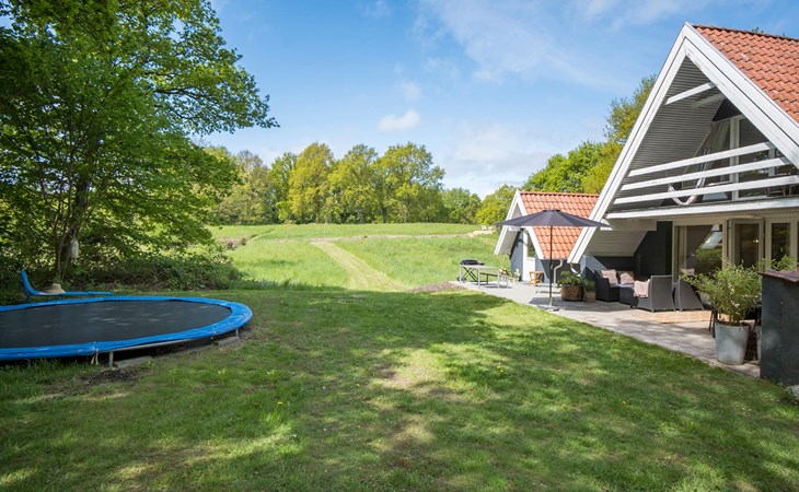Er zijn verschillende terrasgedeeltes rond het huis met loungemeubels, eettafel, ligstoelen en barbecue. Maak het jezelf gemakkelijk onder de overdekte veranda of ontspan op het gazon. Een trampoline houdt de jongste gasten bezig. Er zijn ook verschillende zithoeken met uitzicht op zee.