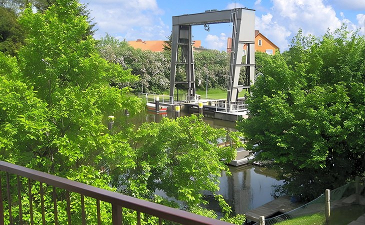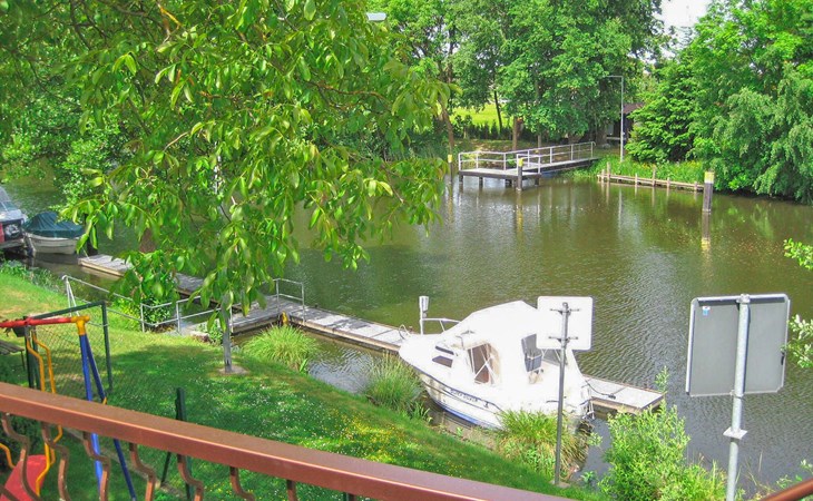De comfortabele vakantiewoning met eigen ingang bevindt zich op de bovenste verdieping van een woongebouwuitbreiding op een perceel aan het water direct aan het Müritz-Havelkanaal (geen eigen badzone). Het is uitgerust met een woongedeelte (gestoffeerde meubels, LCD TV, hifi, DVD), een open keuken (elektrisch fornuis, koelkast, magnetron, eettafel, diverse keukenapparatuur), een slaapkamer (tweepersoonsbed), een kinderslaapkamer (stapelbed) evenals douche/WC en centrale verwarming. Er is een gemeubileerd terras, een vissteiger en een barbecueplaats. De gastheer heeft een winkel met scheepsbenodigdheden en bootverhuur op het terrein. Verschillende motorboten (met en zonder vaarbewijs) kunnen op afspraak worden gehuurd. Als huurder van het appartement krijg je 20% korting op de boten voor de eerste 7 nachten en 25% korting voor de volgende 7 nachten.