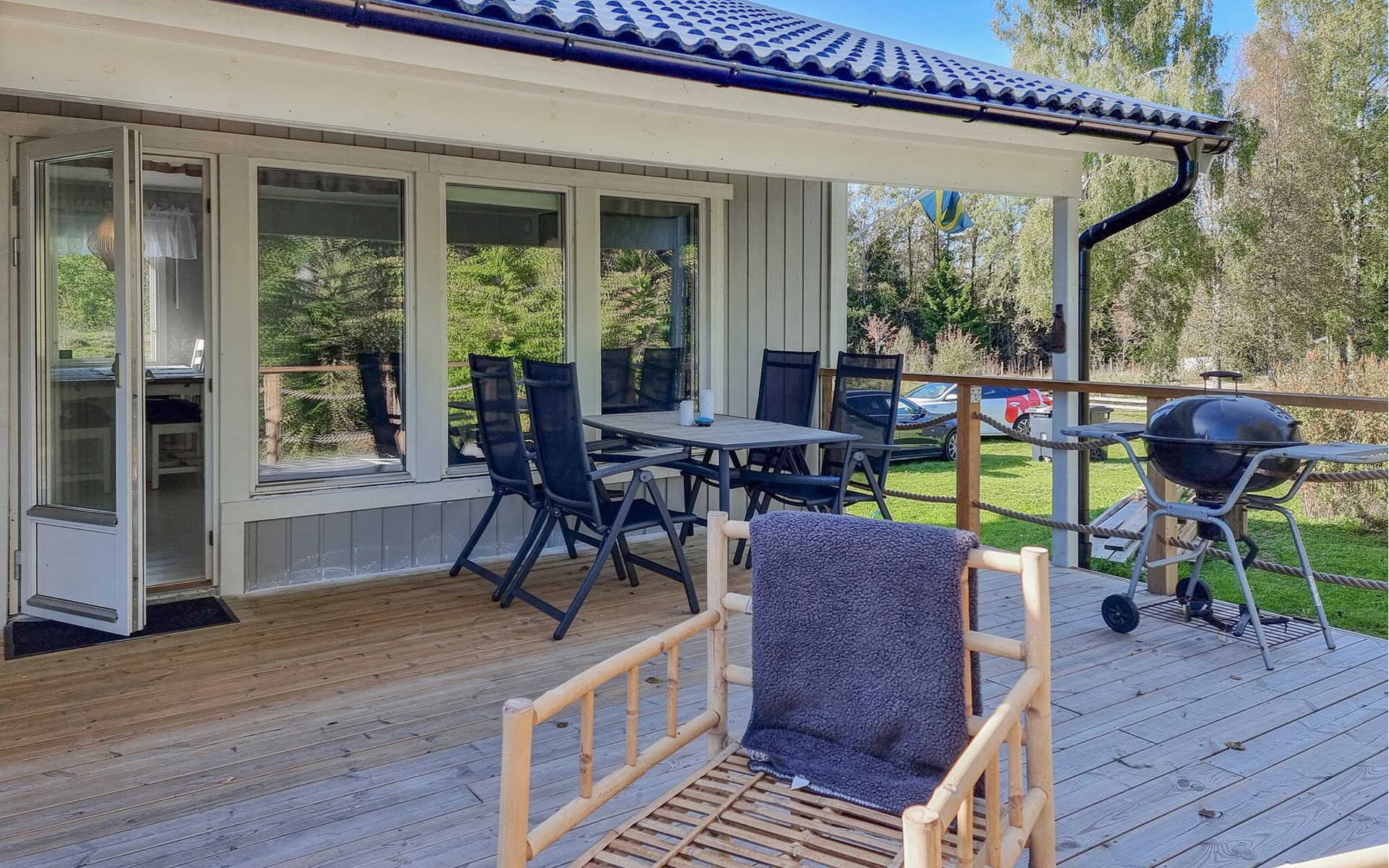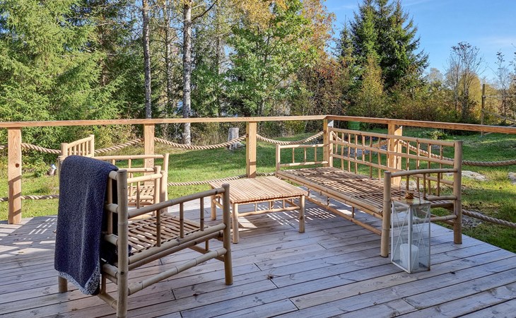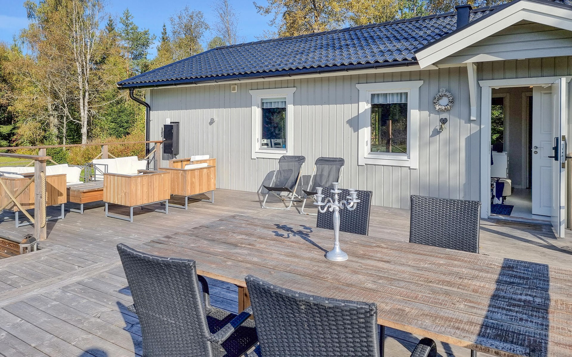 Geniet van het uitzicht op het meer en de ontspannende uren op het houten terras van dit mooie vakantiehuis.
