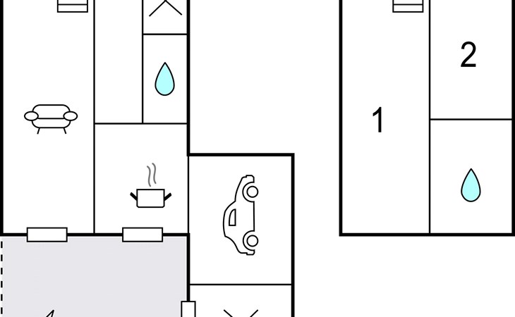Op de begane grond van het huis bevinden zich de keuken, de woon- en eetkamer en de badkamer met douche en toilet. Een houten wenteltrap leidt naar de bovenverdieping met een doorgangskamer met daarin een queensize bed van 140 cm breed. Van hieruit komt u in de slaapkamer met een tweepersoonsbed van 160 breed en de eigen badkamer met vloerverwarming, die voorzien is van een toilet en ligbad.