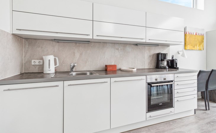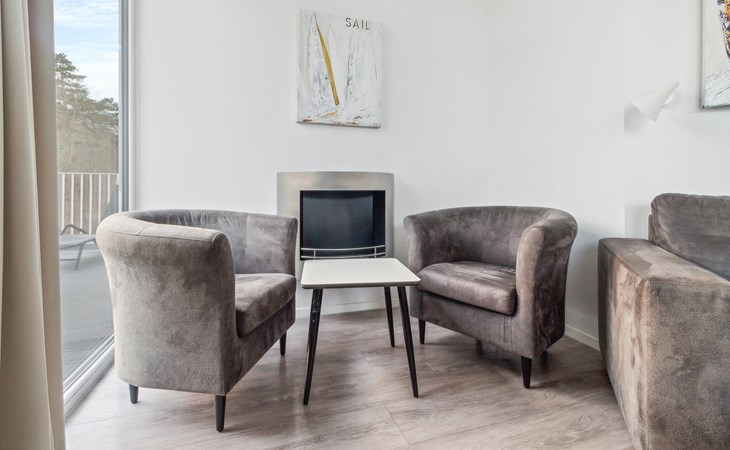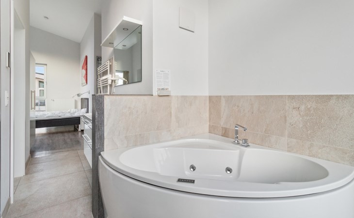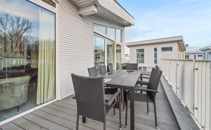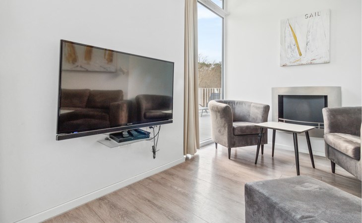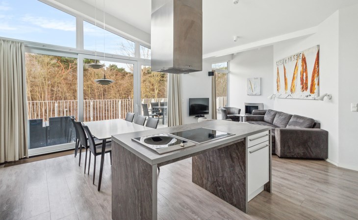 Het hoogtepunt van het penthouse is het ruime dakterras van 42 vierkante meter, dat een heerlijke plek in de zon biedt. Hier kun je samen genieten van maaltijden of gewoon ontspannen. Twee ligstoelen en extra tuinmeubilair staan tot je beschikking. De drie slaapkamers hebben elk een ruim tweepersoonsbed. Er is ook een slaapbank voor nog twee personen in het woongedeelte. Een van de slaapkamers leidt direct naar de badkamer. Hier kun je genieten van het unieke uitzicht vanuit de whirlpool of de dubbele regendouche. De privésauna in de tweede badkamer is de perfecte plek om te ontspannen. De bio-ethanol open haard baadt de woonkamer in een gezellig licht.