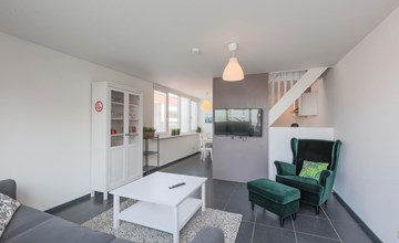 Voor de ingang van het vakantieappartement zijn voldoende gratis parkeerplaatsen beschikbaar om uw auto gedurende het hele vakantieverblijf te laten staan. Een metalen trap leidt u naar een zolder die dient als toegang tot 4 naast elkaar gelegen vakantieappartementen. Het achterste appartement is Appartement West. Twee treden omhoog, nog een paar stappen en u staat op uw terras en voor de ingang.