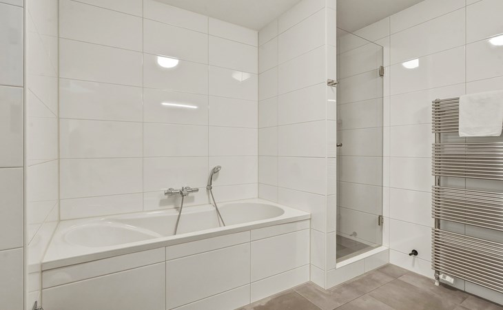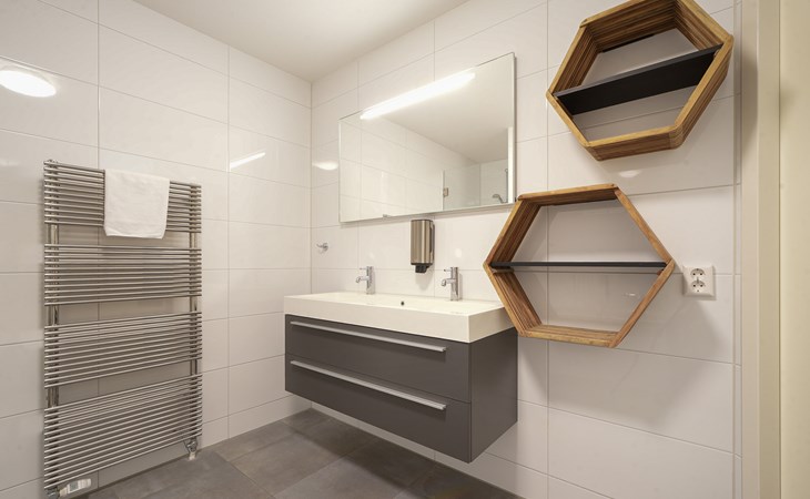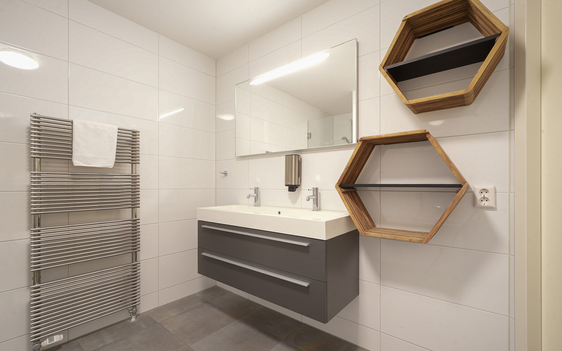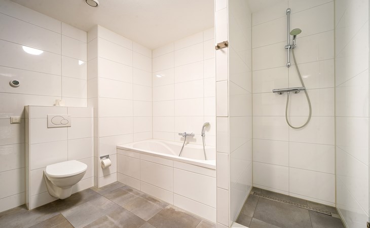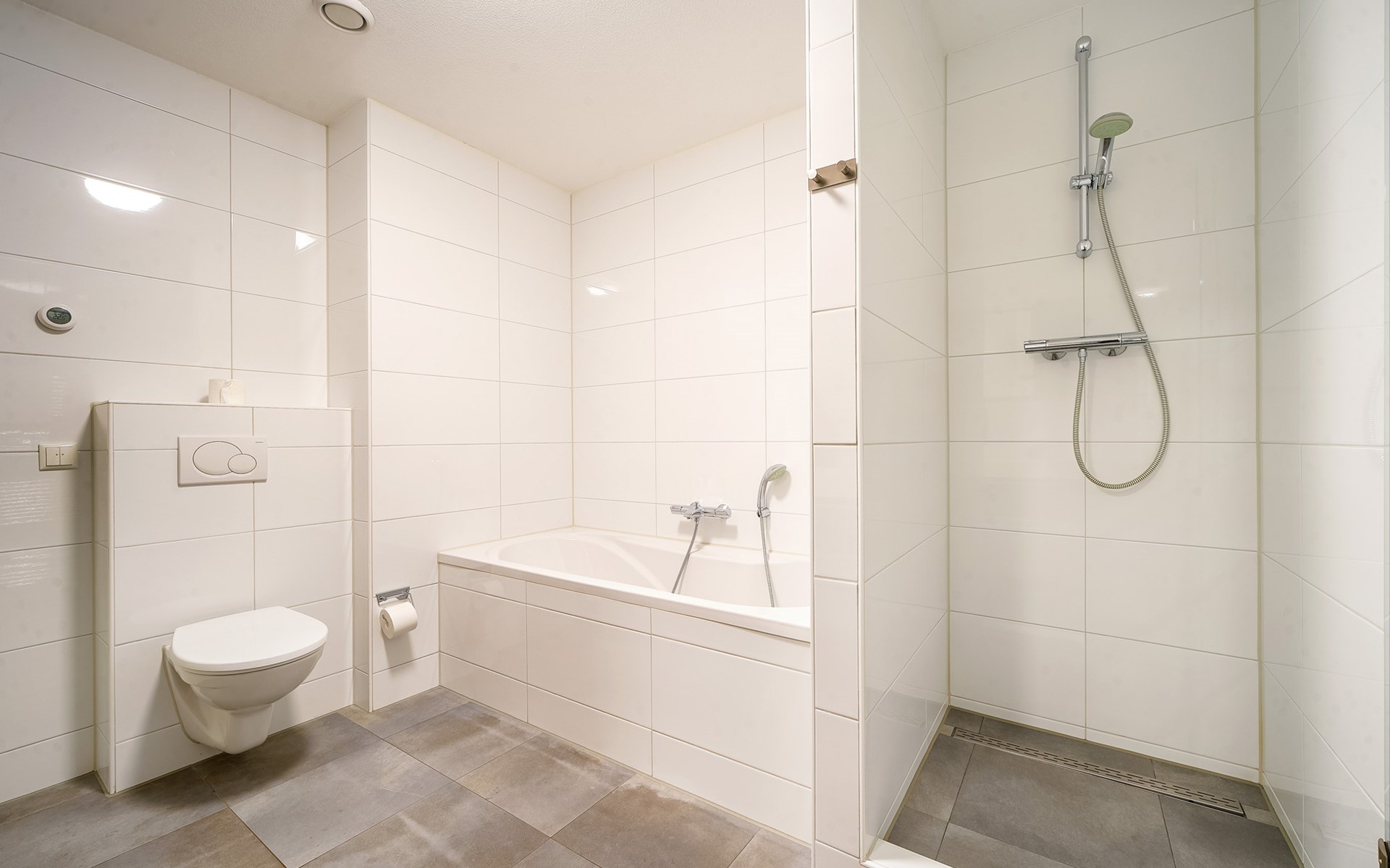 . Badkamer met dubbele wastafel, ligbad, separate douche en toilet