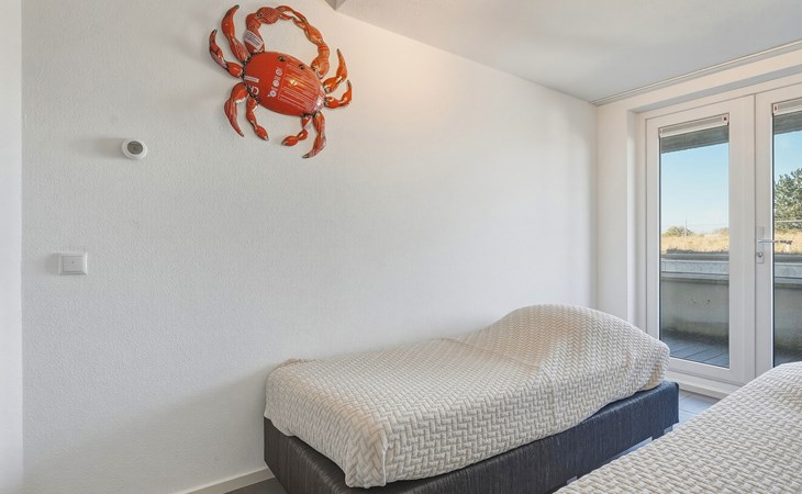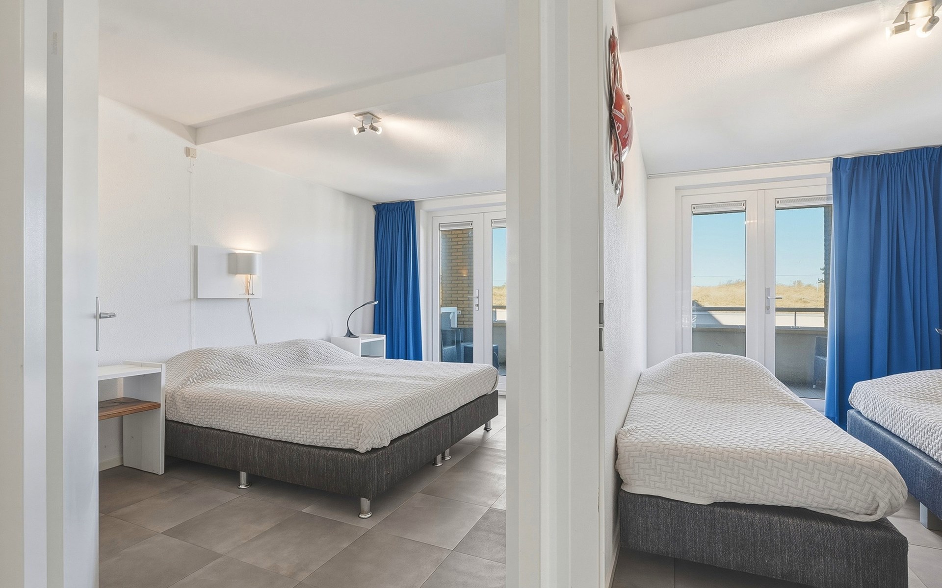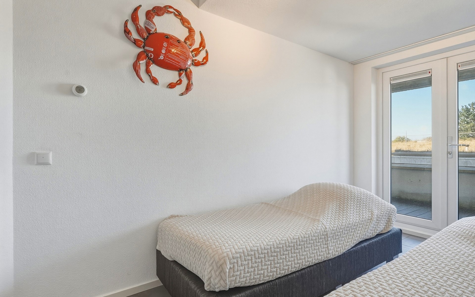 . Slaapkamer met twee één-persoons boxsprings, openslaande deuren naar balkon.