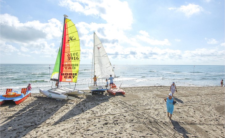 U kunt het prachtige zandstrand bereiken via het centrale pad dat daarheen leidt vanaf het zwembad. Breng uw familietijd door met zwemmen, spelen en ontspannen. U kunt ook de zee verkennen met zeilboten, catamaran en waterfietsen die bij het strand worden aangeboden.