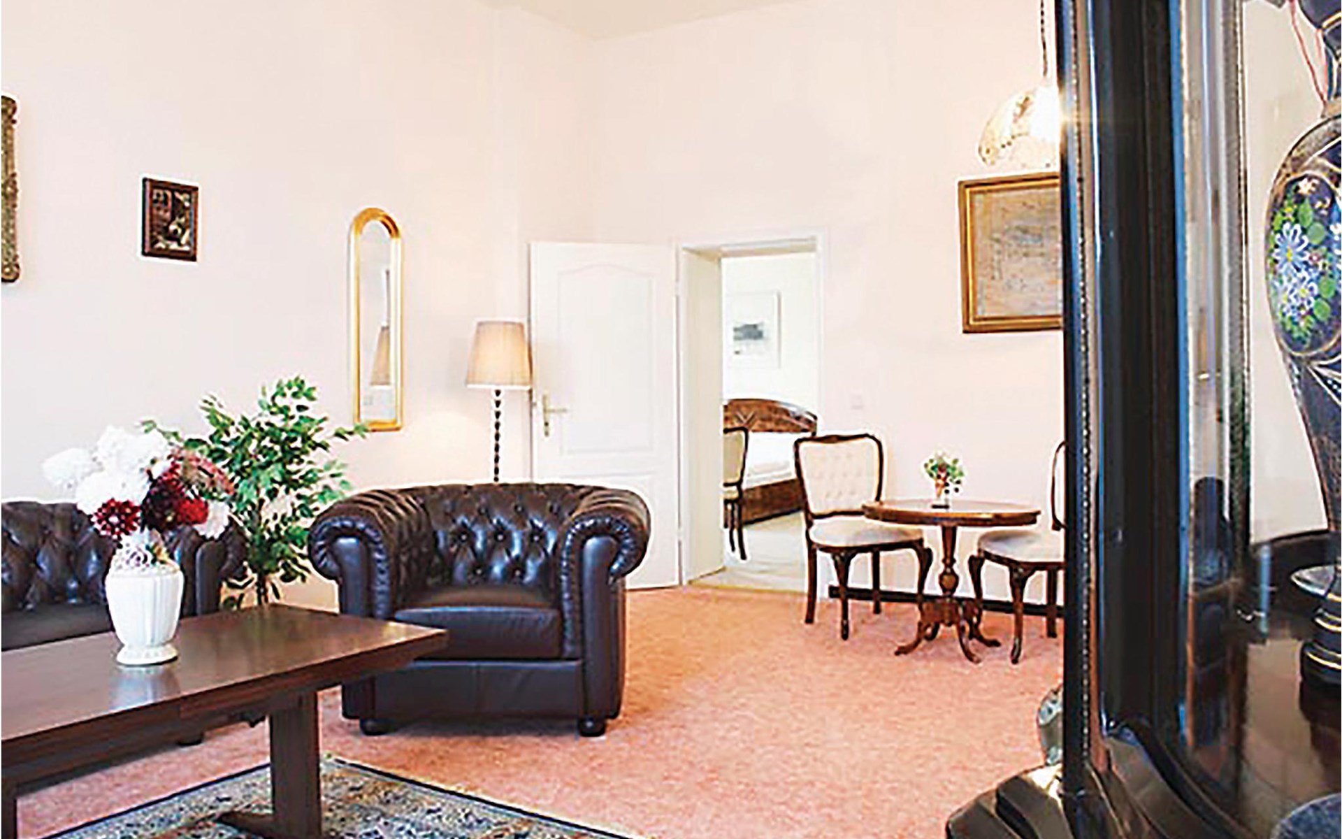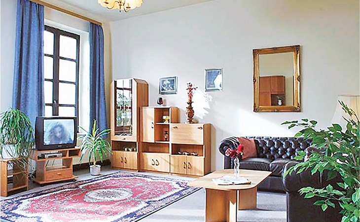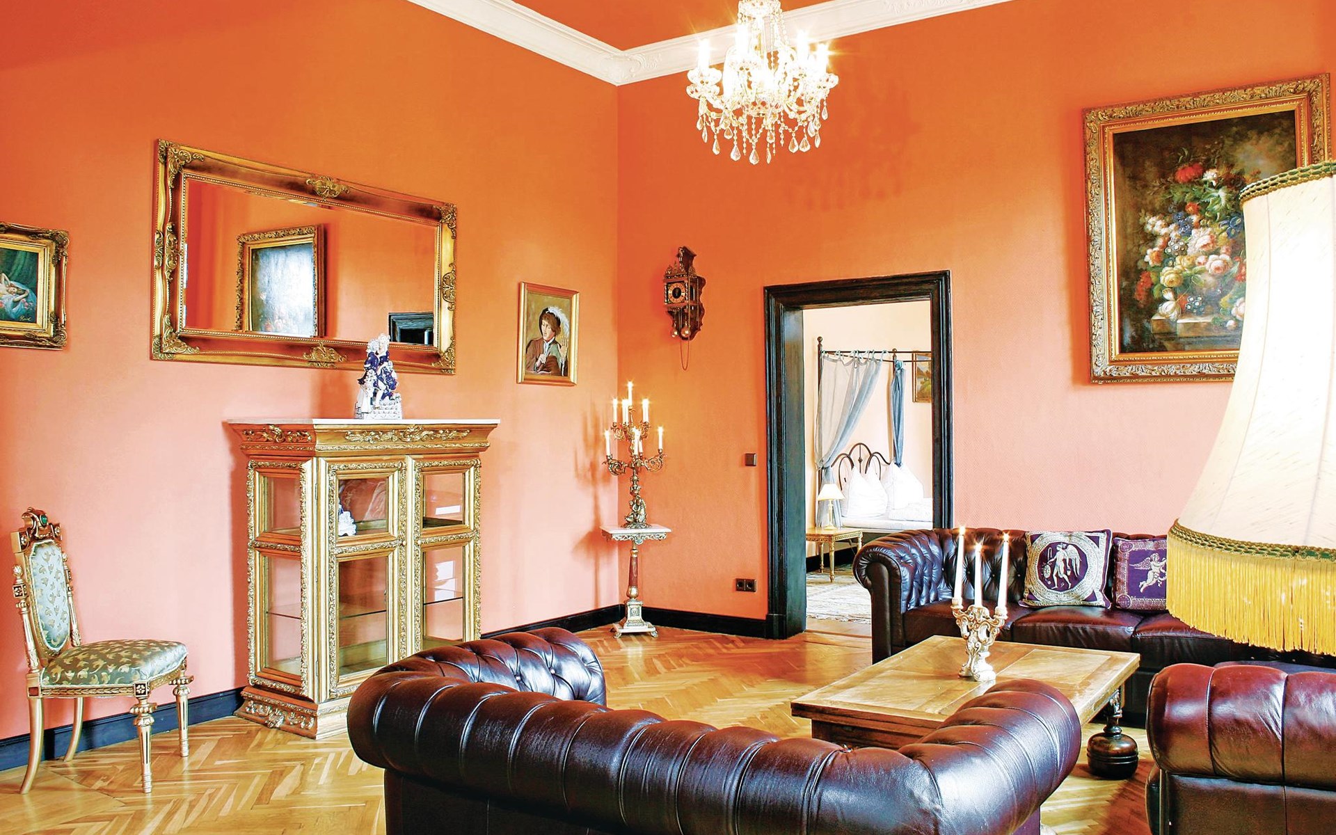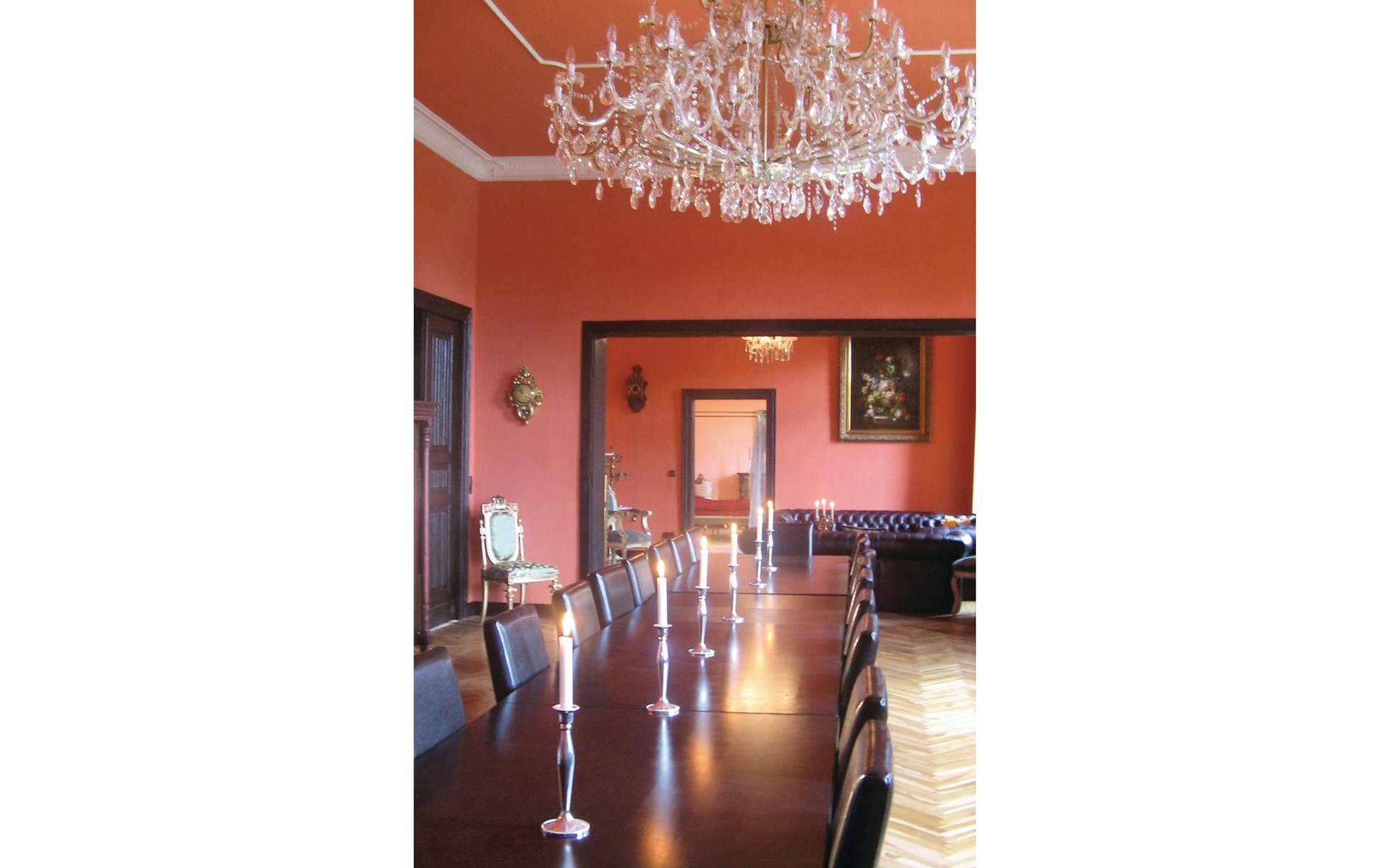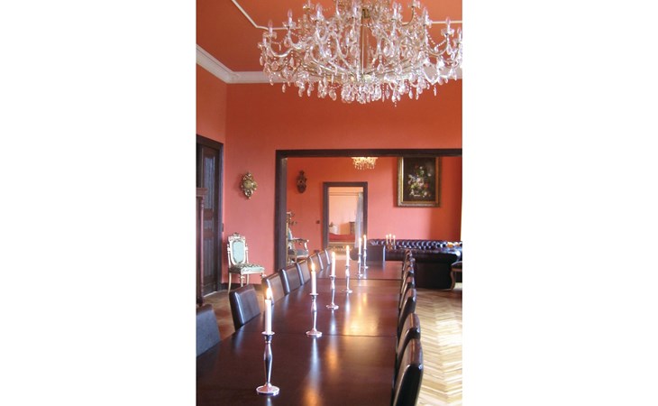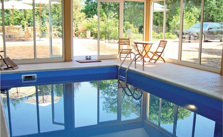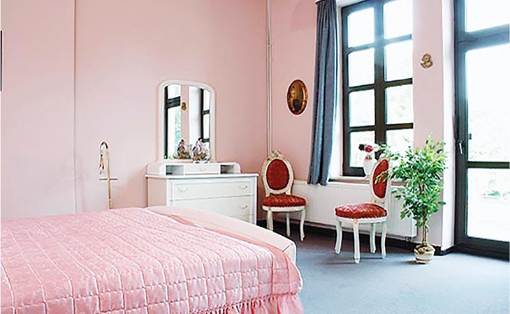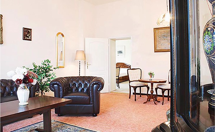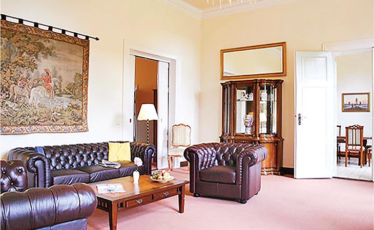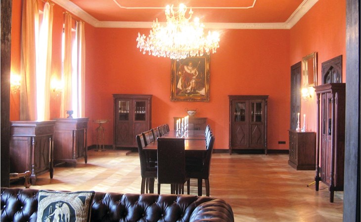 Het terras en balkon van het kasteel kijken uit over een meertje. Tot 20 personen kunnen worden ondergebracht in 7 gezellig ingerichte appartementen, elk met een eigen keuken of kitchenette. Het kasteel is daarom ideaal voor groepsreizen of vakanties met een groot gezin. Er is een grote eetzaal op de benedenverdieping, die gebruikt kan worden voor feesten of vergaderingen. In de kelder is een sauna, solarium en fitnessruimte. Er is ook een biljartkamer, een groot overdekt terras en een verwarmd/overdekt zwembad van 32 m² op het terrein. Hier kun je genieten van je vakantie met de hele familie.