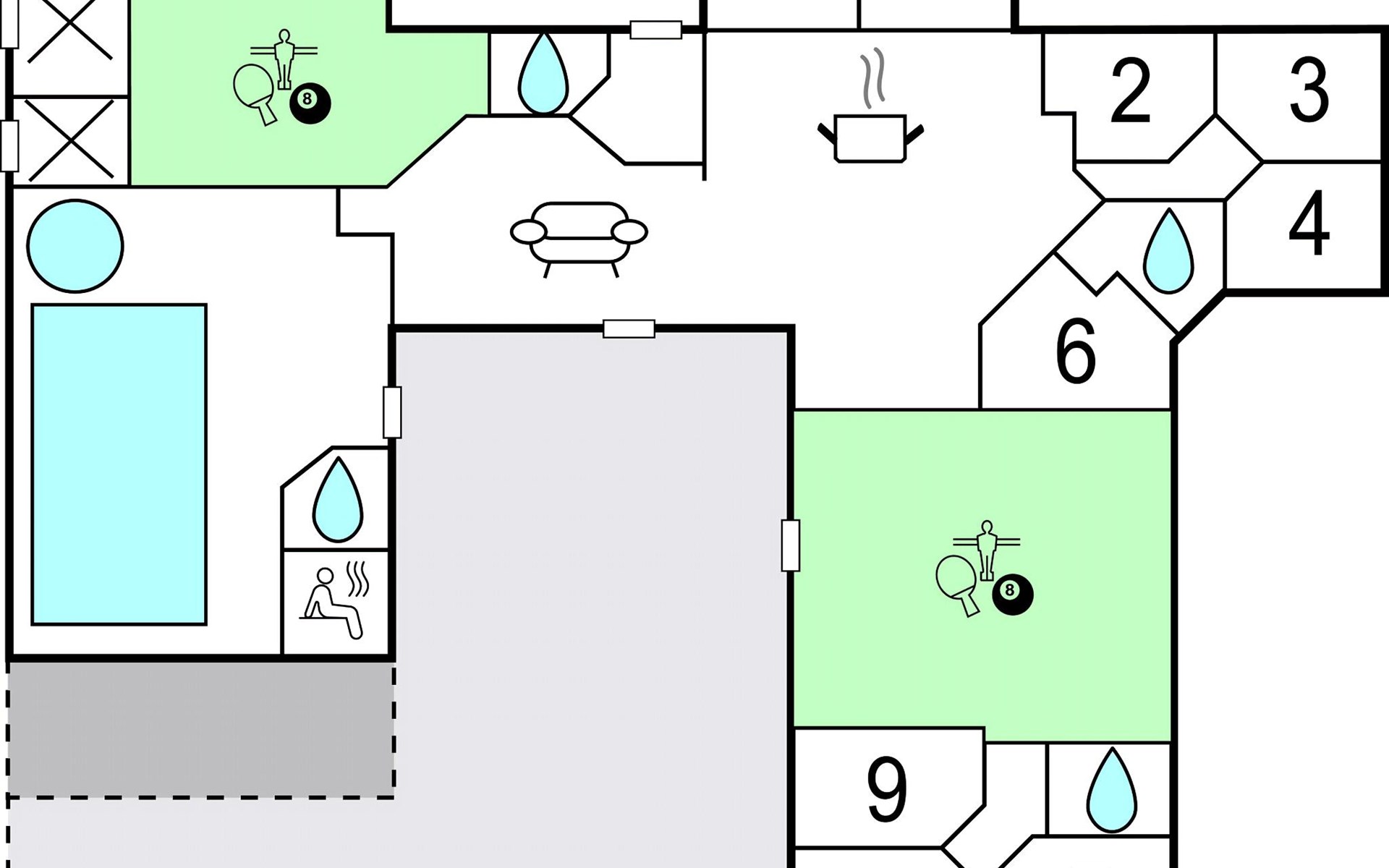 Als u op zoek bent naar een ruim vakantiehuis, dan heeft u hier de juiste gevonden. Hier voelt u zich op elk moment van het jaar thuis. Bijvoorbeeld zwemmen in het zwembad of ontspannen in de whirlpool en sauna. De woonkamer/keuken is groot genoeg om met z'n allen maaltijden te bereiden en in de comfortabele meubels te kletsen en tv te kijken. U kunt actief zijn met biljart, darts en tafeltennis. En buiten kunt u ontspannen en opladen op verschillende terrassen en een balletje slaan op het gazon.