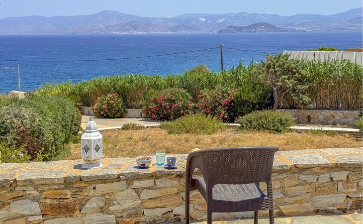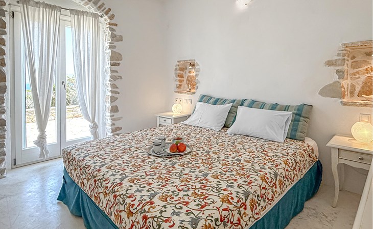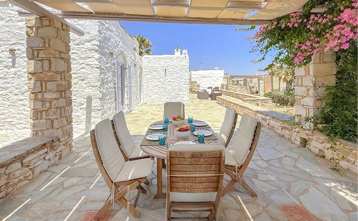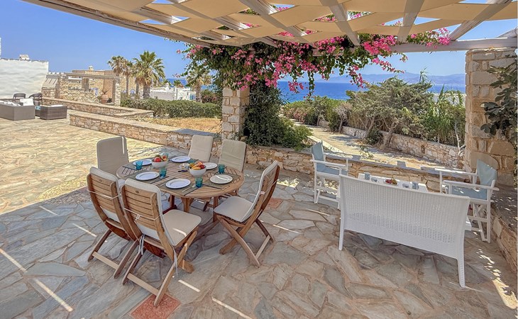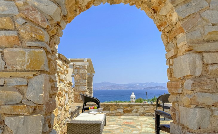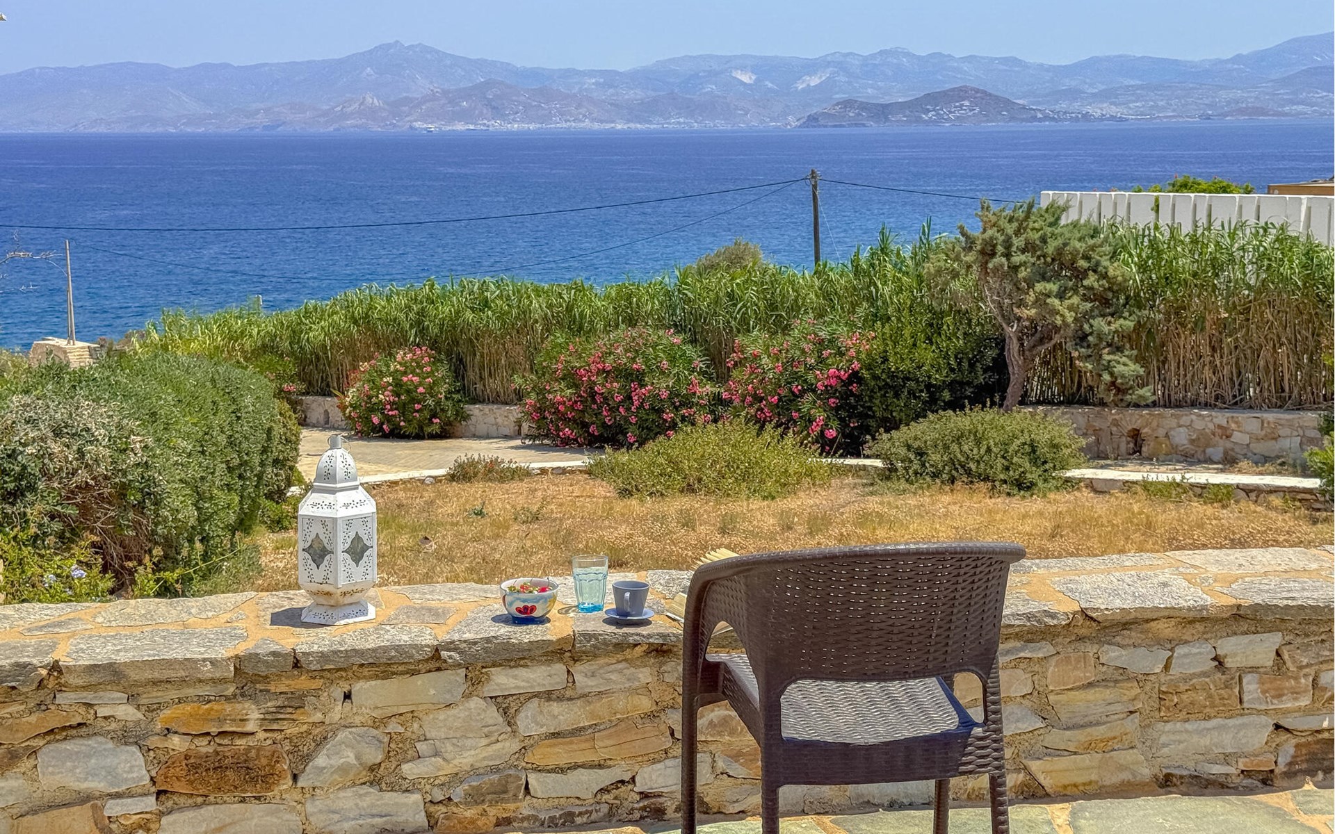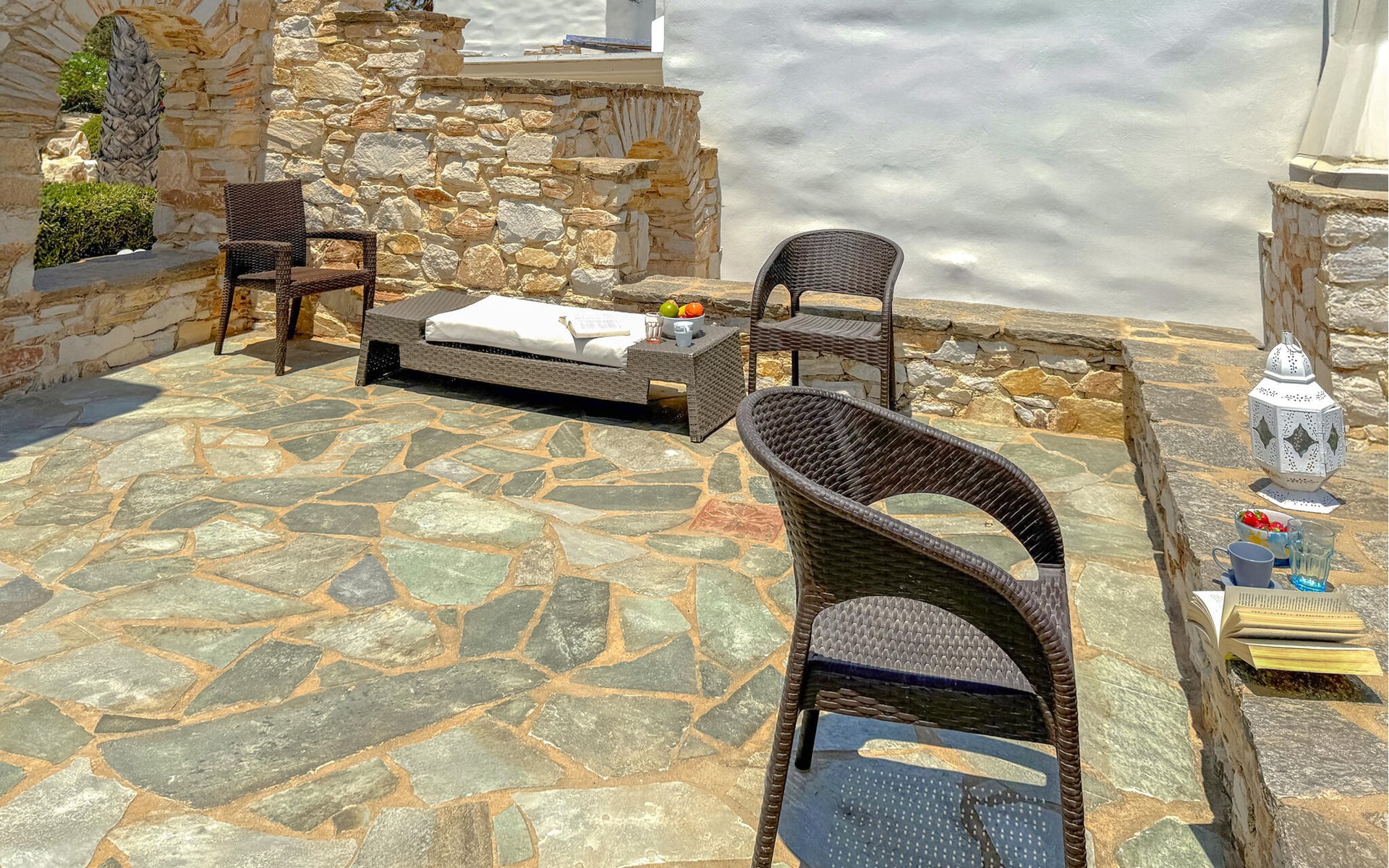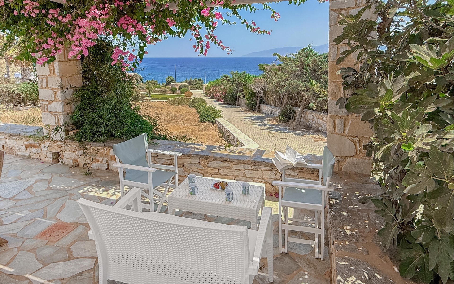 In de buitenruimte, versierd met bougainville, wachten charmante natuurstenen terrassen op je. Serveer je ontbijt in de schaduw en laat je blik afdwalen over de uitgestrekte zee. Maak het jezelf gemakkelijk op de ligstoelen en loungemeubels en klets tot in de warme zomeravond met een glas wijn.