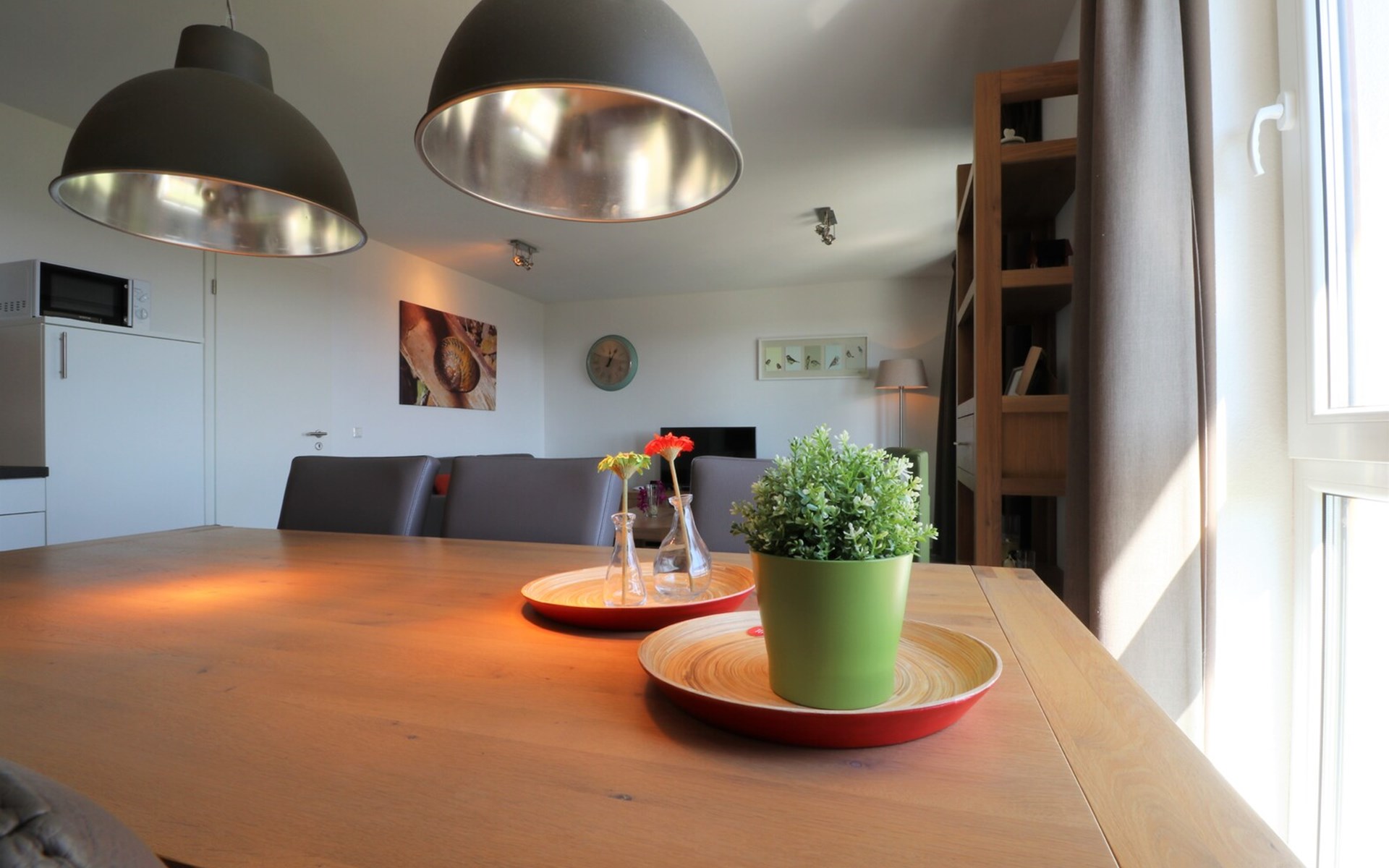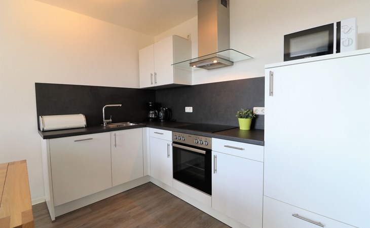 Deze woning op de eerste verdieping heeft een sfeervolle woonkamer met open keuken. De ruime en gezellige zithoek geeft toegang tot het overdekte balkon vanwaar u van het prachtige uitzicht kunt genieten. De open keuken is voorzien van alle moderne gemakken en biedt een ruime eethoek. De eerste slaapkamer beschikt over een 2-persoons boxspringbed en de tweede slaapkamer beschikt over een 1-persoons boxspringbed en een stapelbed.Beide slaapkamers hebben voldoende kastruimte. De ruime badkamer is voorzien van inloopdouche. Er is ook nog een gastentoilet. Bij de entree is een extra berging.