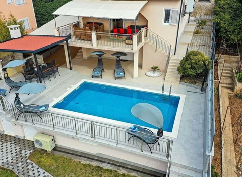 Ben je op zoek naar een villa bij de zee in het mooie Dalmatië met een privé zwembad? Villa Palmarosa geeft je precies wat je zoekt! Het ligt vlakbij de stad Zadar in Sukosan, op slechts 4 km van de zee. Drie gebouwen zijn verbonden in Villa Palmarosa en bieden ruimte voor in totaal 12 personen in zes slaapkamers in een prachtige moderne omgeving. Drink je ochtendkoffie op een van de vier terrassen met een prachtig uitzicht en begin je ochtend met de eerste zonnestralen. De villa heeft drie onderling verbonden gebouwen, elk met een volledig uitgeruste keuken, eetkamer, woonkamer, twee slaapkamers en een badkamer. De villa heeft drie aparte terrassen en een groot terras op de bovenste verdieping waar je samen kunt barbecueën en dineren met familie en vrienden. Er is ook een speelkamer met darts, tafelvoetbal en 2 basketbal hoepels. In de villa vind je ook een infraroodsauna voor 2 personen (met toeslag). Voor de jongste gasten biedt de villa een glijbaan en schommels, minivoetbal en darts voor kinderen. Geniet van het prachtige uitzicht op het terras. Als je jezelf wilt verfrissen, neem dan een duik in het privézwembad. Ontspan in de idyllische omgeving van Villa Palmarosa en beleef een onvergetelijke vakantie in Dalmatië met al zijn schoonheden.