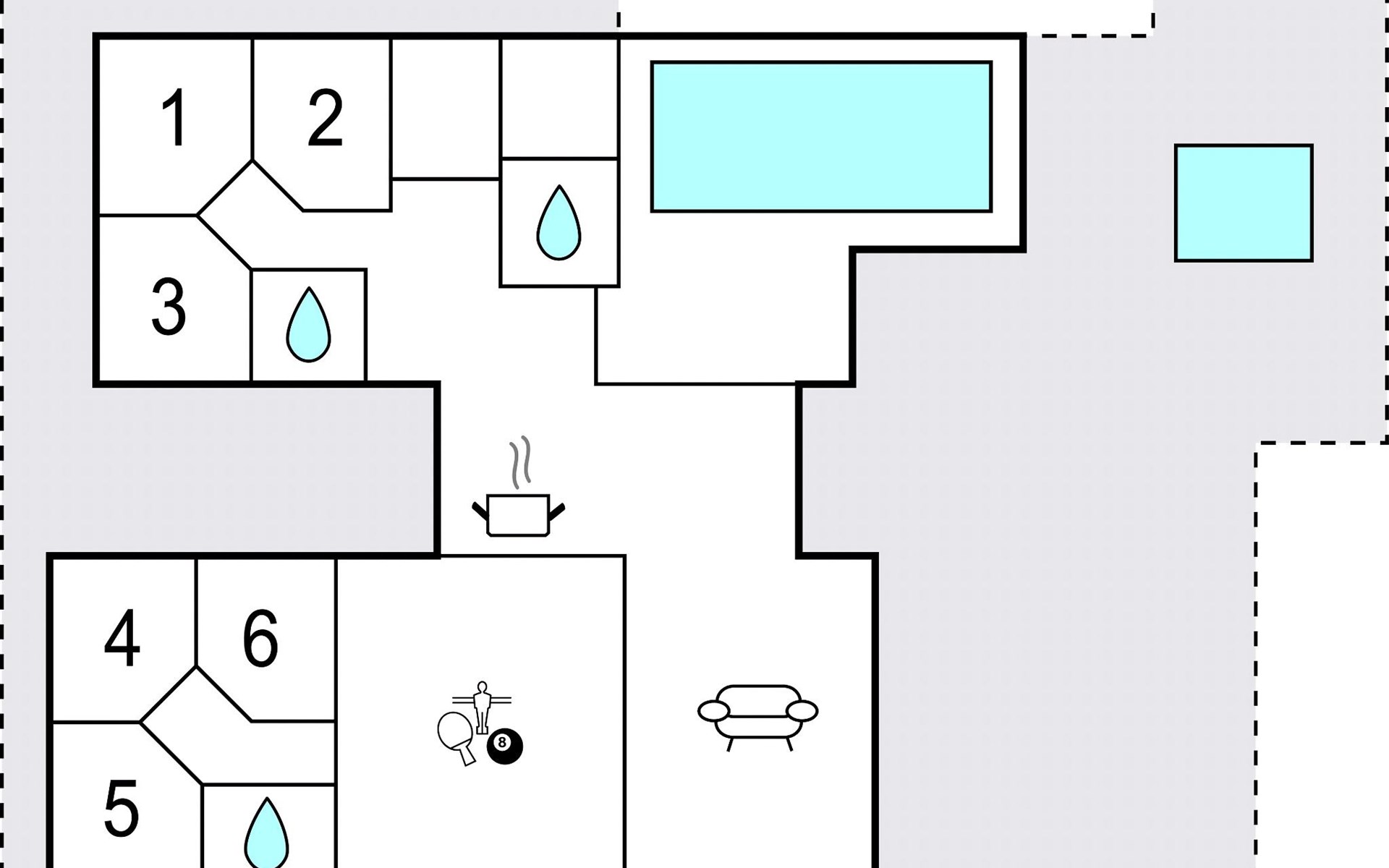 Binnen vind je een activiteitenruimte die het hart van elke spelletjesliefhebber sneller doet kloppen. Daag de familie uit voor een leuk spelletje biljart, tafelvoetbal, tafeltennis of darts. In de woonkamer kun je ontspannen op de bank, een film kijken of de tijd verdrijven met de spelconsole en gezellige uurtjes doorbrengen. De open en ruime eetkeuken verwelkomt alle vakantiegasten. Het is niet alleen een plek waar je lekker kunt koken, maar het wordt ook een sociaal trefpunt tijdens je vakantie.