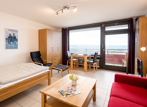 Eenkamerwoning, 45 vierkante meter voor 2-3 personen. Nieuw gerenoveerd in 2014, met gecombineerde woon-/slaapkamer (tweepersoonsbed, extra bed voor gasten, zithoek, TV/radio), open keukenhoek (elektrische kookplaat, koelkast met vriesvak, magnetron, diverse keukenapparatuur), douche/toilet.