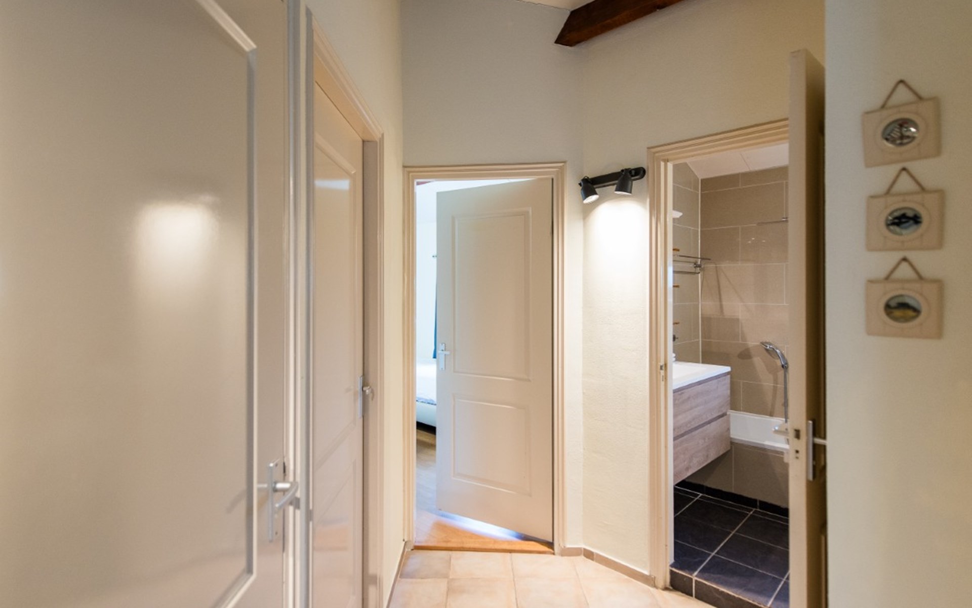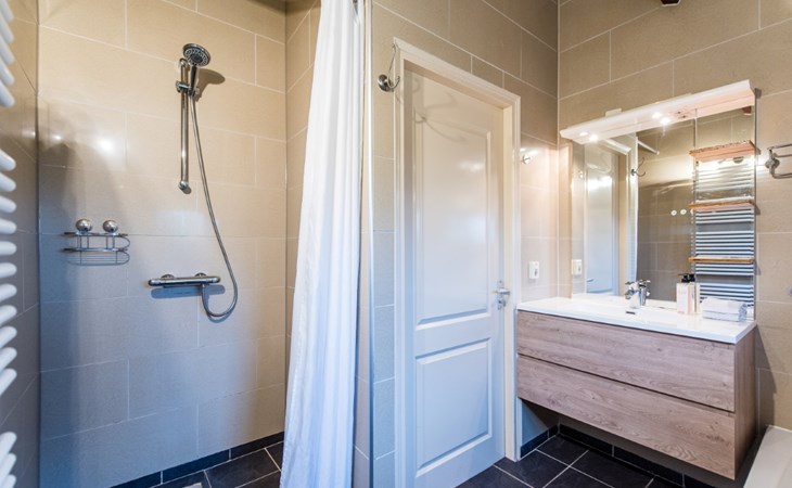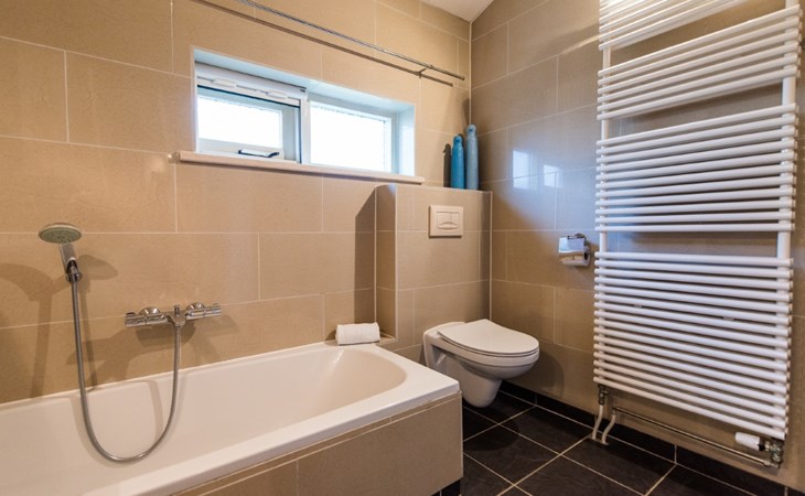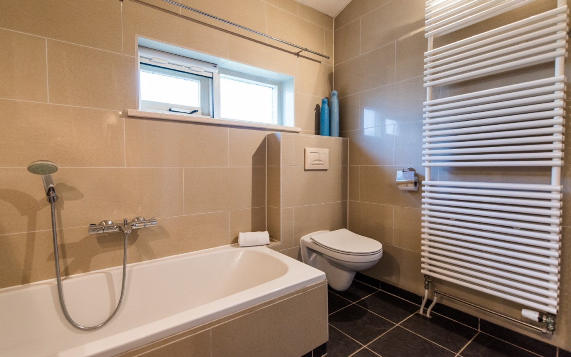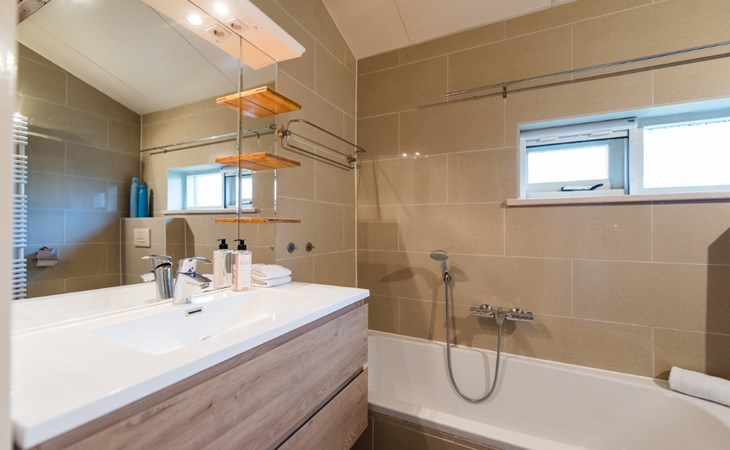 De badkamer heeft een klein buitenraam. Er is een douche en ligbad. Naast het toilet in de badkamer is er een separaat gastentoilet in de hal.
