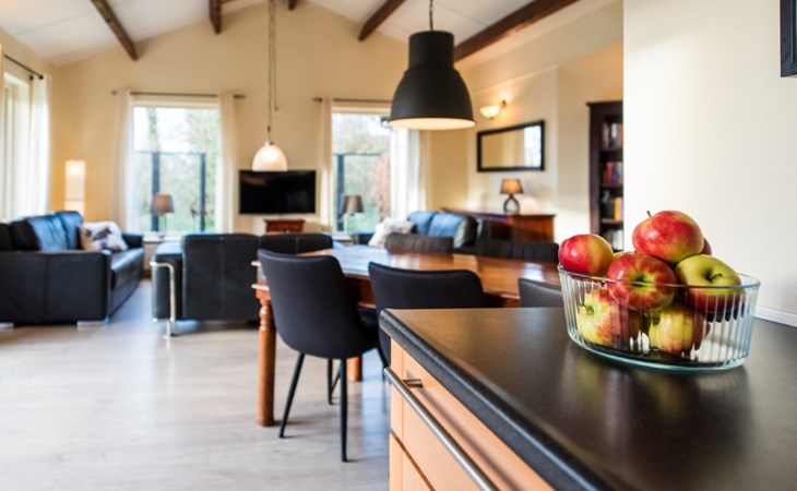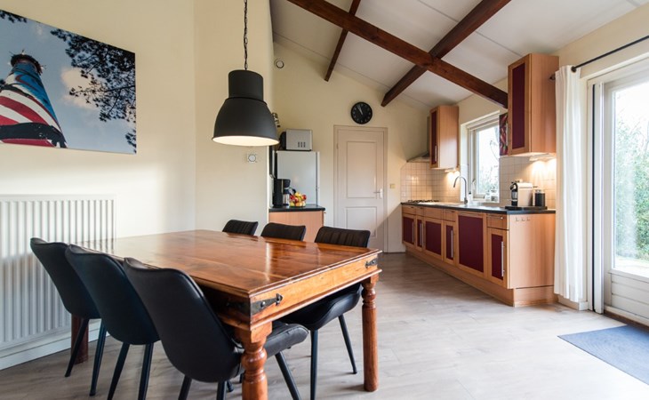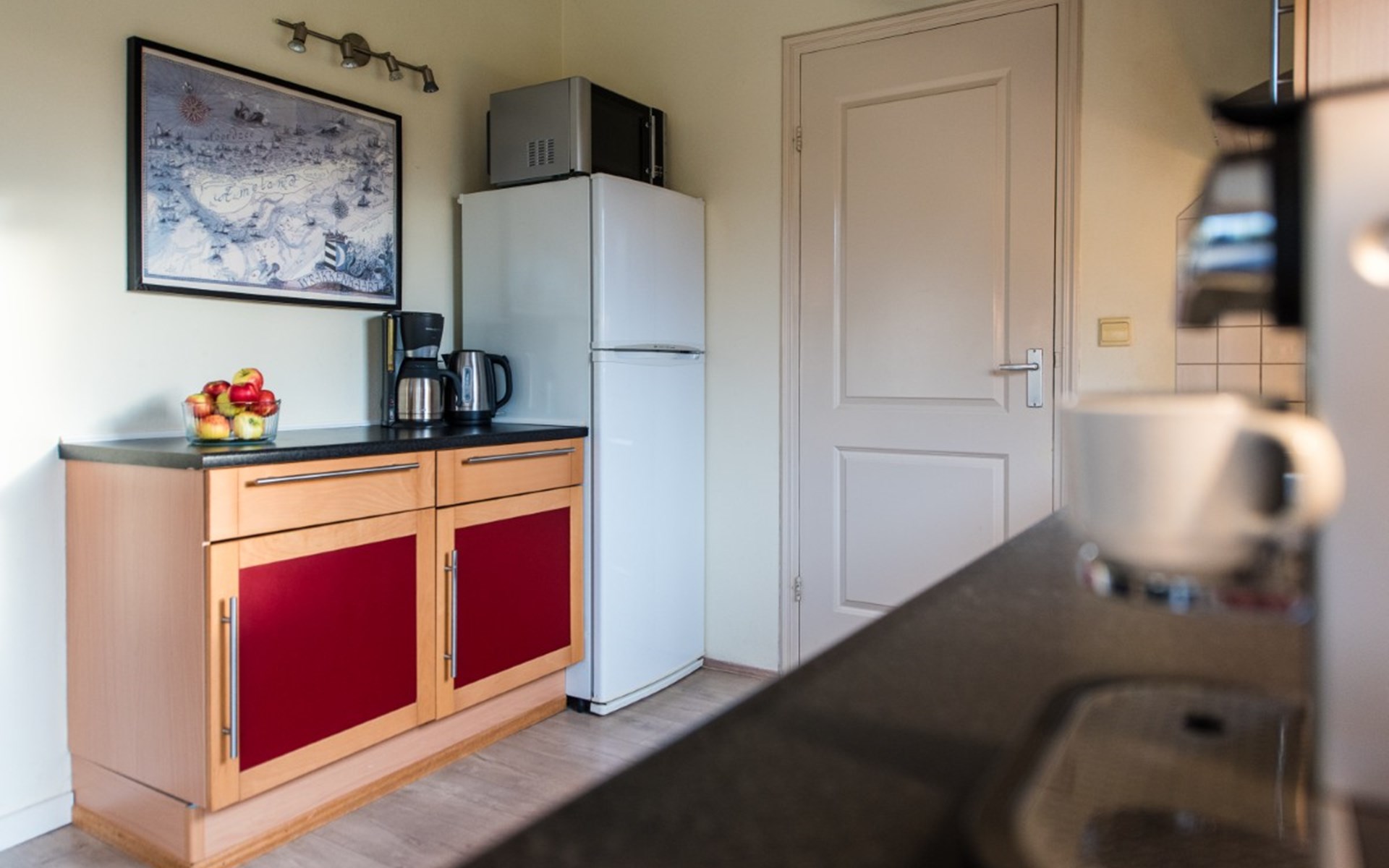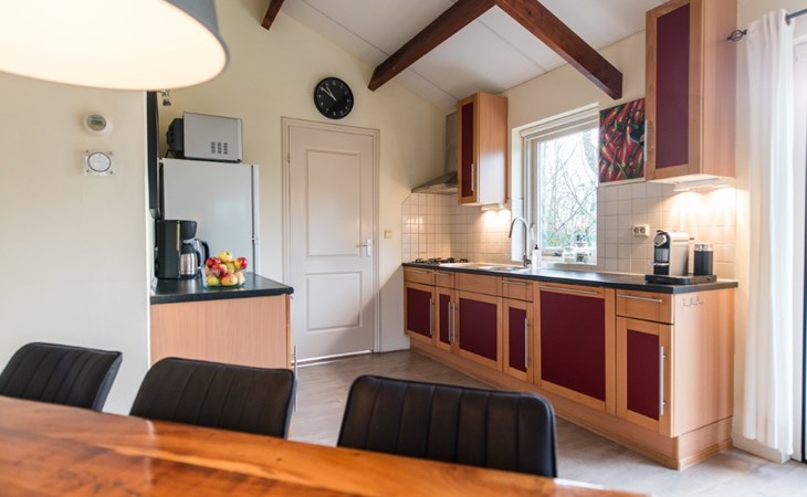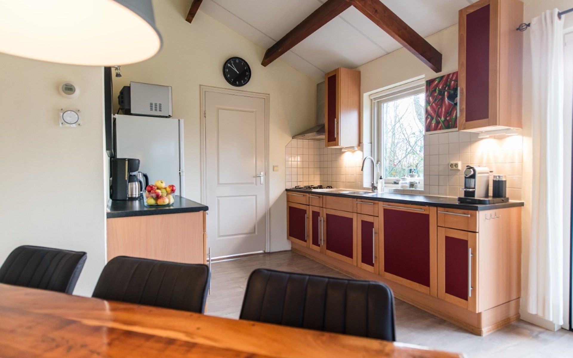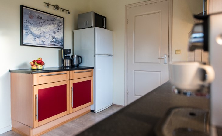 De open keuken is voorzien van: koelkast met vriesvak, vaatwasser, koffiezetapparaat, keukenmachine, gasfornuis en broosrooster.