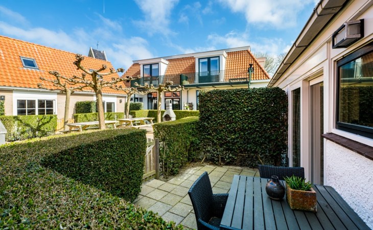 Het terras ligt beschut en is volledig omheind. Het kijkt uit over het binnenhofje met barbecue.