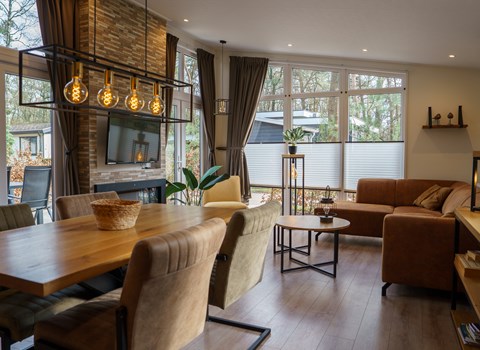 Huisje 3 heeft een woon- en eetkamer op de begane grond met schuifdeur naar het terras. Er is een volledig uitgeruste keuken met vaatwasser.