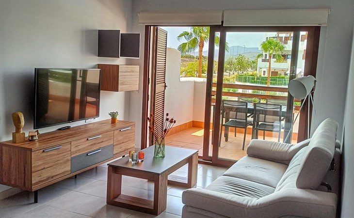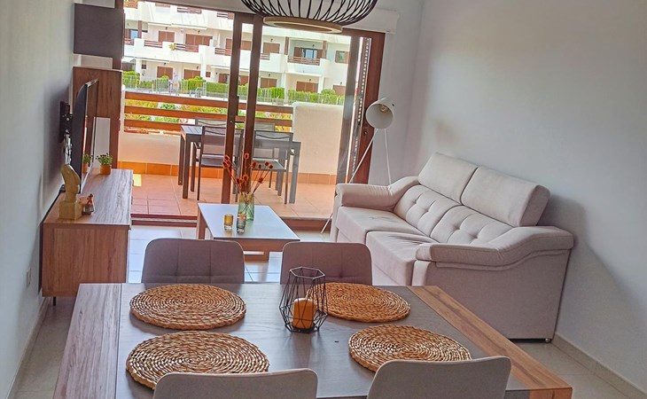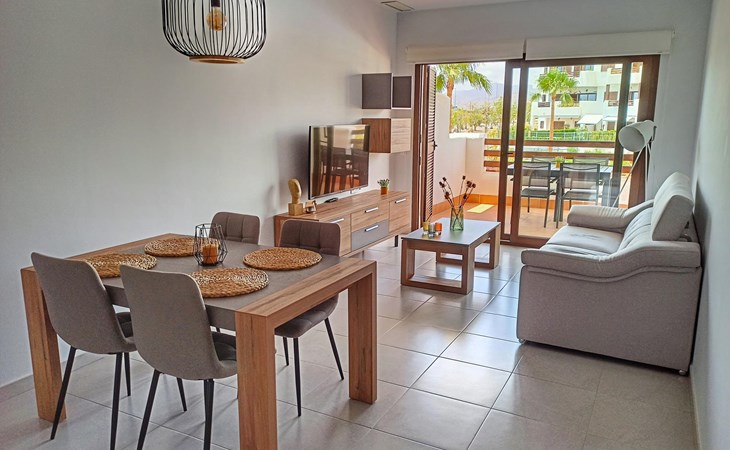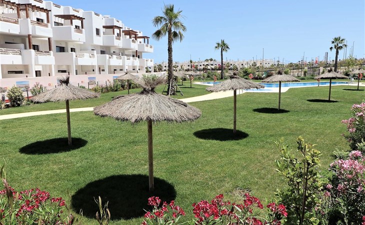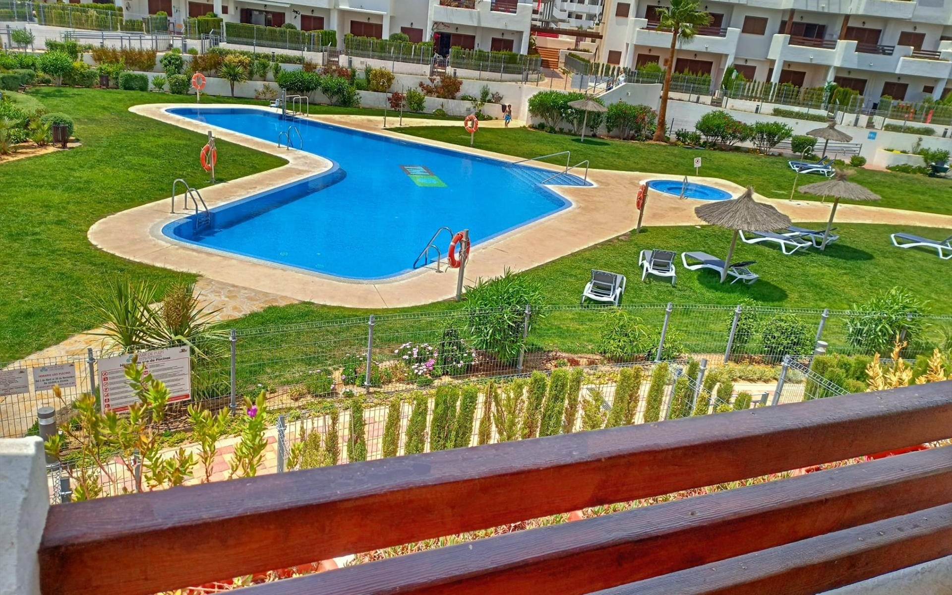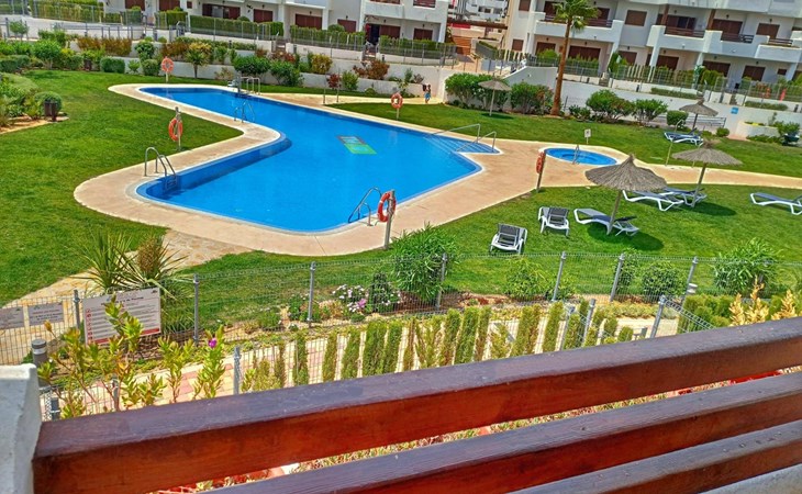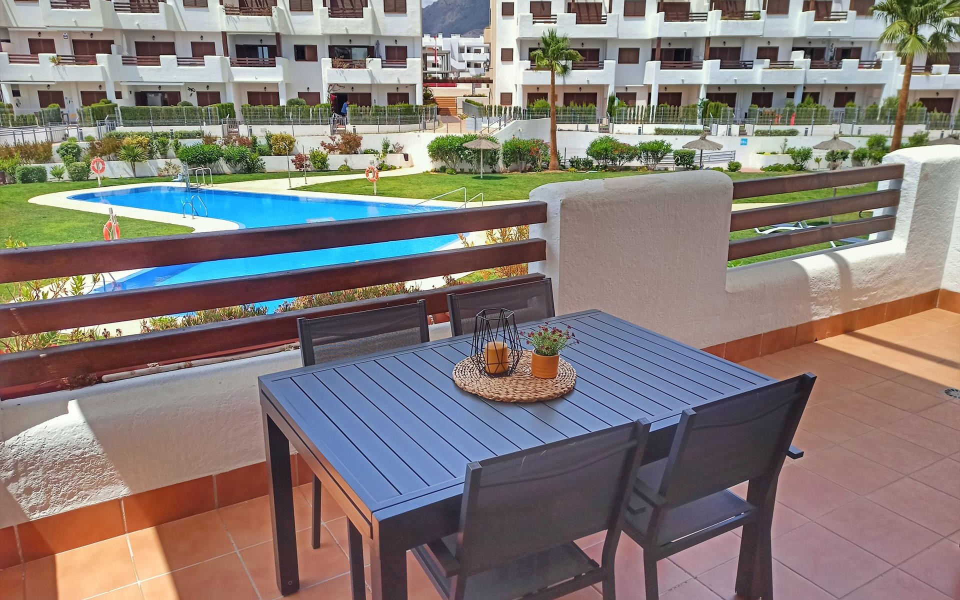 Modern en vrolijk appartement in San Juan de los Terreros, Andalusië, Spanje met gemeenschappelijk zwembad voor 4 personen. Het appartement is gelegen in een strandresort, in een kust- en woonwijk, nabij supermarkten en op 500 meter van het strand.