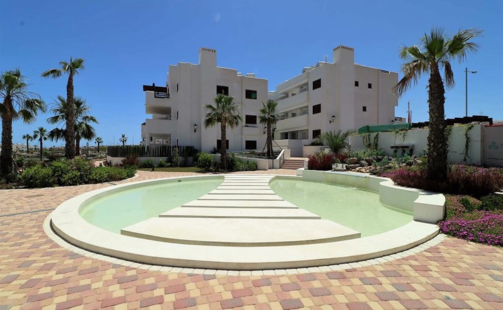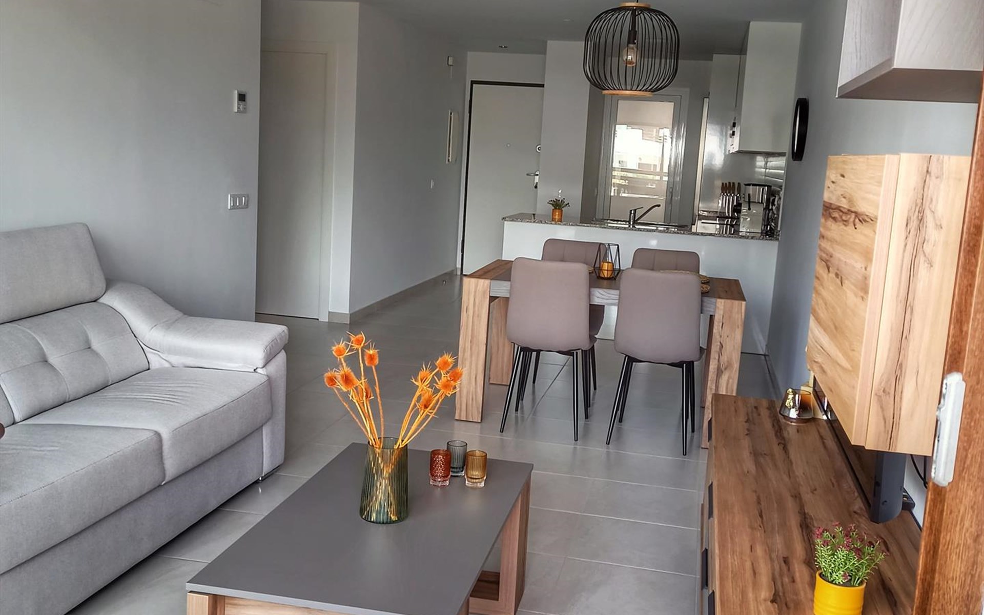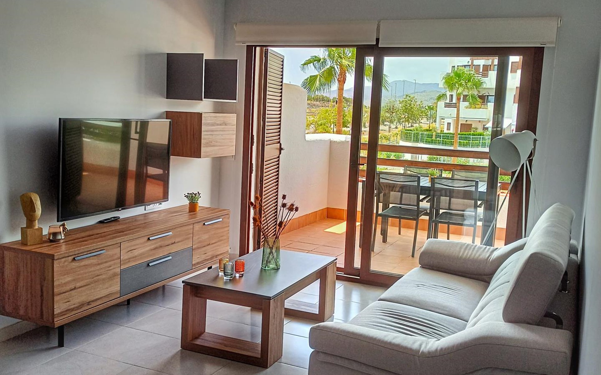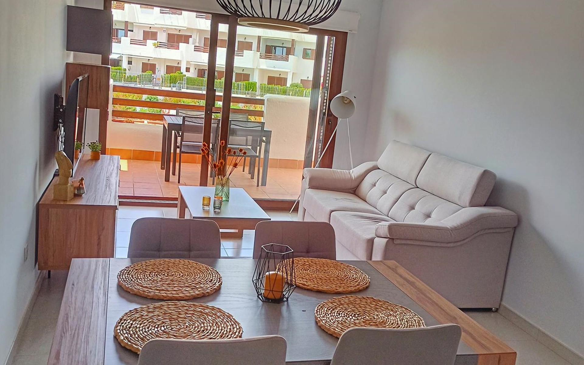 Modern en vrolijk appartement in San Juan de los Terreros, Andalusië, Spanje met gemeenschappelijk zwembad voor 4 personen. Het appartement is gelegen in een strandresort, in een kust- en woonwijk, nabij supermarkten en op 500 meter van het strand.