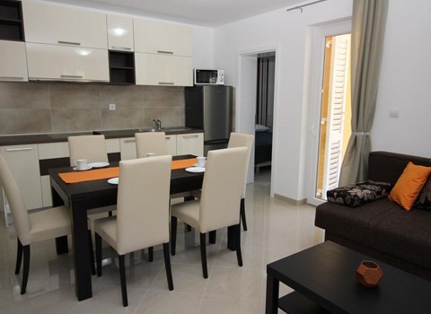 Vakantiewoning Adrijana Pore? 1 bevindt zich op de eerste verdieping, heeft een woonoppervlakte van 80 vierkante meter en is volledig voorzien van airconditioning. Het appartement bestaat uit een woonkamer met eetkamer en slaapbank voor een persoon, keuken, loggia met barbecue en eettafel, twee slaapkamers, een met een tweepersoonsbed en de andere met twee eenpersoonsbedden, een douche/WC.