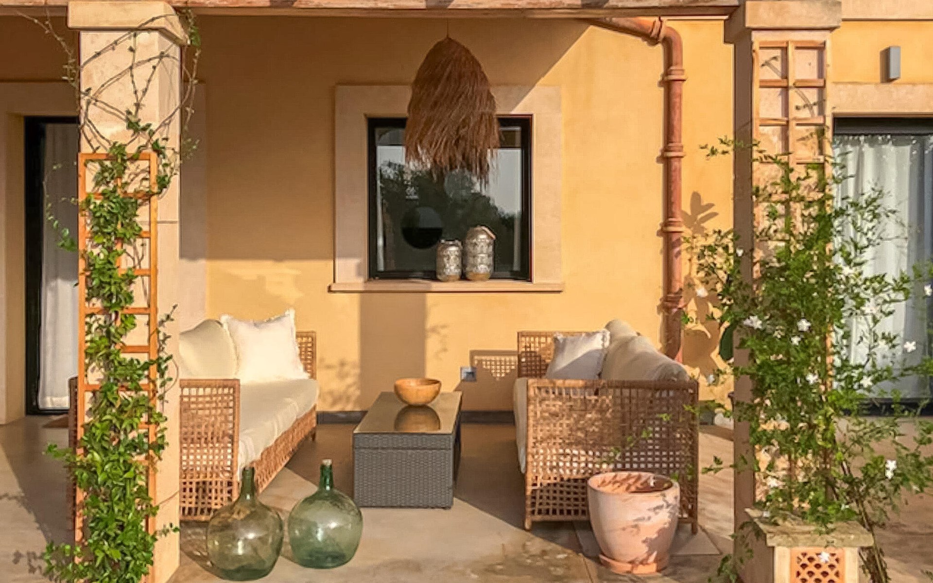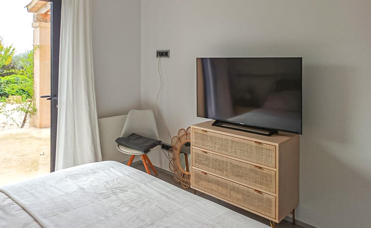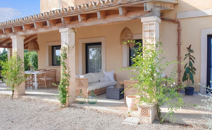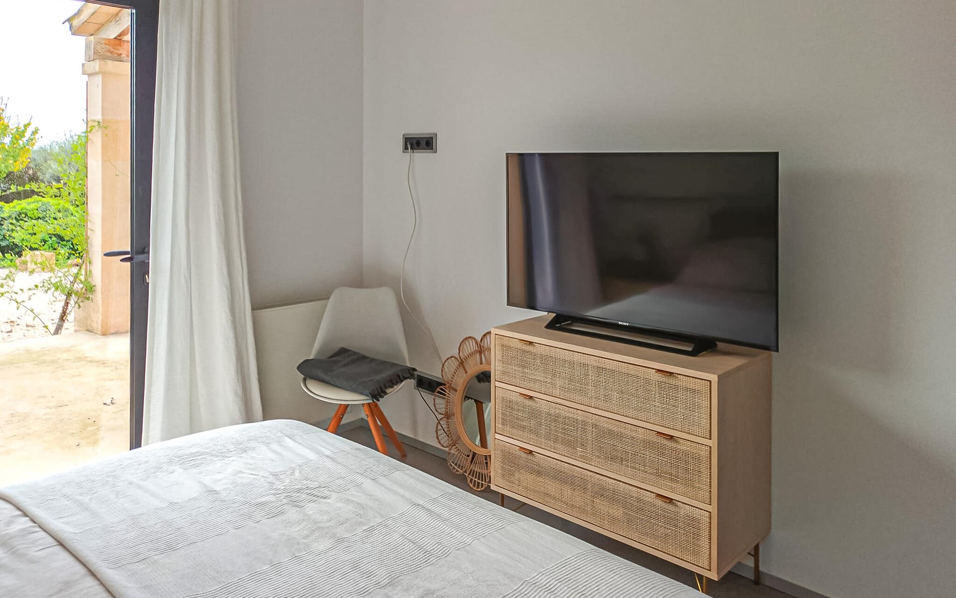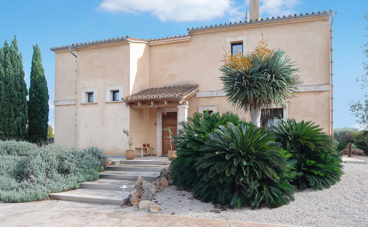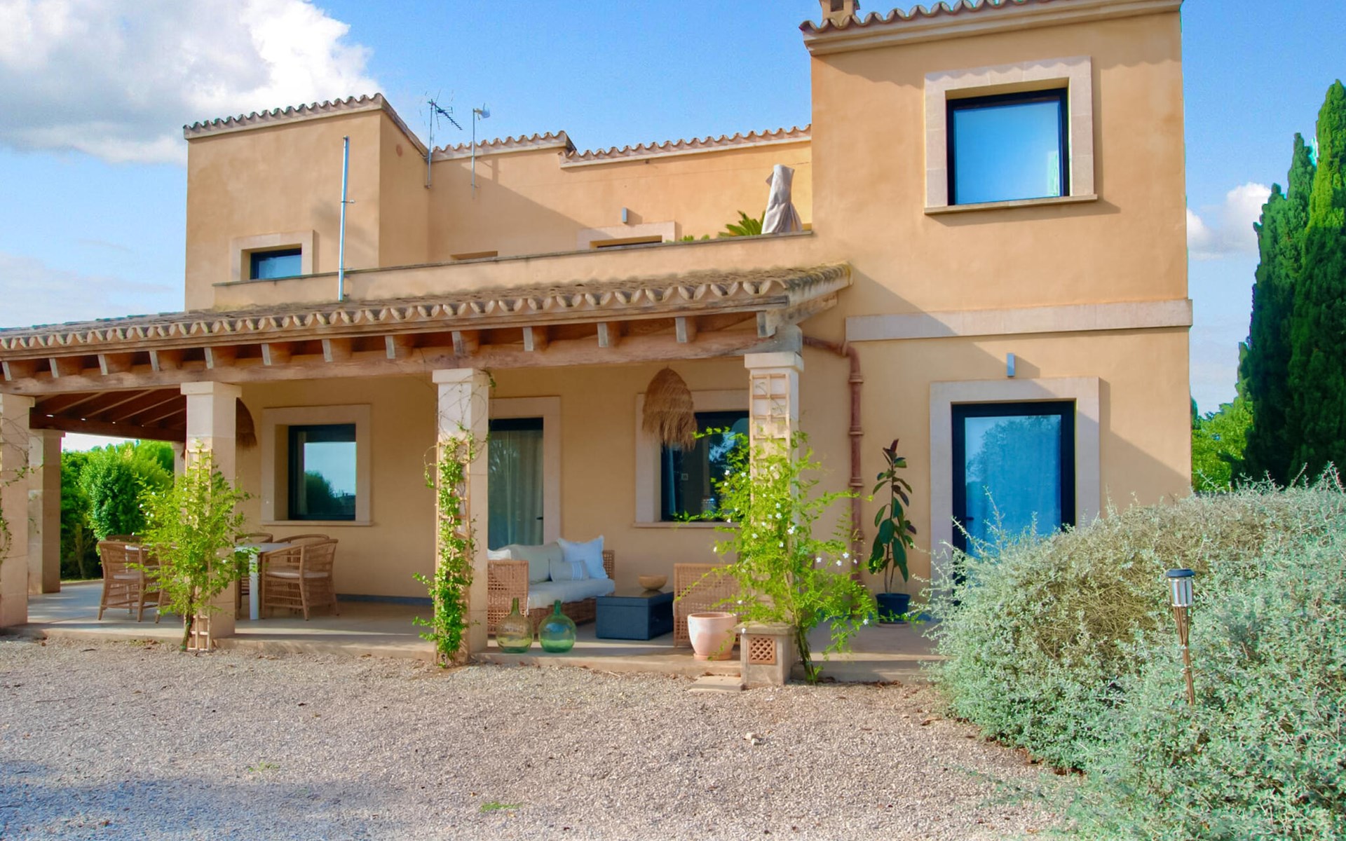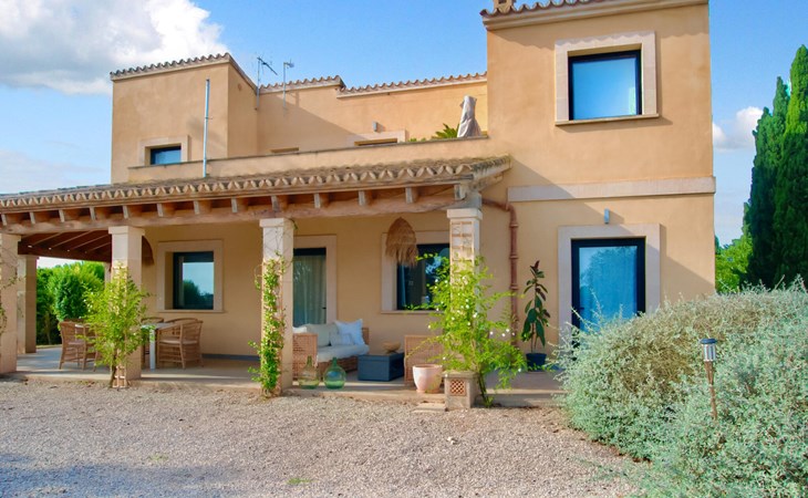 Het ruime interieur van het huis is trendy, modern en gezellig. Er is met veel liefde gekozen voor moderne meubels en accessoires. Harmonieuze kleuren, elegante vloeren en veel licht kenmerken ook de zeer smaakvolle sfeer, die zich uitstrekt over twee verdiepingen. De woon- en eetkamer en de stijlvolle, volledig uitgeruste keuken bevinden zich op de begane grond. Links van de ingang is een slaapkamer met een tweepersoonsbed en een doucheruimte. Boven zijn er nog twee slaapkamers, waarvan er een een eigen doucheruimte heeft. Het huis heeft radiatoren en een warm/koud airconditioningsysteem, waardoor het in elk jaargetijde aangenaam is om in te wonen. Het is voorzien van zonne-energie. De moderne Mallorca finca Son Grancampio ligt in een landelijke omgeving en op slechts ongeveer 5 minuten rijden van Campos, waar je restaurants, bars en winkels vindt voor je dagelijkse behoeften. Door de strategische ligging zijn de wegverbindingen ideaal. Enkele van de uitnodigende stranden in het zuiden van Mallorca liggen op slechts een kwartiertje rijden van de finca, bijvoorbeeld het beroemde fijne zandstrand Es Trenc.