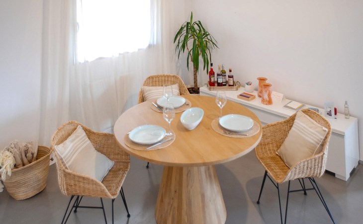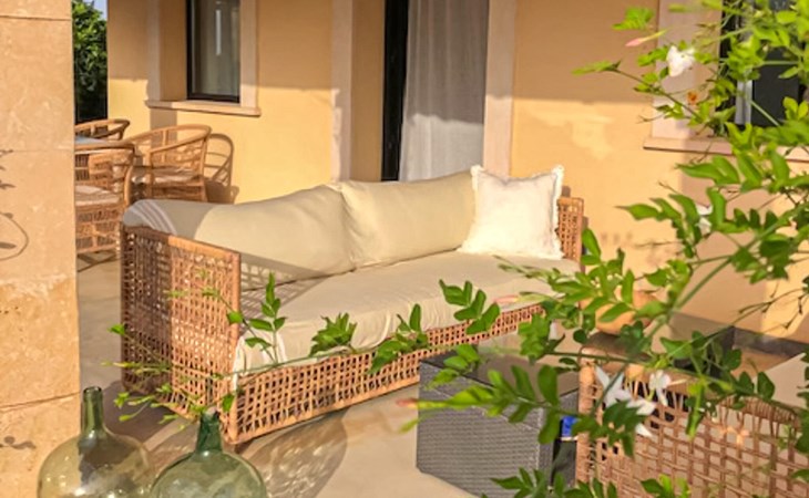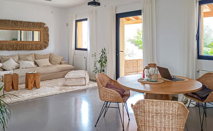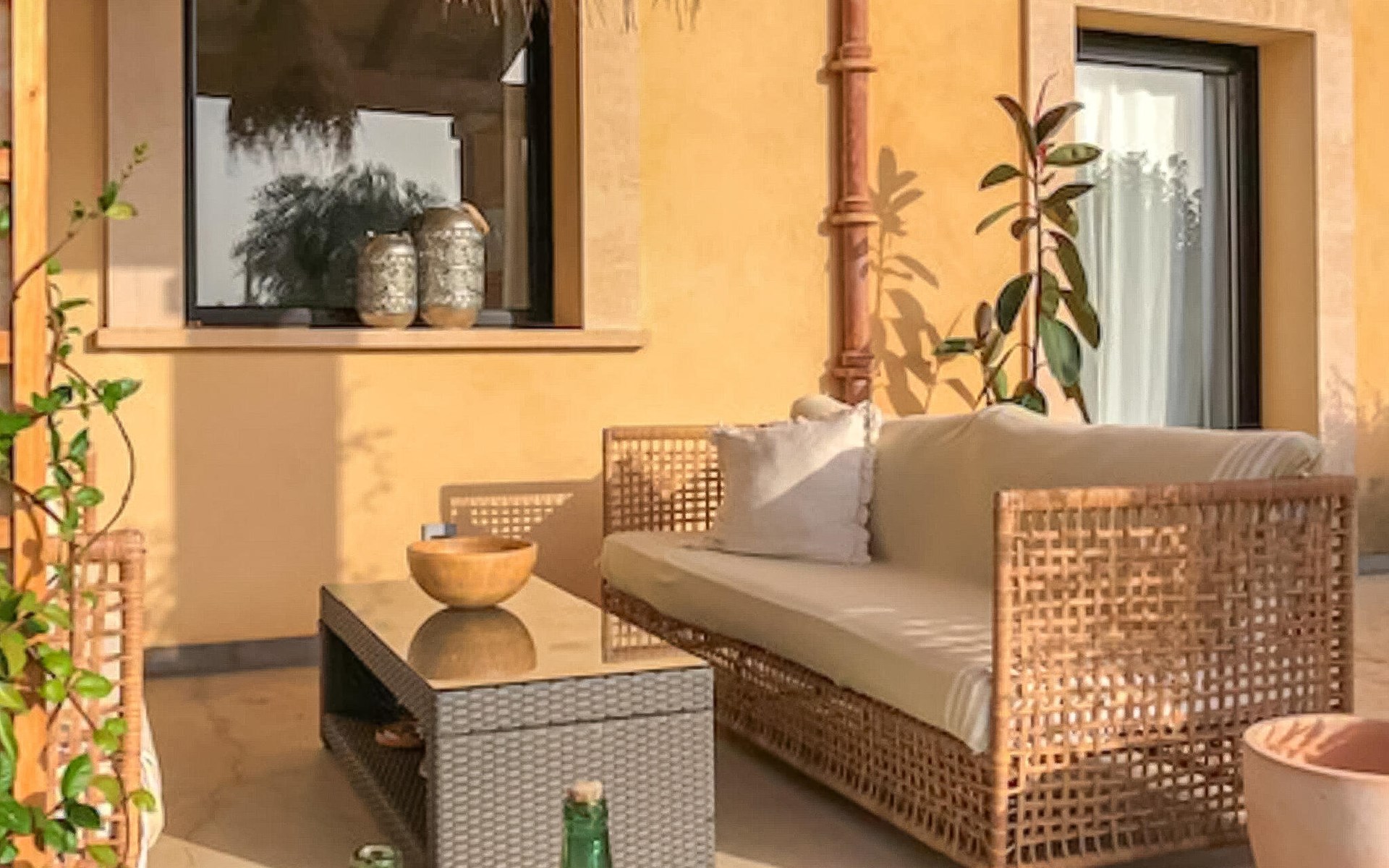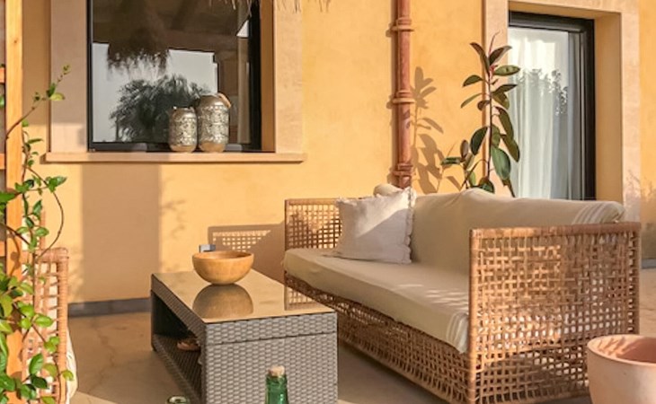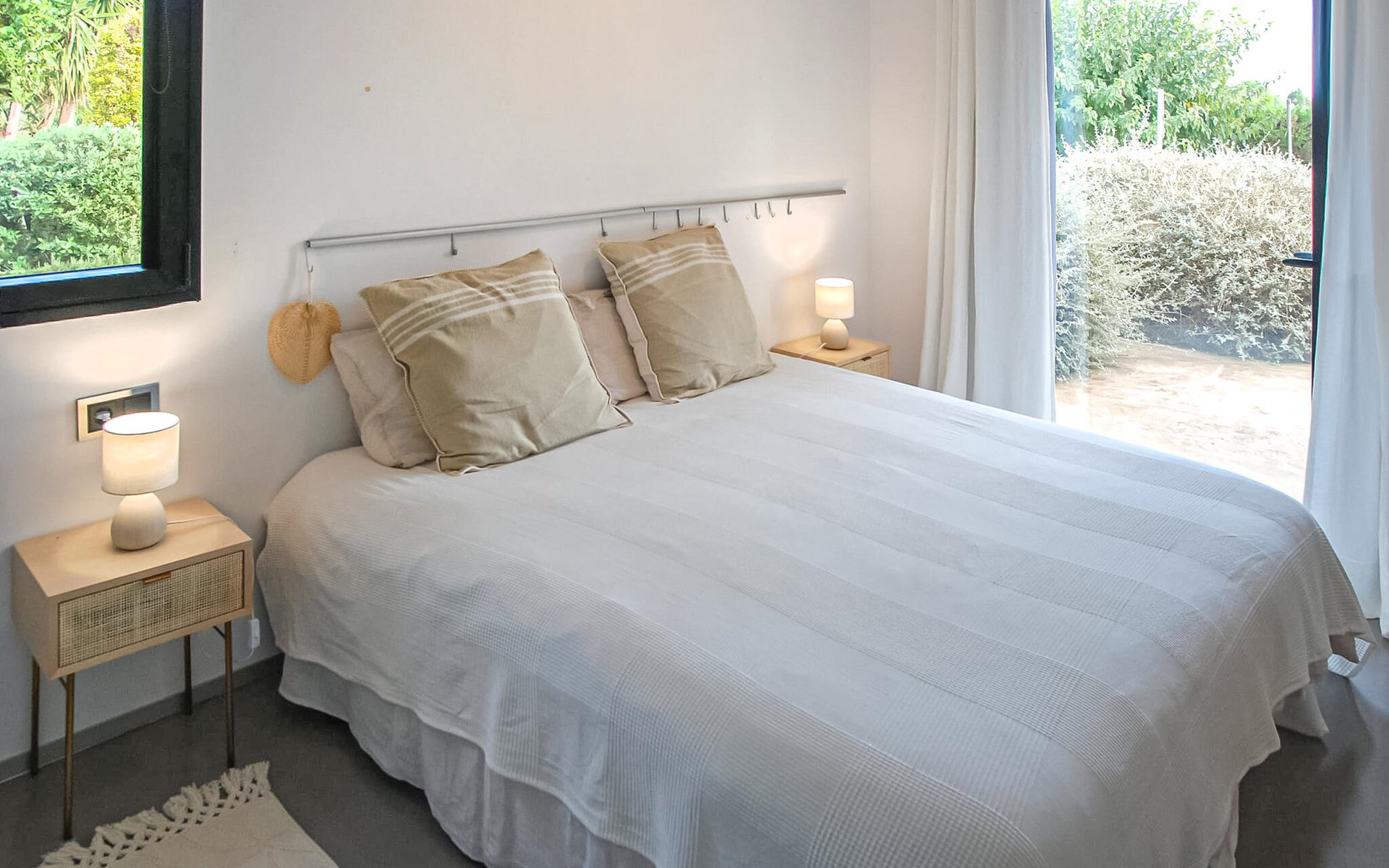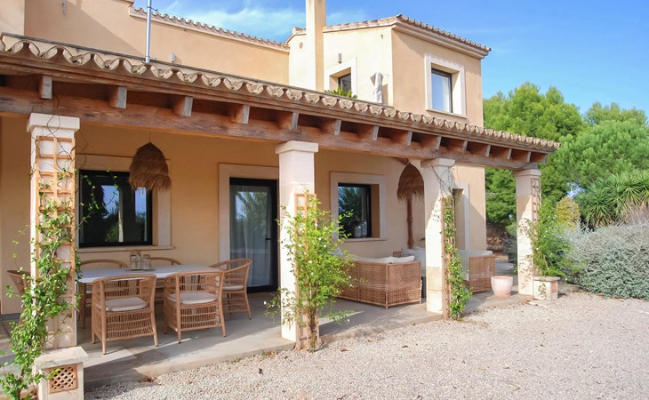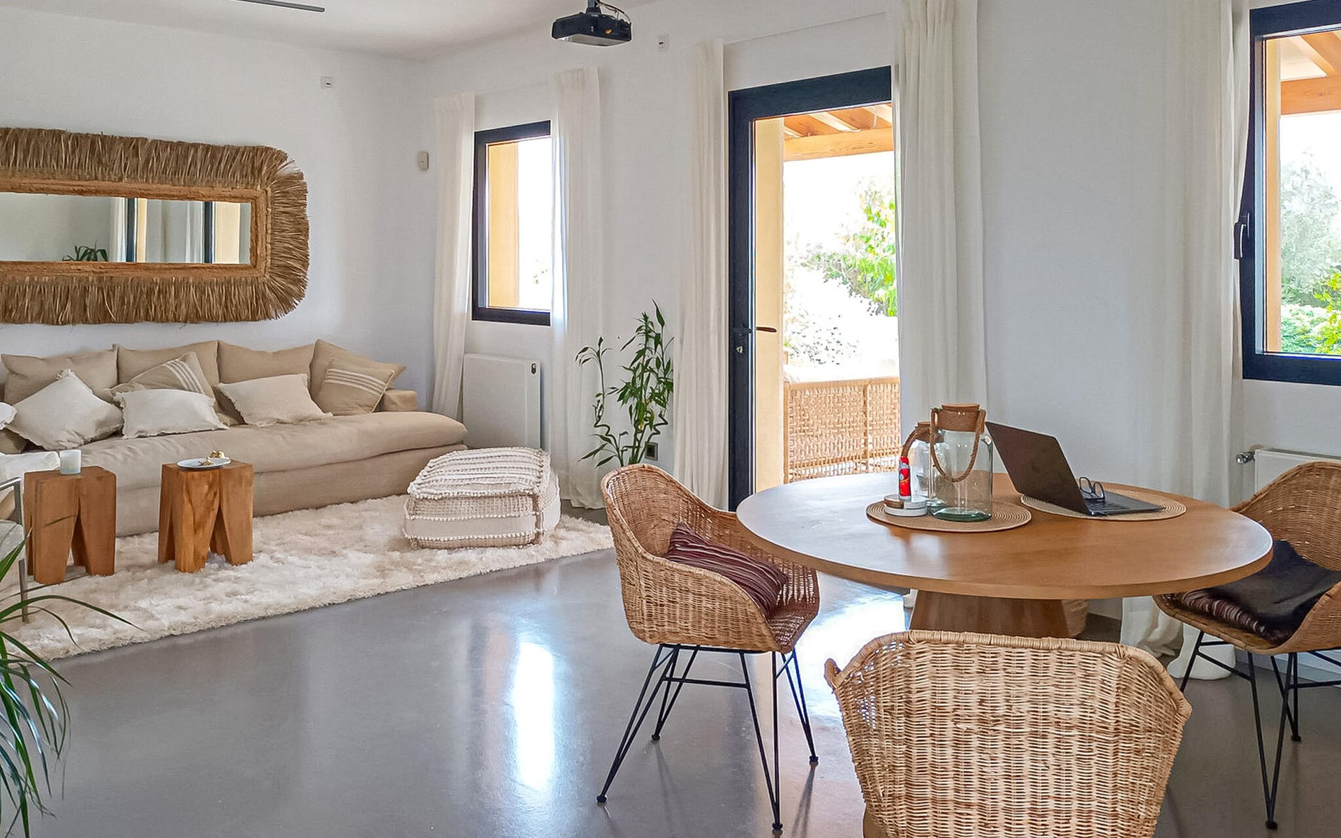 Het ruime interieur van het huis is trendy, modern en gezellig. Er is met veel liefde gekozen voor moderne meubels en accessoires. Harmonieuze kleuren, elegante vloeren en veel licht kenmerken ook de zeer smaakvolle sfeer, die zich uitstrekt over twee verdiepingen. De woon- en eetkamer en de stijlvolle, volledig uitgeruste keuken bevinden zich op de begane grond. Links van de ingang is een slaapkamer met een tweepersoonsbed en een doucheruimte. Boven zijn er nog twee slaapkamers, waarvan er een een eigen doucheruimte heeft. Het huis heeft radiatoren en een warm/koud airconditioningsysteem, waardoor het in elk jaargetijde aangenaam is om in te wonen. Het is voorzien van zonne-energie. De moderne Mallorca finca Son Grancampio ligt in een landelijke omgeving en op slechts ongeveer 5 minuten rijden van Campos, waar je restaurants, bars en winkels vindt voor je dagelijkse behoeften. Door de strategische ligging zijn de wegverbindingen ideaal. Enkele van de uitnodigende stranden in het zuiden van Mallorca liggen op slechts een kwartiertje rijden van de finca, bijvoorbeeld het beroemde fijne zandstrand Es Trenc.