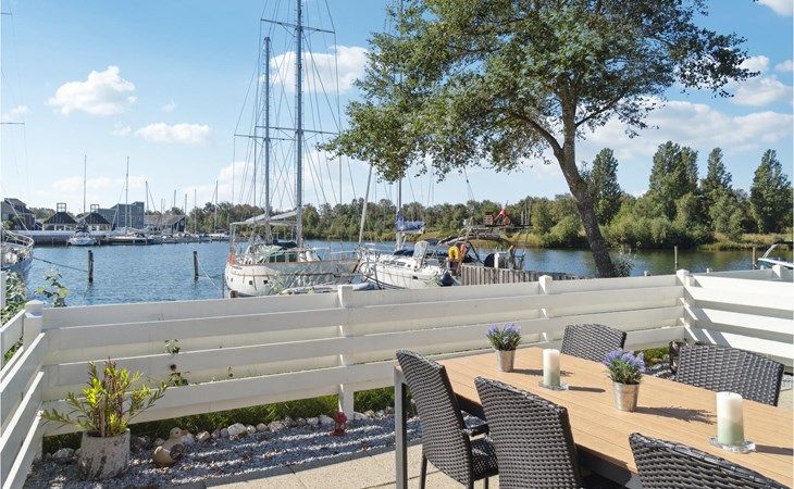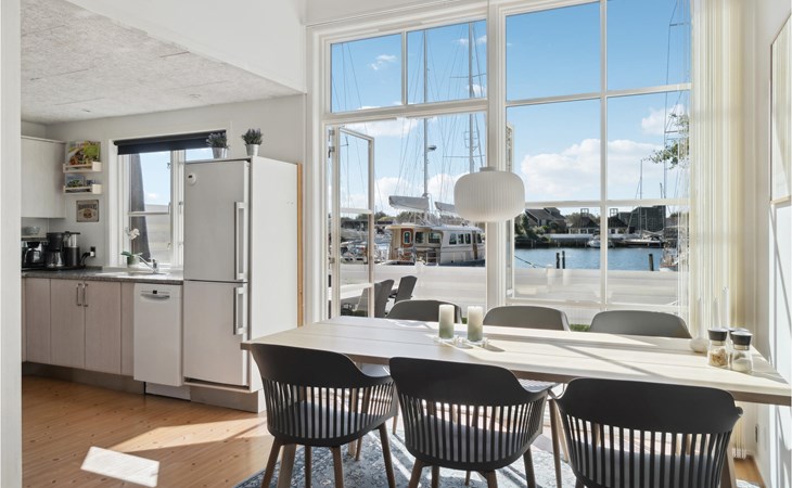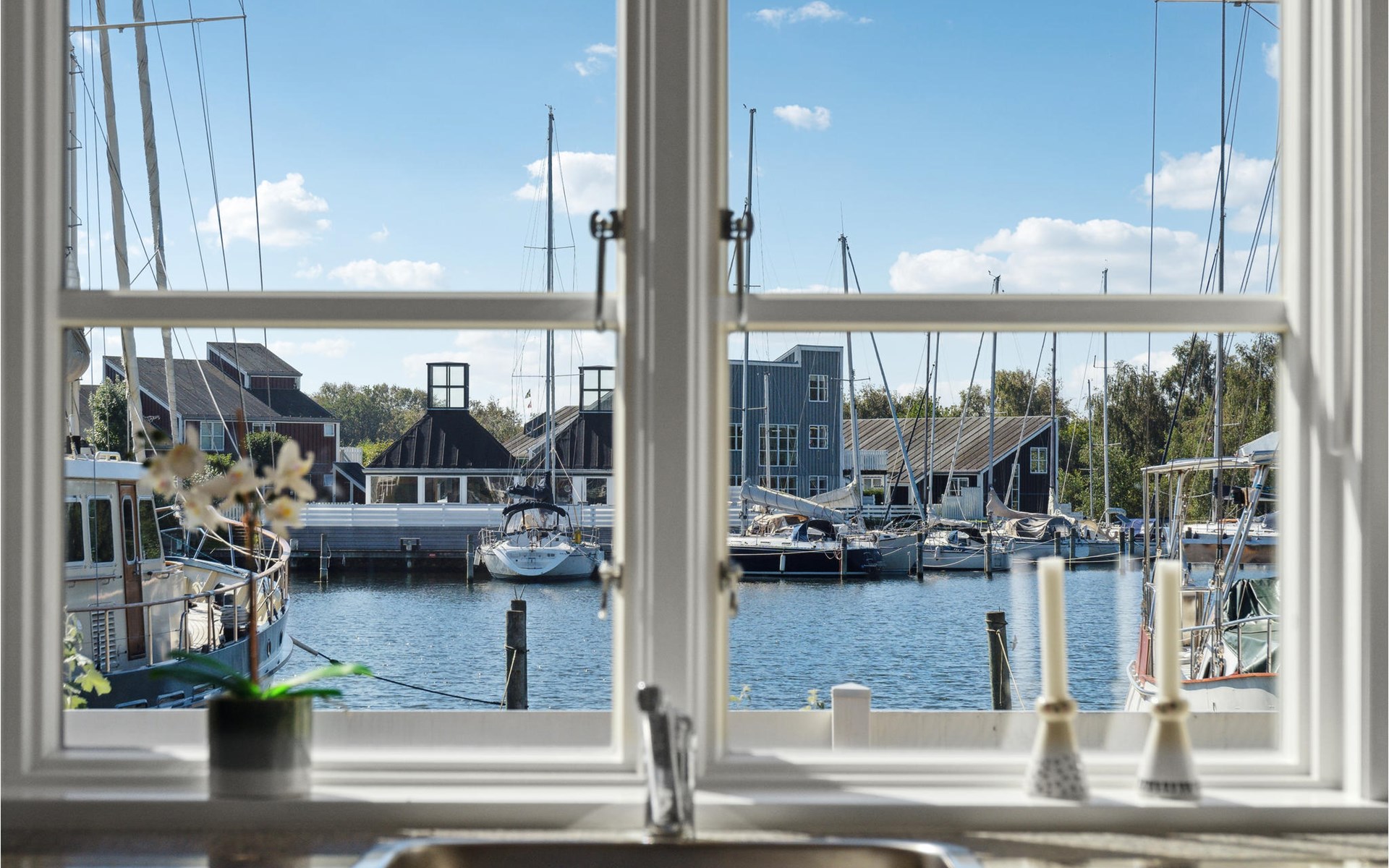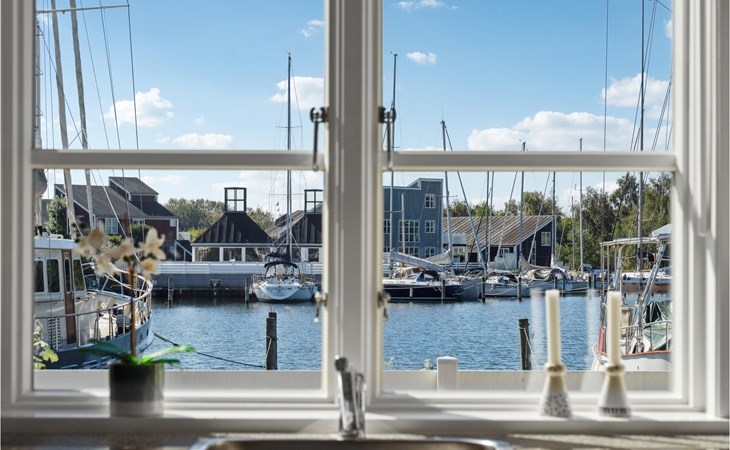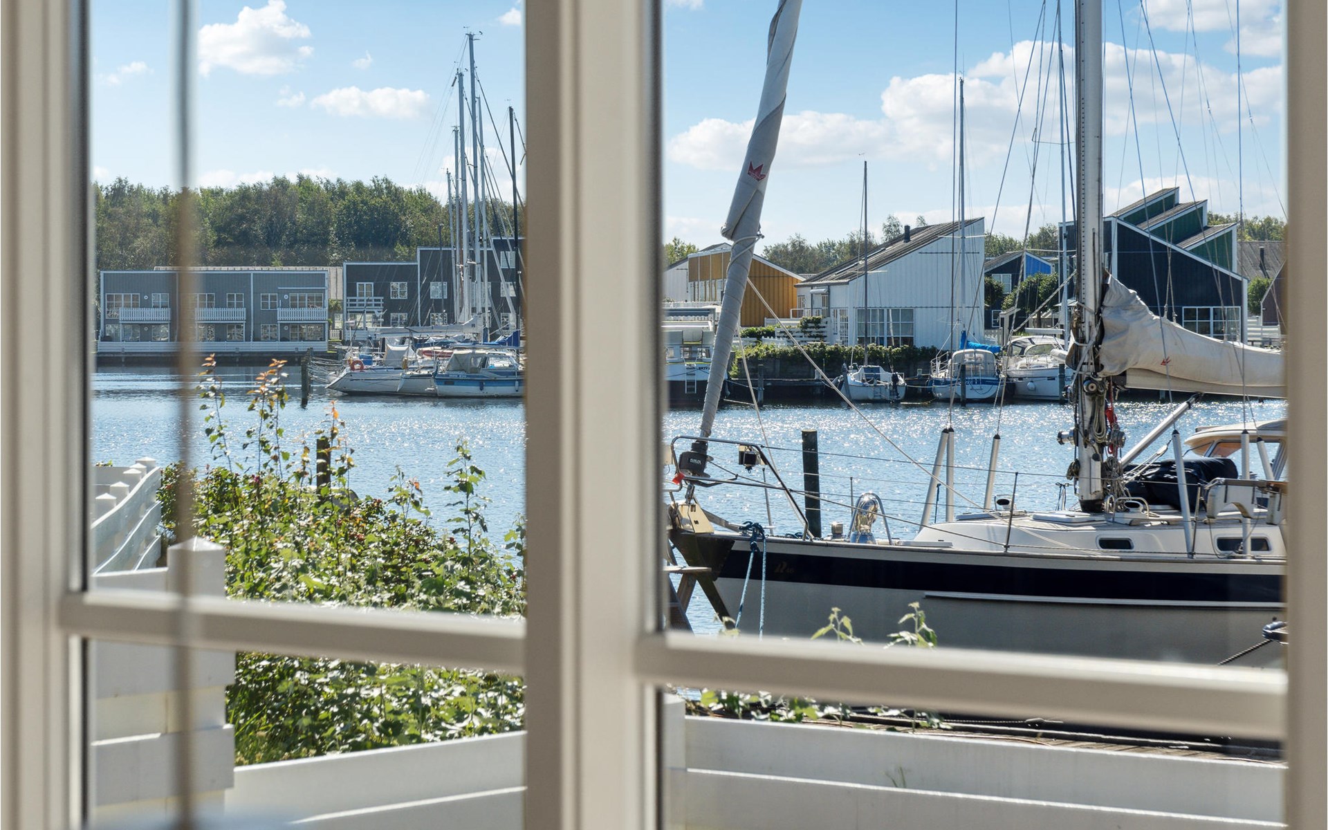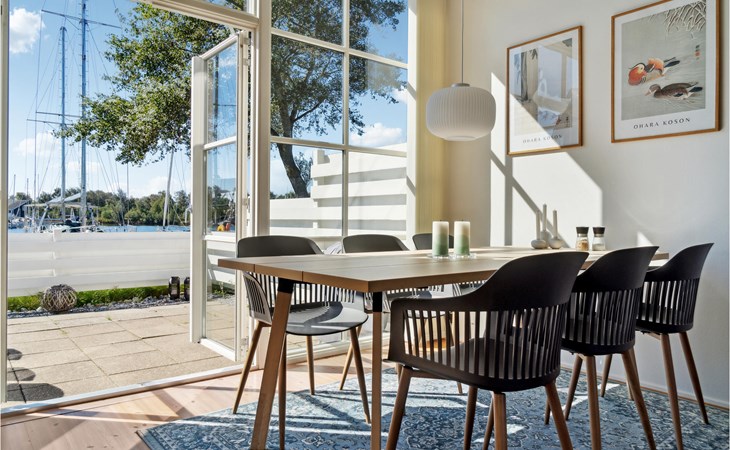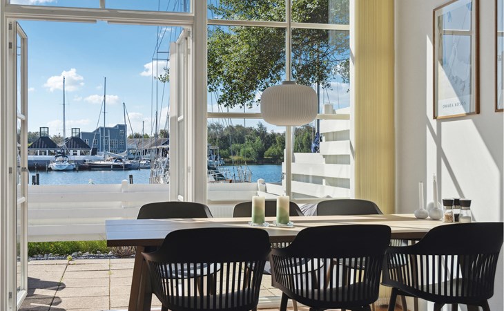 De grote eettafel is ideaal voor gezellige maaltijden en lange pokeravonden. Vanaf het kleine, beschutte terras heb je een fantastisch uitzicht op het bijzondere gebied en de natuur en de jachthaven.