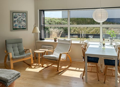 Je vakantiehuis ligt in een groene oase in de buurt van de Lammefjord. De beschutte ligging en gezellige sfeer bieden goede voorwaarden voor rust en ontspanning. Geniet van het spel van het vuur in de houtkachel in de lichte woonkamer of blader door een boek op de plank. De grote ramen zorgen voor een luchtig gevoel van ruimte en een prachtig uitzicht op het groen. Bereid je maaltijden in de open keuken met lichtgekleurde fronten en houten werkblad. De aangrenzende serre nodigt je uit om te ontbijten of te kaarten, zelfs bij wisselvallig weer.