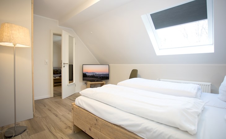 De slaapkamer ligt naast de keuken en bevat een tweepersoonsbed (2x 90x200cm). Er is hier een tweede tv aanwezig zodat je ook vanuit bed nog even heerlijk televisie kan kijken. Er zijn daarnaast 2 nachtkastjes, bedlampjes en een kledingkast aanwezig. Op de slaapbank in de woonkamer is verder slaapplaats voor 2 kinderen. De badkamer is ingericht met een inloop/regendouche, toilet, wastafelmeubel en een handdoekradiator.