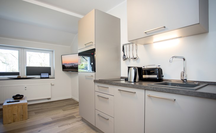 De keuken is van alle gemakken voorzien. Met een inductiekookplaat, combi-magnetron, vaatwasser, koelkast met vriesvakje, broodrooster, waterkoker en nespresso koffiezetapparaat heb je alles in huis om je maaltijden te bereiden.