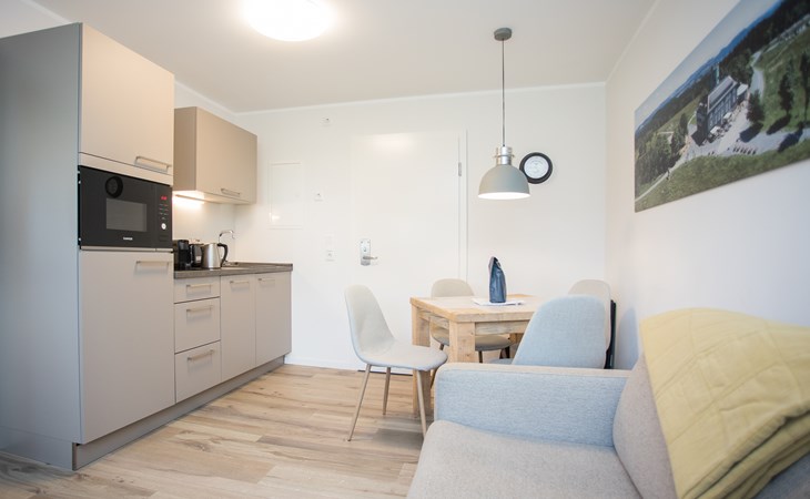 Het appartement, gelegen op de 2e etage, biedt ruimte voor 4 personen (2 volwassenen, 2 kinderen). Via de trap bereik je de accommodatie waarin alle kamers op één etage liggen, wel zijn er enkele hoogteverschillen, zoals een trapje. In de woonkamer vind je een comfortabele (slaap)bank met daarbij een televisie en een eettafel met ruimte voor vier personen.