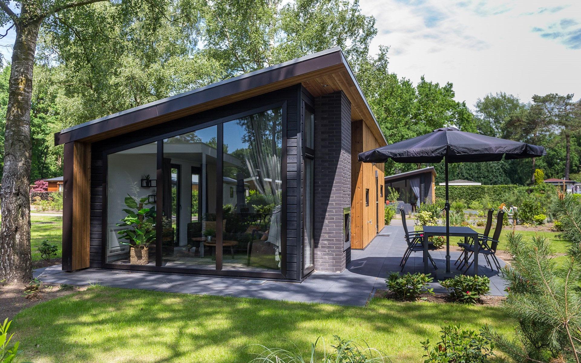 Let op: de tuin indeling, woning inrichting en kleurstelling van de Berken Lodge | 4 personen die u kiest, kan afwijken van de getoonde afbeeldingen op de website.