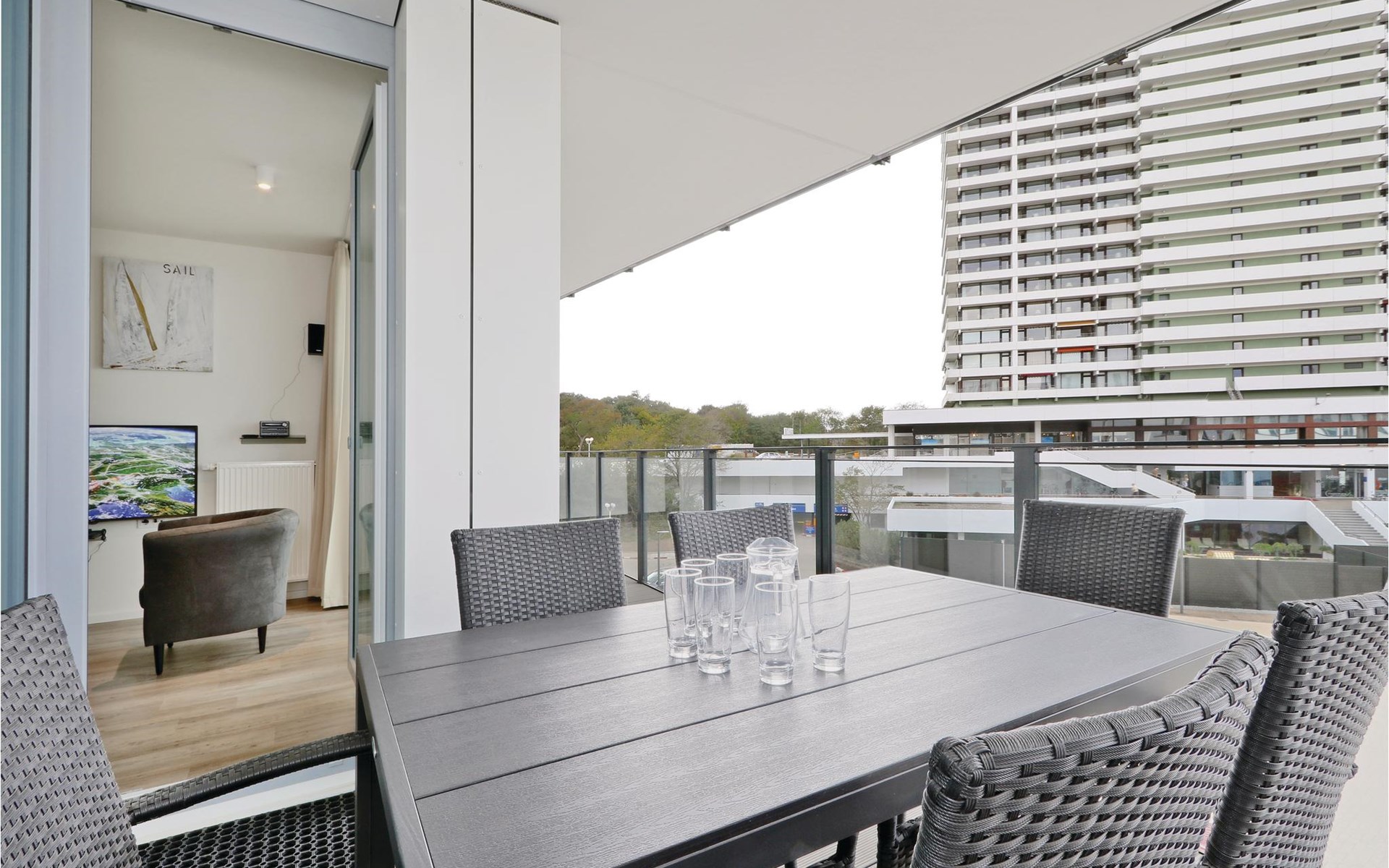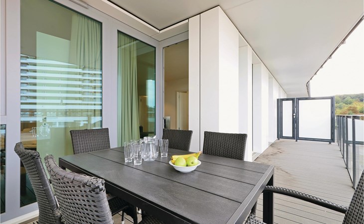 De moderne kitchenette biedt genoeg ruimte om te koken en is uitgerust met hoogwaardige merkapparatuur. Koffieliefhebbers vinden hier een filterkoffiezetapparaat en een thermoskan. Op het balkon kun je genieten van de frisse Oostzeelucht en het geluid van de golven of samen met het gezin eten. Geniet van het uitzicht op de promenade tot aan de Oostzee.