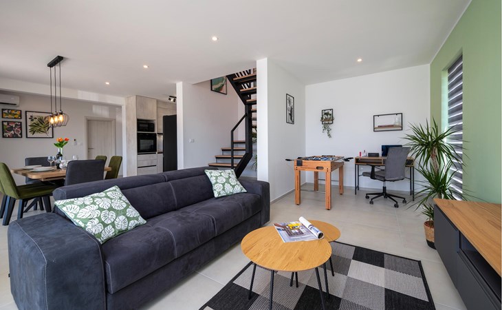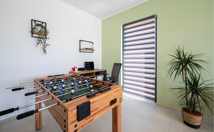Kom aan met je gezin en kijk uit naar een geweldige vakantie in dit prachtige huis. De smaakvol ingerichte kamers zijn verdeeld over twee verdiepingen, waardoor er een uitnodigende en warme sfeer voor je ontstaat. Geniet van gezellige uurtjes in de woonkamer of op de veranda terwijl de avondzon het huis in een zacht licht baadt. Het zwembad nodigt je uit om af te koelen, en 's avonds wordt de barbecue het middelpunt voor gezamenlijke maaltijden. Plezier en entertainment worden geboden door tafelvoetbal en het ruime balkon met uitzicht op zee.