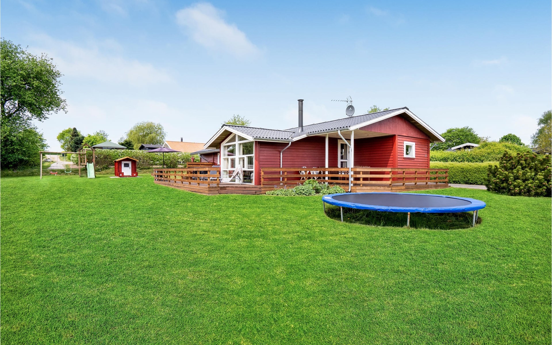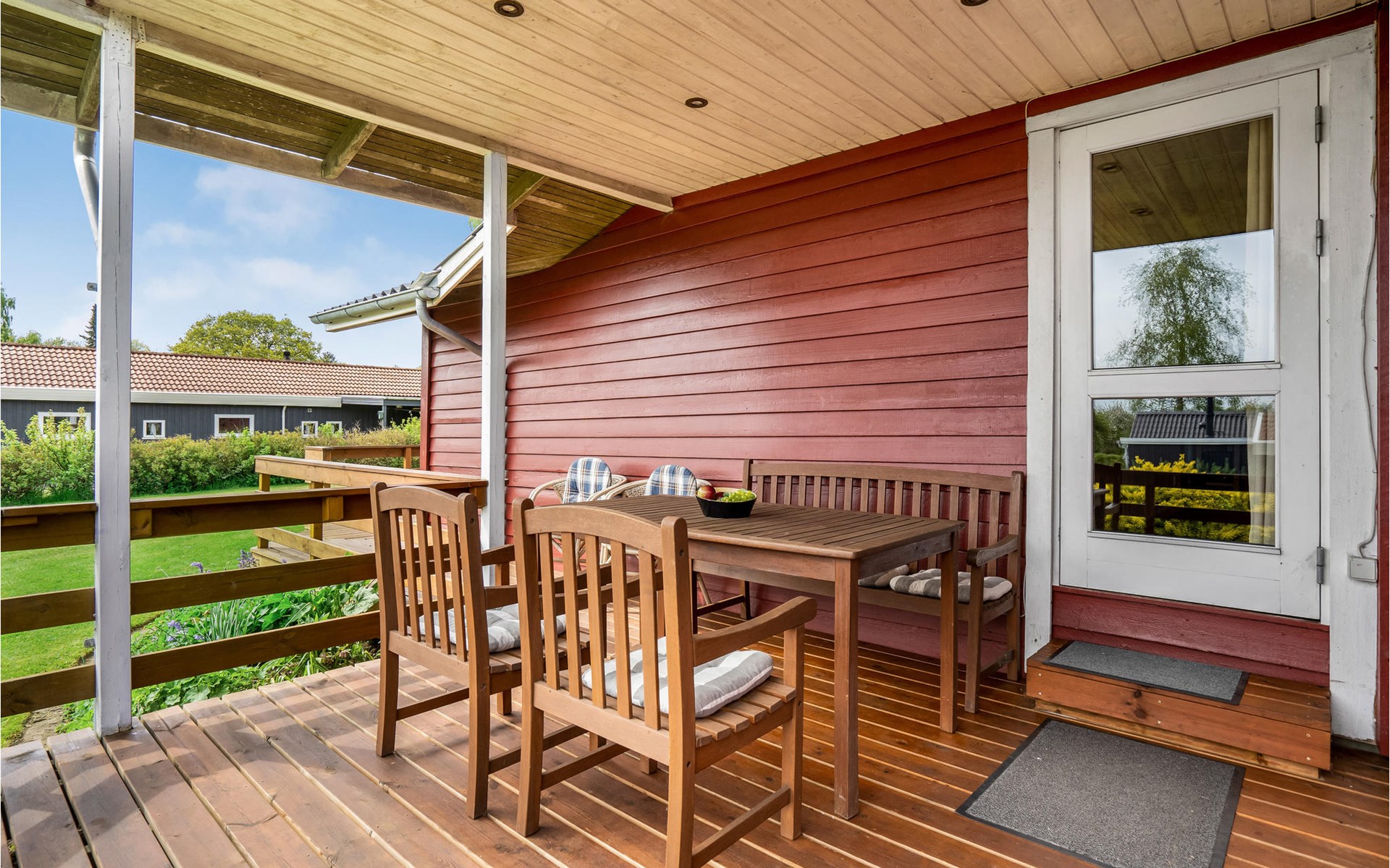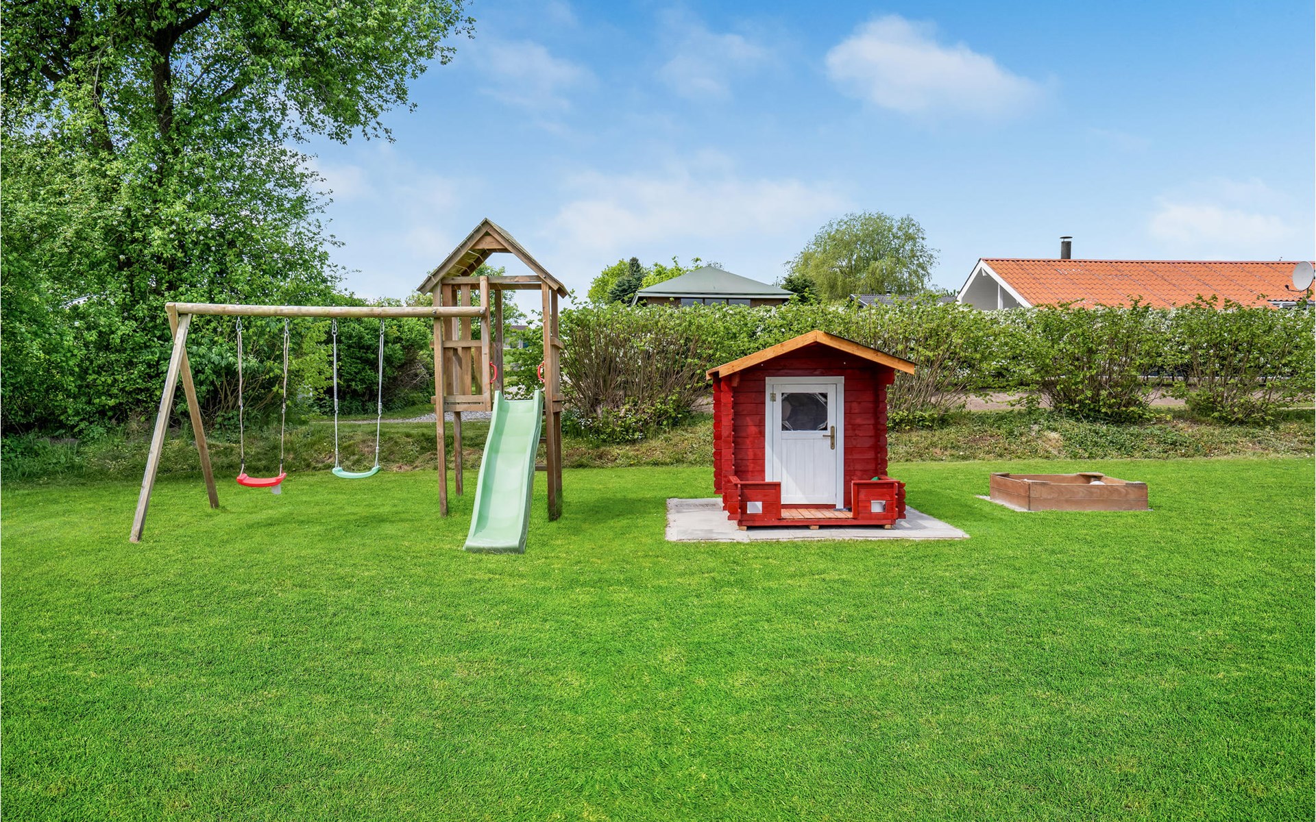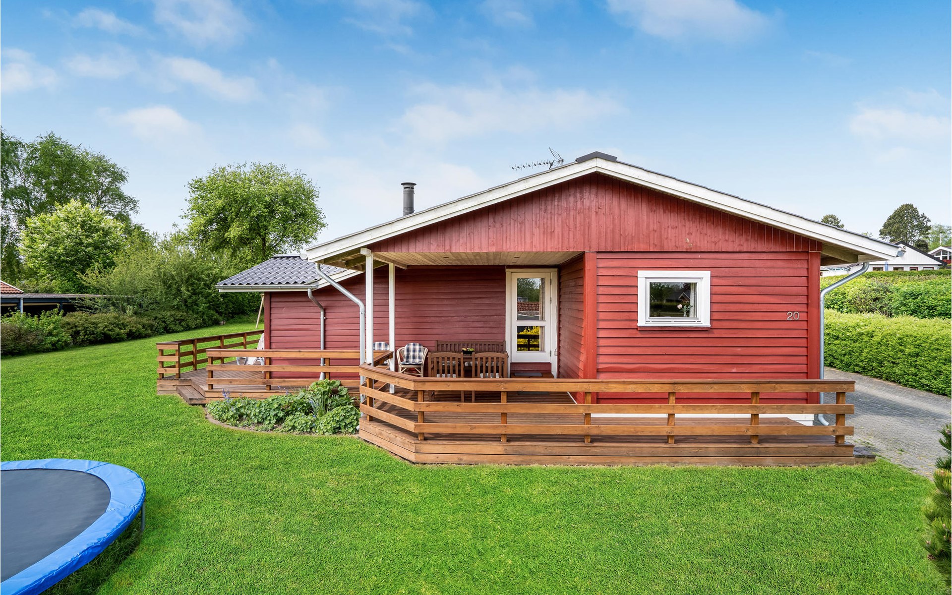 Pas gerenoveerd houten huis midden in een groot vakantiehuizengebied, omgeven door een mooi gazon en aan het einde van een kleinere doodlopende weg met zeer weinig verkeer.