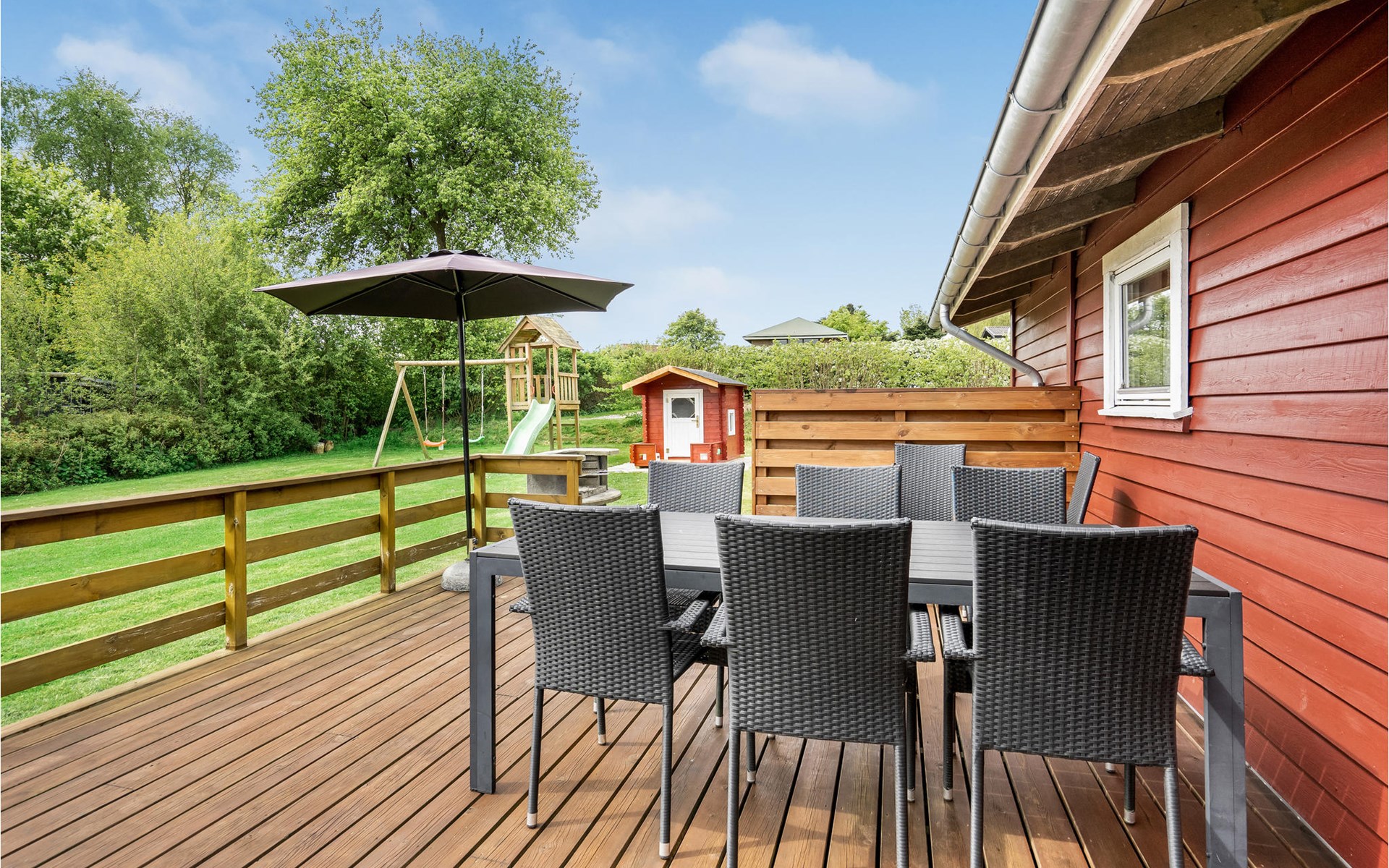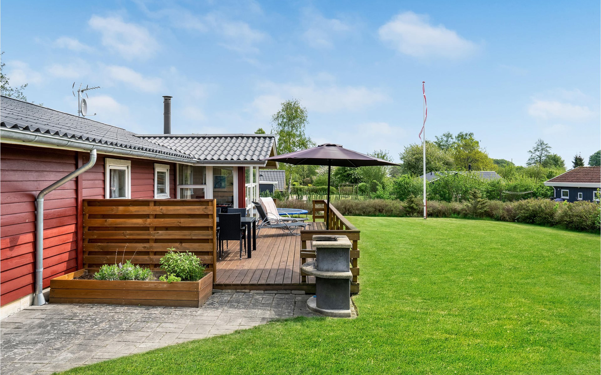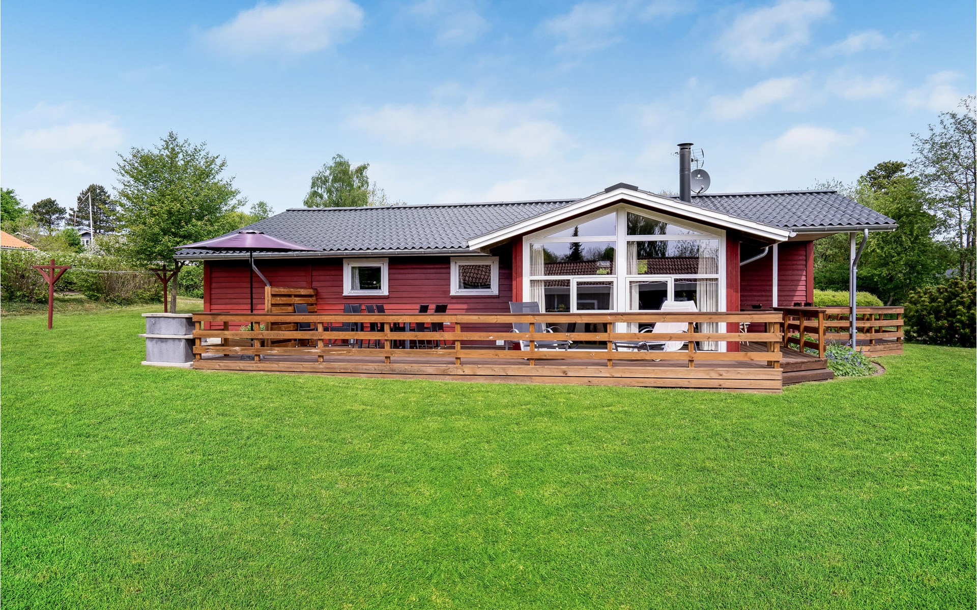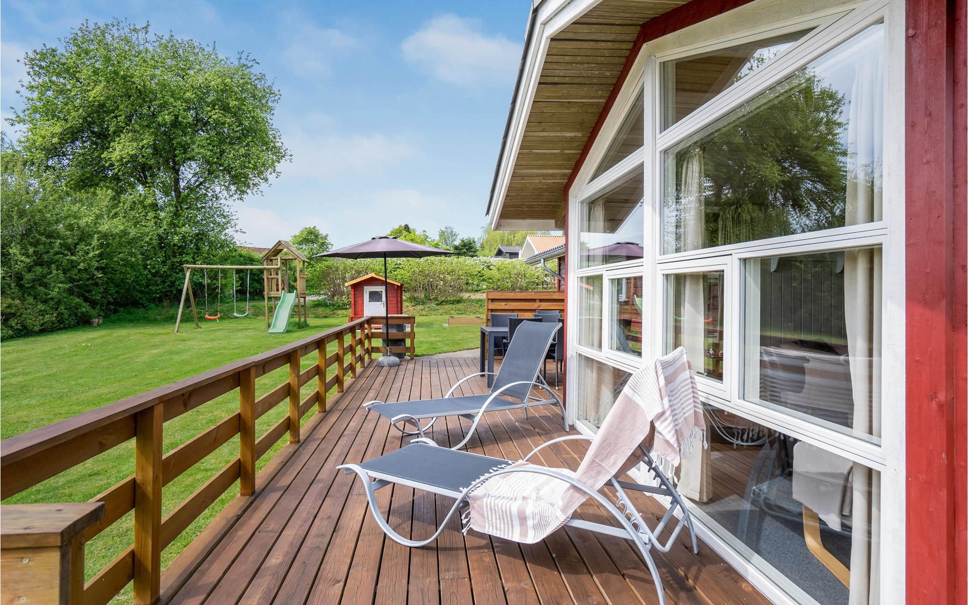 Pas gerenoveerd houten huis midden in een groot vakantiehuizengebied, omgeven door een mooi gazon en aan het einde van een kleinere doodlopende weg met zeer weinig verkeer.