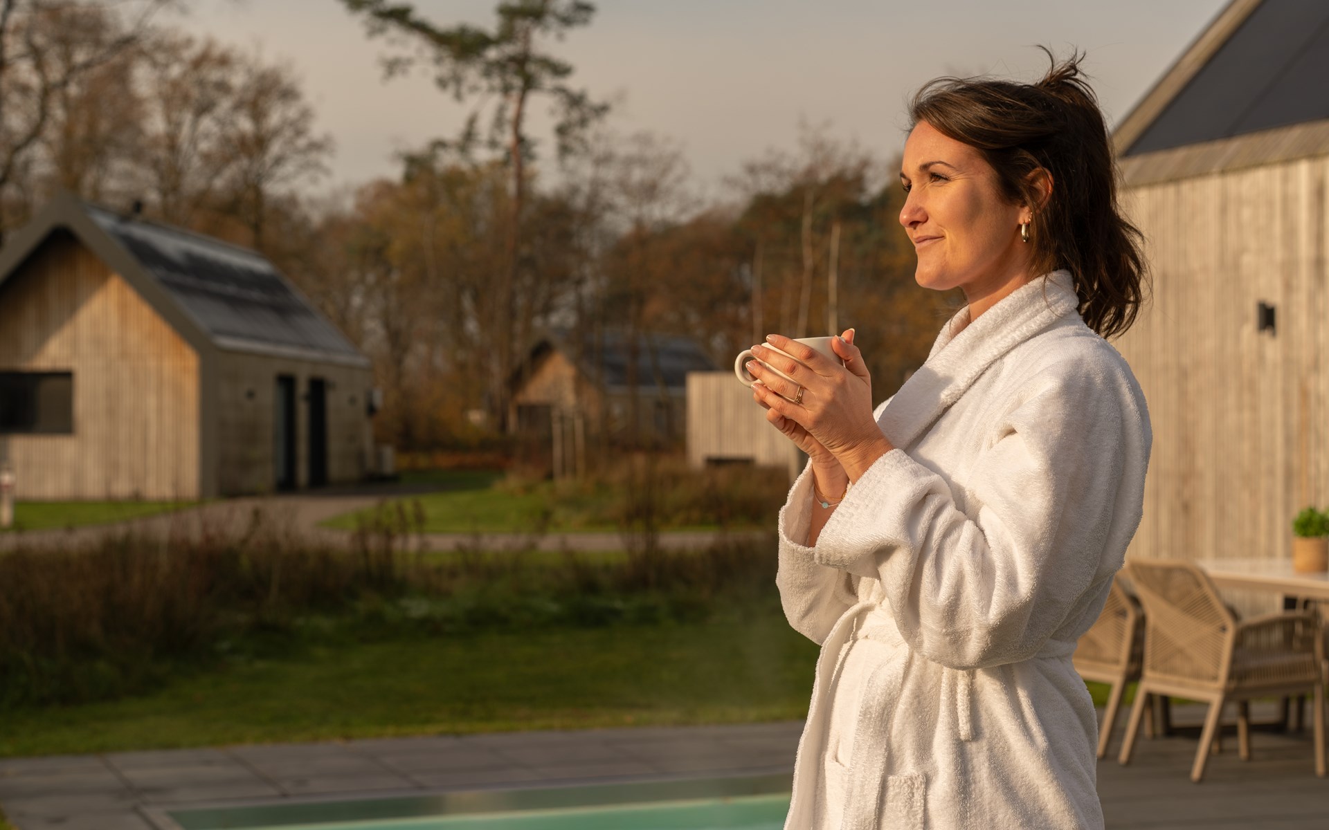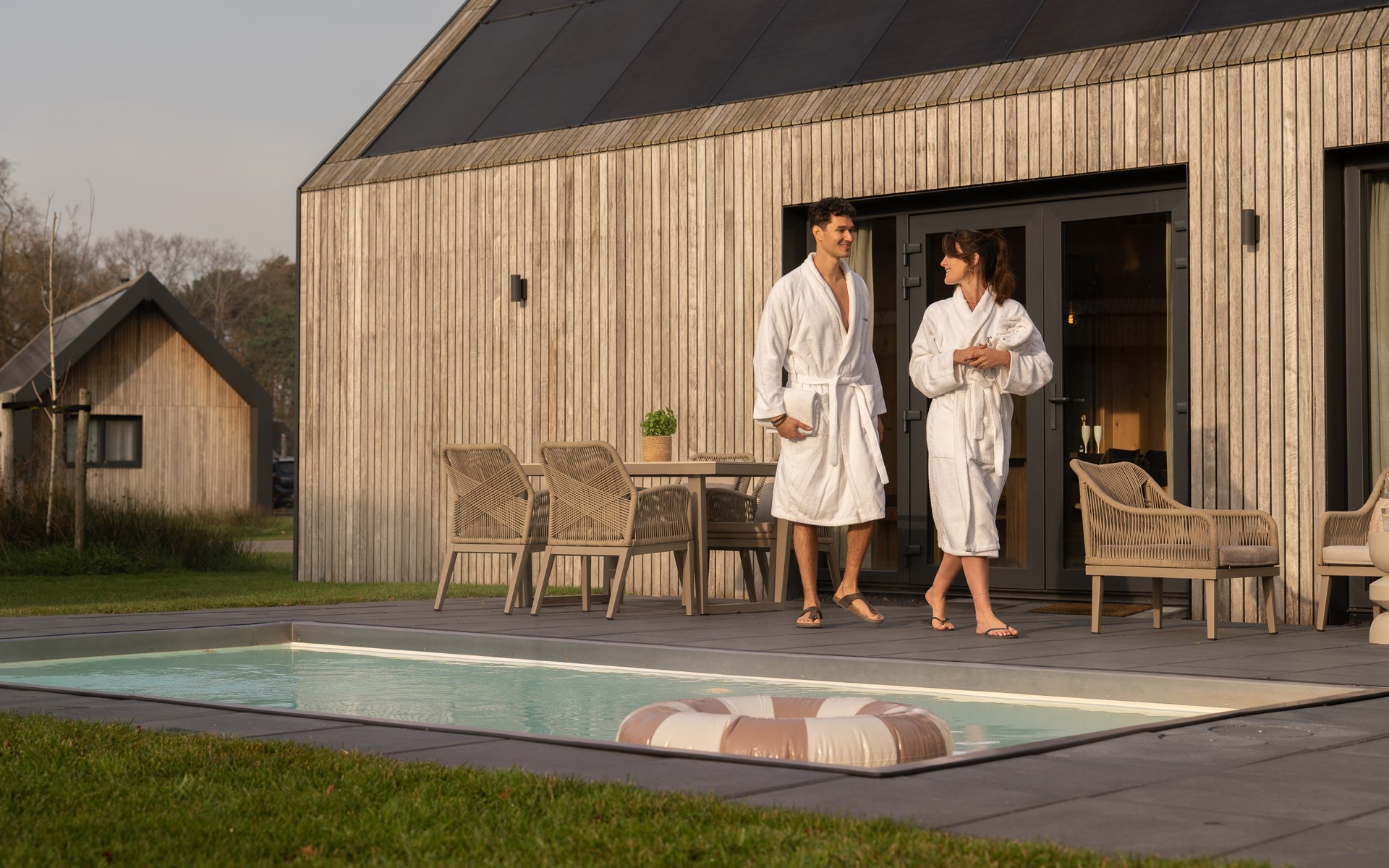 De luxe van een eigen zwembad, sauna en de rust van het park