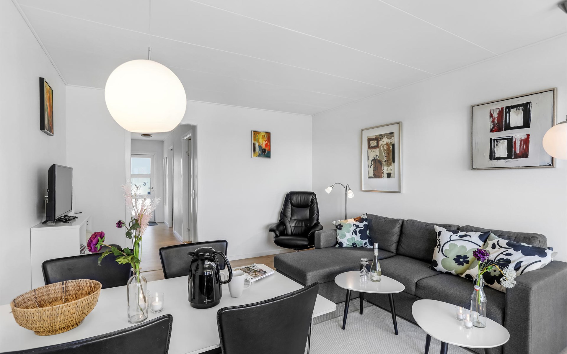 Het middelpunt van het appartement is de woonkamer met eethoek, goed meubilair (waaronder een slaapbank voor twee personen van 150 cm) en toegang tot een overdekt terras met tuinmeubilair en een prachtig uitzicht op zee. In de woonkamer kun je ontspannen, tv kijken en luisteren naar de radio of muziek.