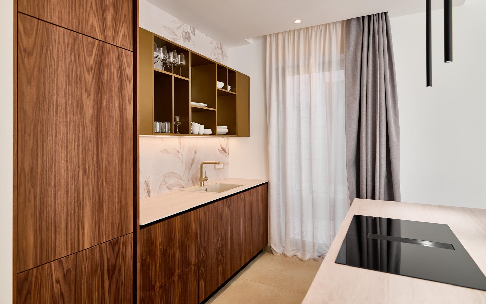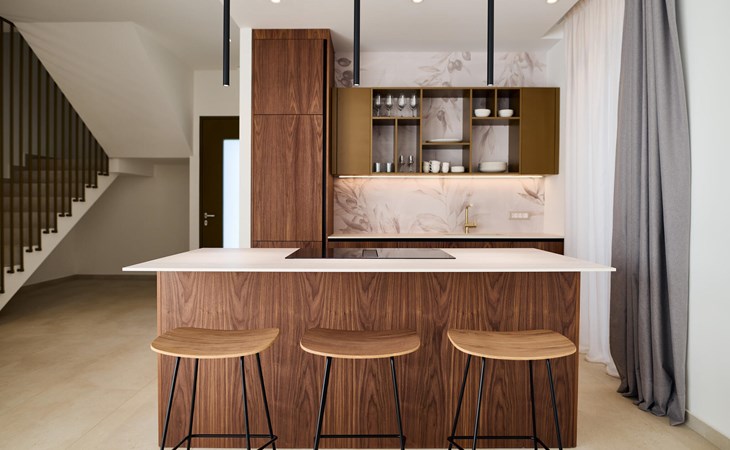De interieurs benadrukken warmte en functionaliteit, gekenmerkt door minimalistisch design en hoogwaardige materialen. Ontspan in de open woonkamer met een comfortabele bank, moderne meubels en grote panoramische ramen. Gebruik de elegante eethoek om samen te eten of bereid culinaire hoogstandjes in de prachtige keuken.