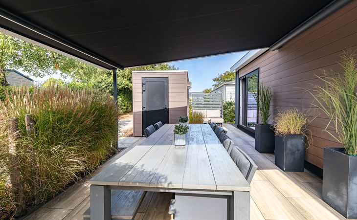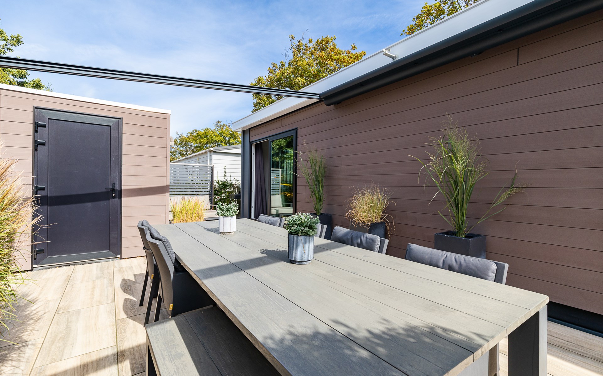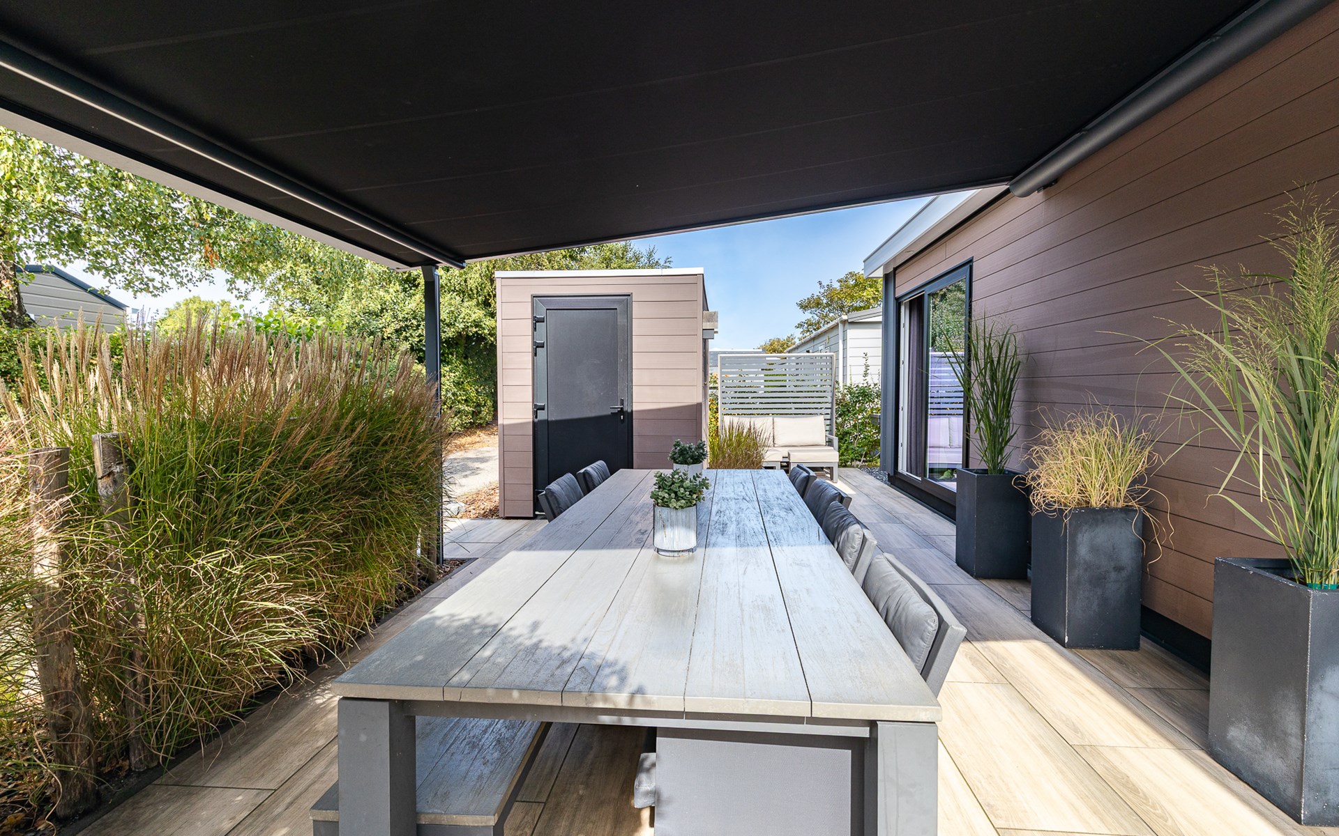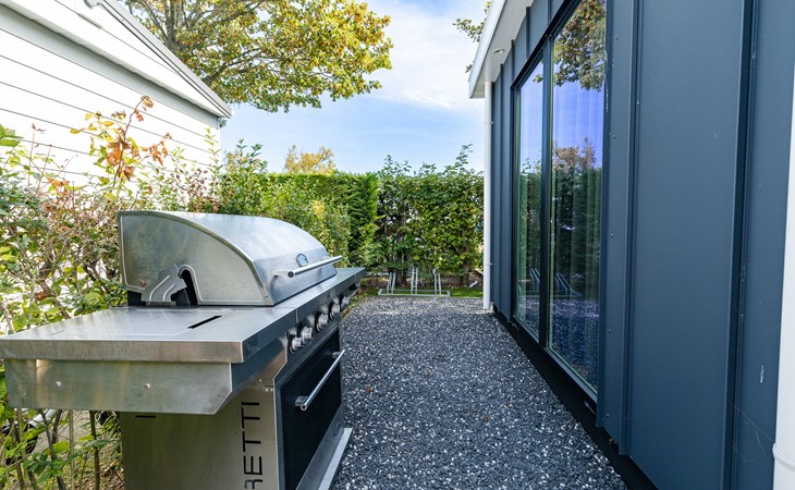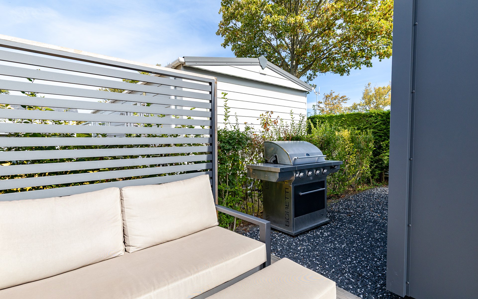 Buiten vind je een sfeervol terras van 60 m² dat volledig is betegeld en ingericht met een trendy eettafel, zes stoelen en een comfortabele loungebank. De stoelkussens kunnen gewoon buiten blijven liggen, zelfs tijdens een regenbui. Twee olijfbomen, diverse grassoorten en een grote parasol maken de tuin helemaal af. Het hoogtepunt is de luxe buitenkeuken met gasbarbecue, vier pitten en een zijbrander: ideaal voor lange zomeravonden en gezellig koken in de open lucht. Je auto parkeer je direct naast het chalet.