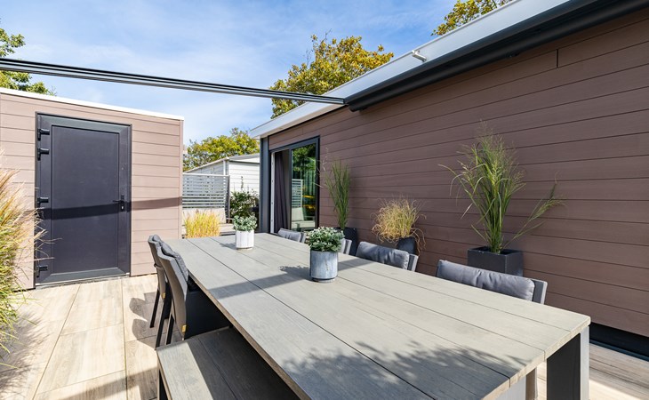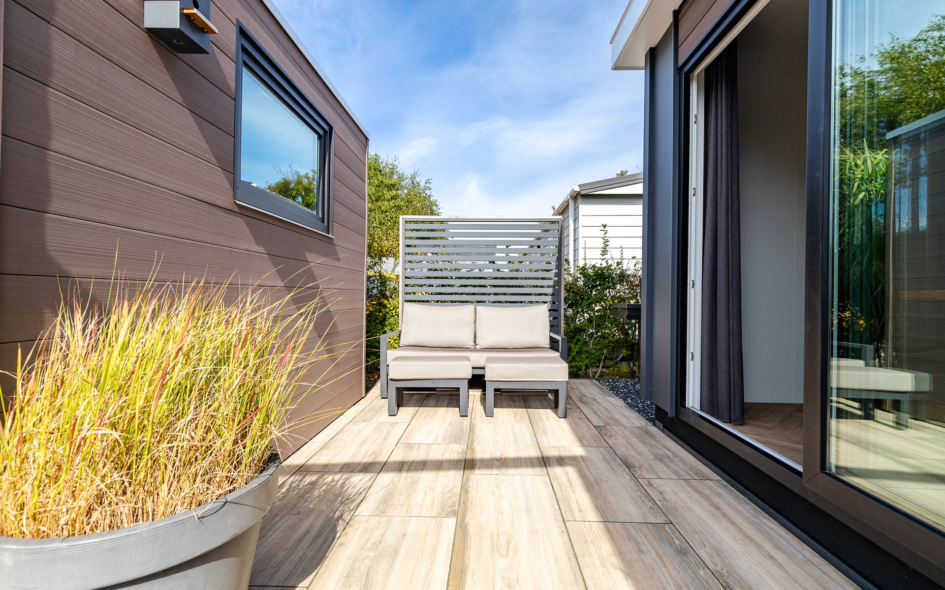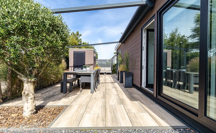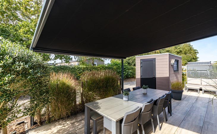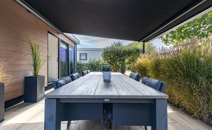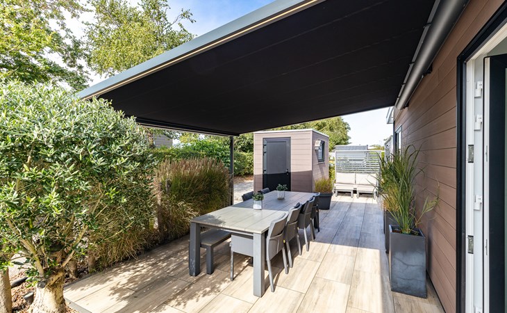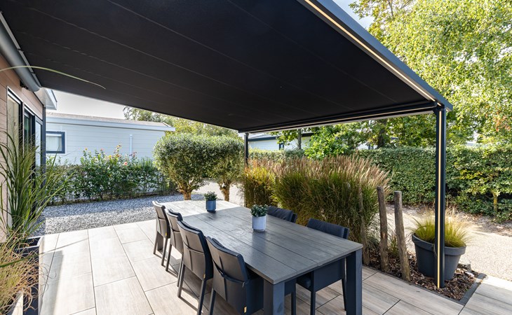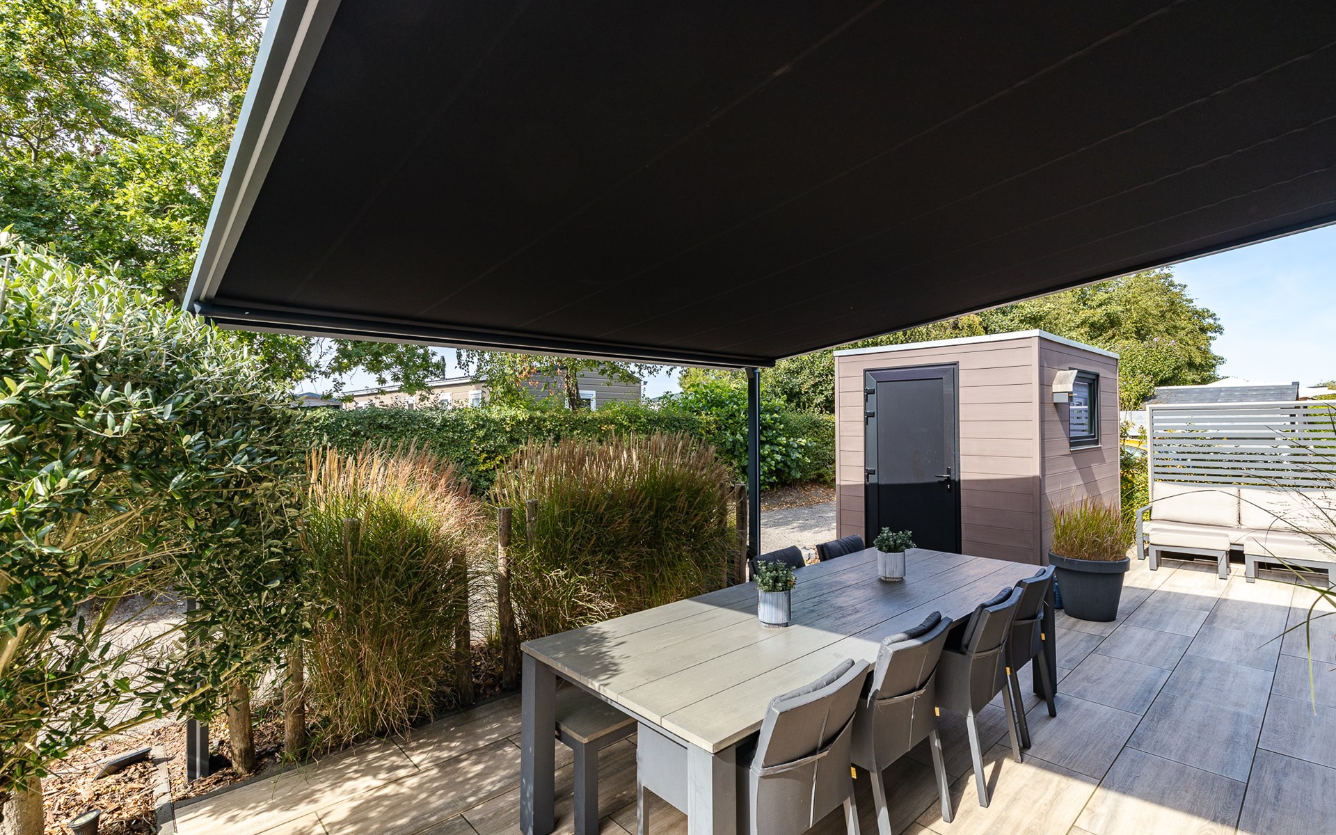 Buiten vind je een sfeervol terras van 60 m² dat volledig is betegeld en ingericht met een trendy eettafel, zes stoelen en een comfortabele loungebank. De stoelkussens kunnen gewoon buiten blijven liggen, zelfs tijdens een regenbui. Twee olijfbomen, diverse grassoorten en een grote parasol maken de tuin helemaal af. Het hoogtepunt is de luxe buitenkeuken met gasbarbecue, vier pitten en een zijbrander: ideaal voor lange zomeravonden en gezellig koken in de open lucht. Je auto parkeer je direct naast het chalet.