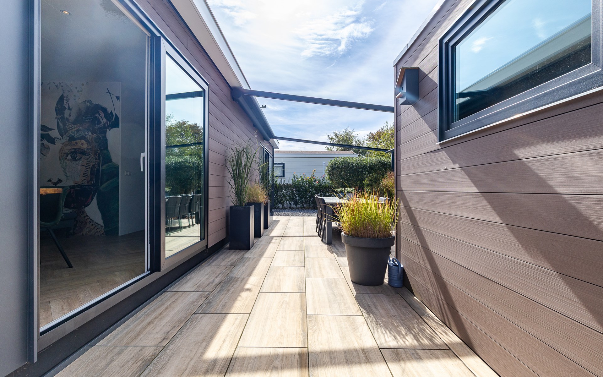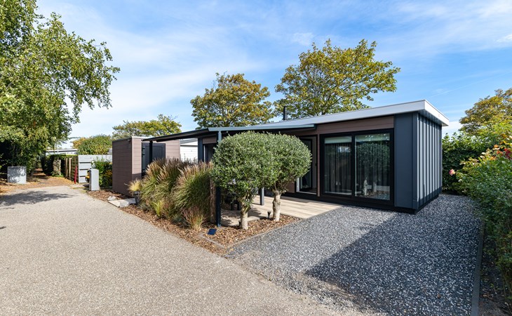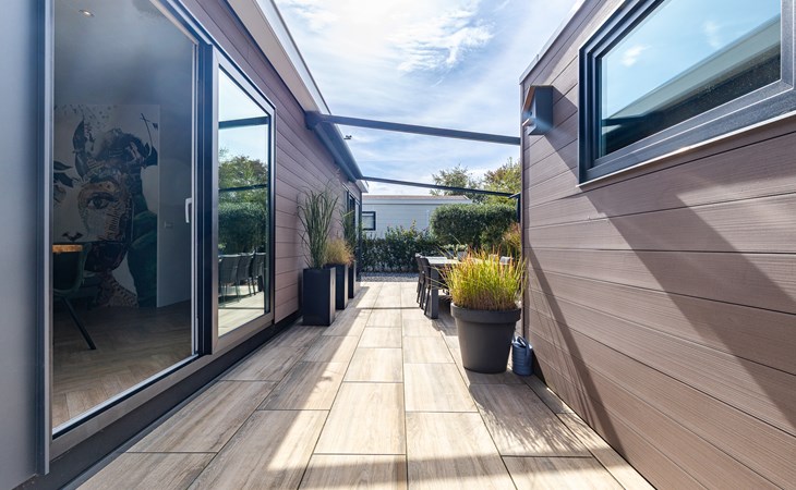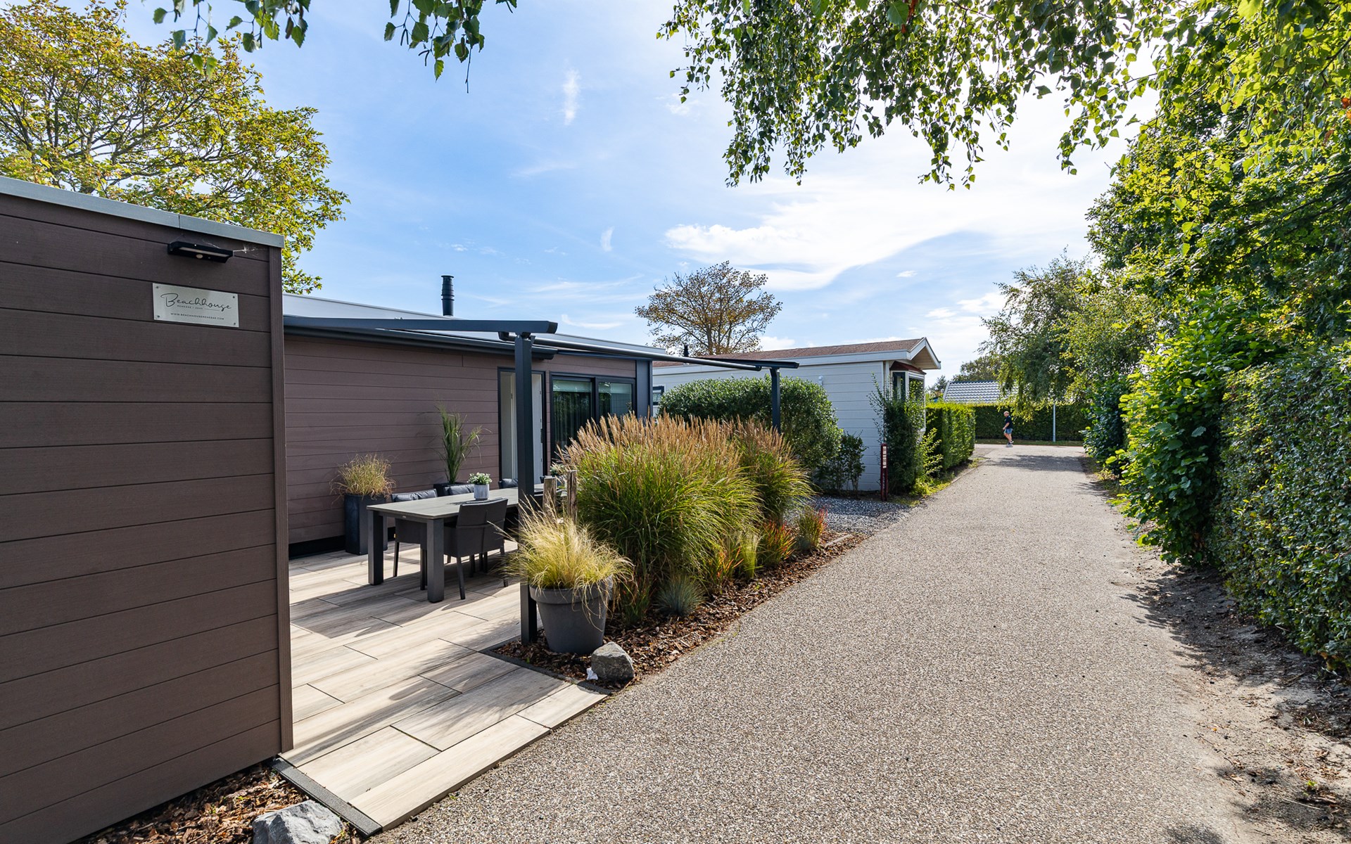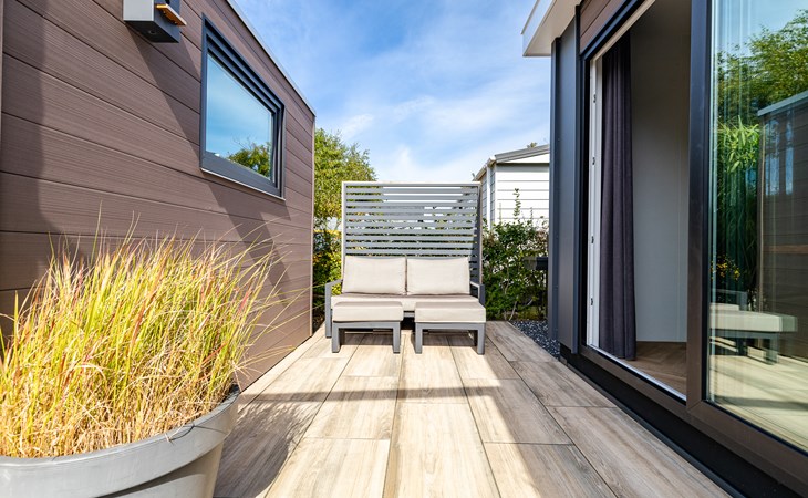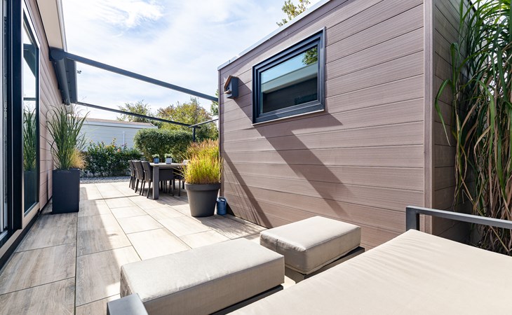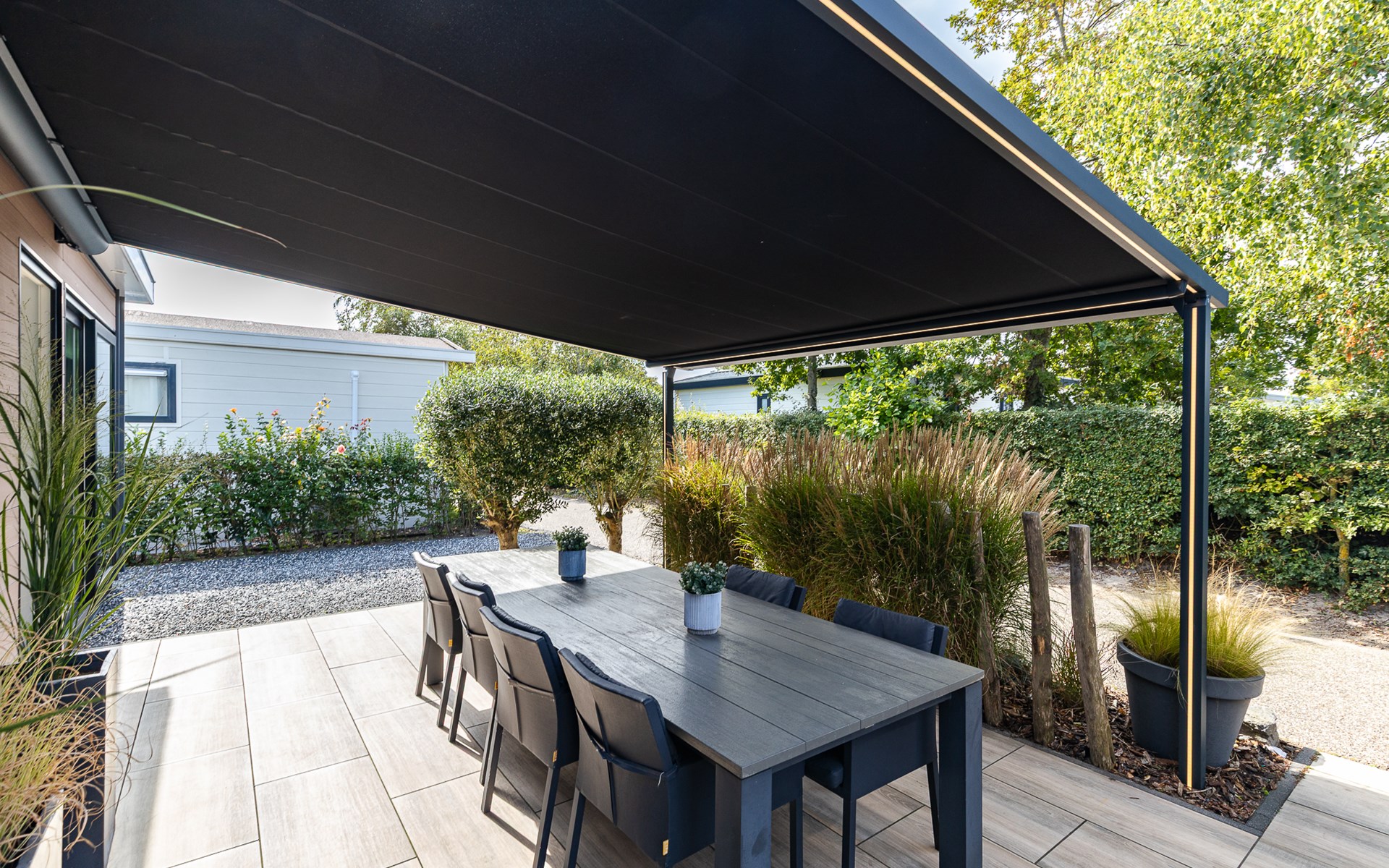 Buiten vind je een sfeervol terras van 60 m² dat volledig is betegeld en ingericht met een trendy eettafel, zes stoelen en een comfortabele loungebank. De stoelkussens kunnen gewoon buiten blijven liggen, zelfs tijdens een regenbui. Twee olijfbomen, diverse grassoorten en een grote parasol maken de tuin helemaal af. Het hoogtepunt is de luxe buitenkeuken met gasbarbecue, vier pitten en een zijbrander: ideaal voor lange zomeravonden en gezellig koken in de open lucht. Je auto parkeer je direct naast het chalet.