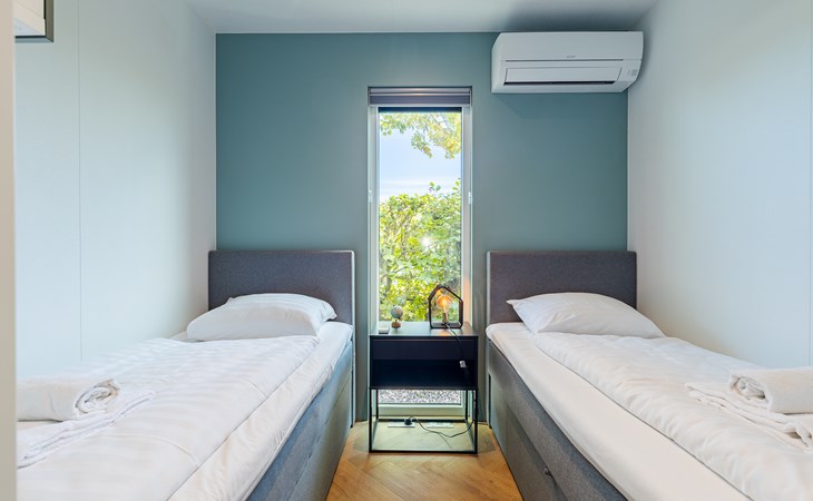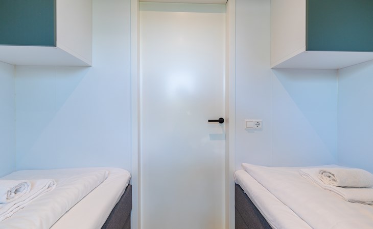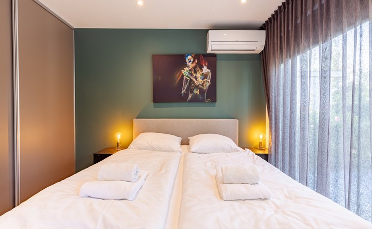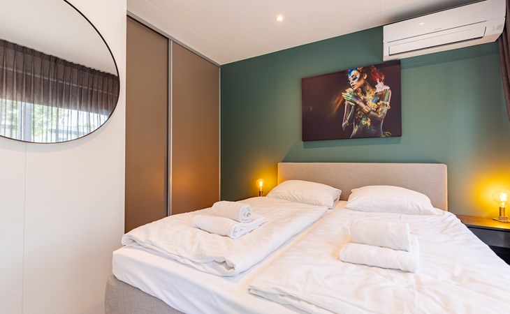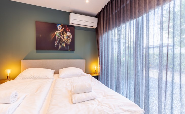 In de slaapkamers geniet je van een heerlijke nachtrust. De master bedroom is uitgerust met een luxe Swiss Sense bed, compleet met een speciale topper uit de hotellijn van Van der Valk, een grote kast en verduisterend rolgordijn. De tweede slaapkamer heeft twee boxsprings van 90 x 200 cm, twee hangkasten, een nachtkastje en een verduisterend plisségordijn. Bij aankomst zijn de bedden al opgemaakt, zodat jouw vakantie meteen kan beginnen.