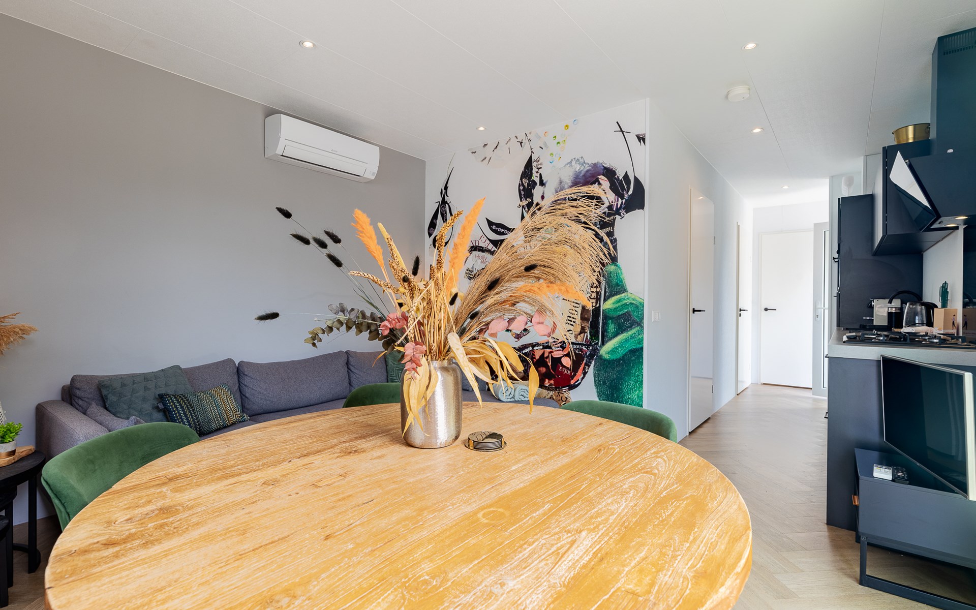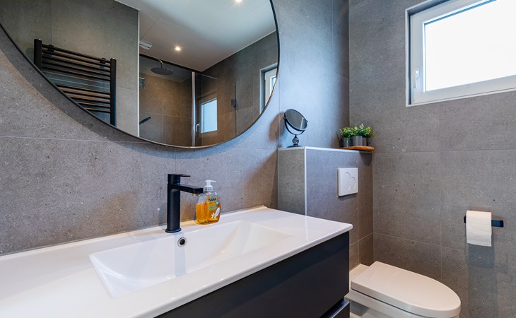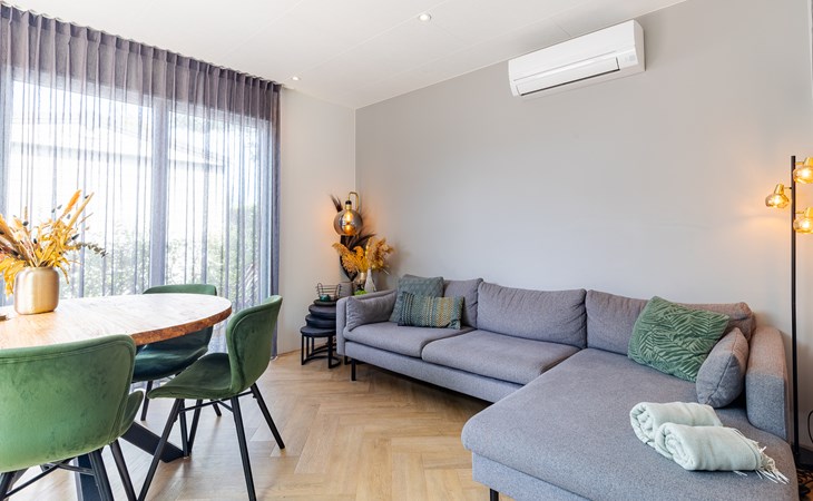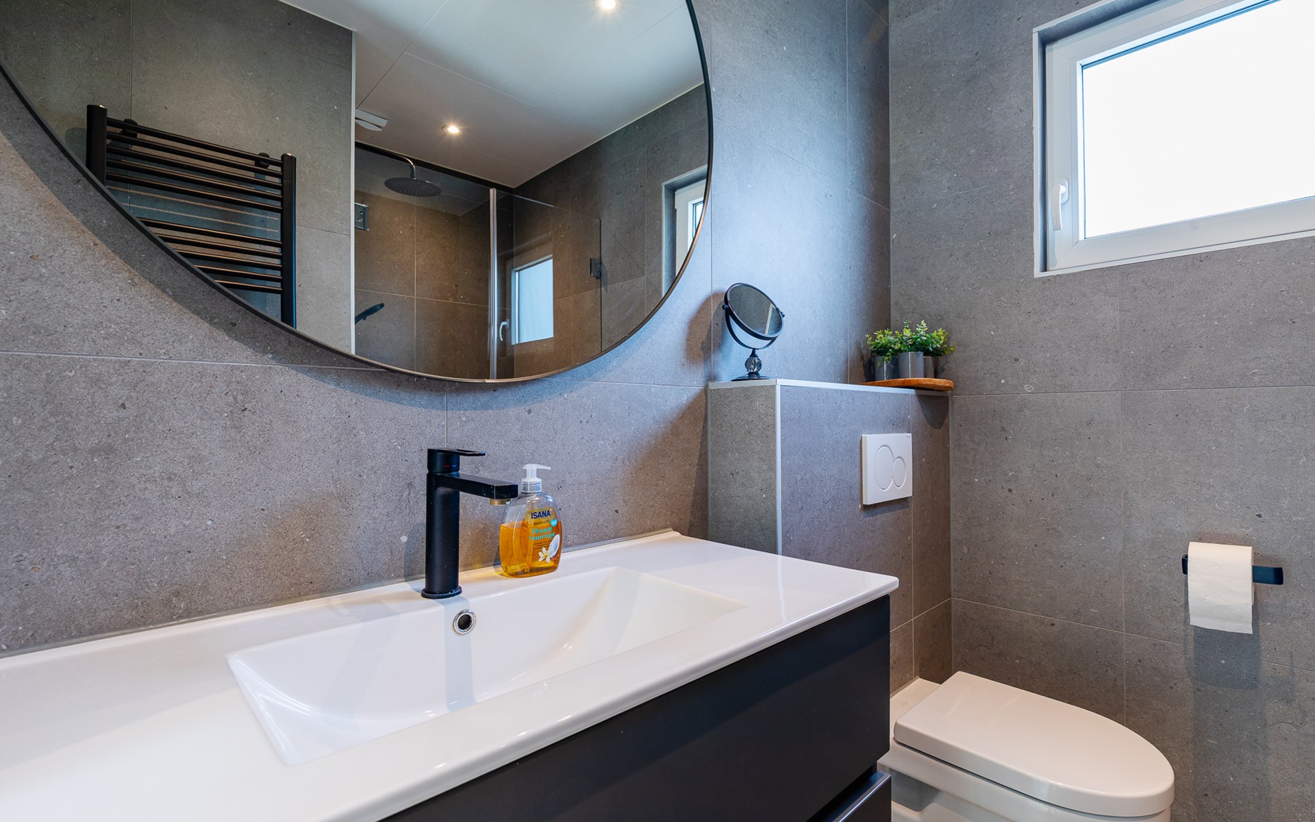 De badkamer is verrassend ruim en biedt een regendouche, handdouche, wastafelmeubel met veel kastruimte, toilet en een handdoekradiator. Dankzij de airco in de woonkamer én beide slaapkamers is het altijd aangenaam binnen, zelfs op warme zomerdagen.