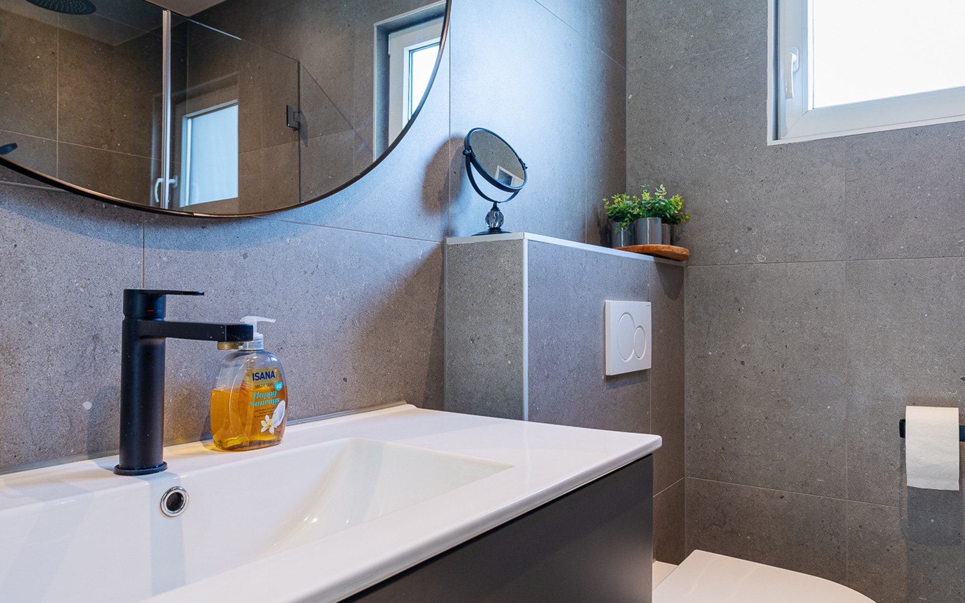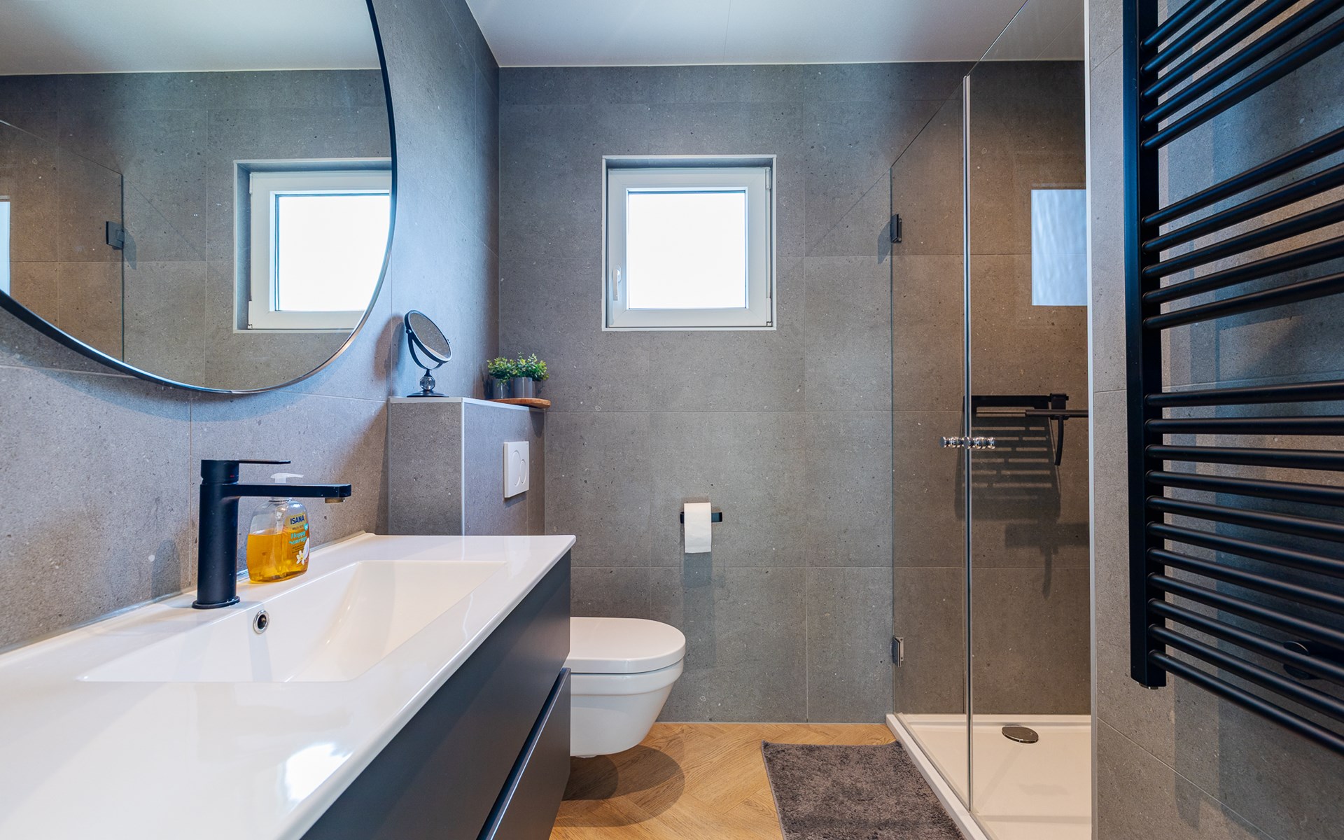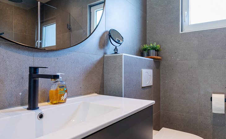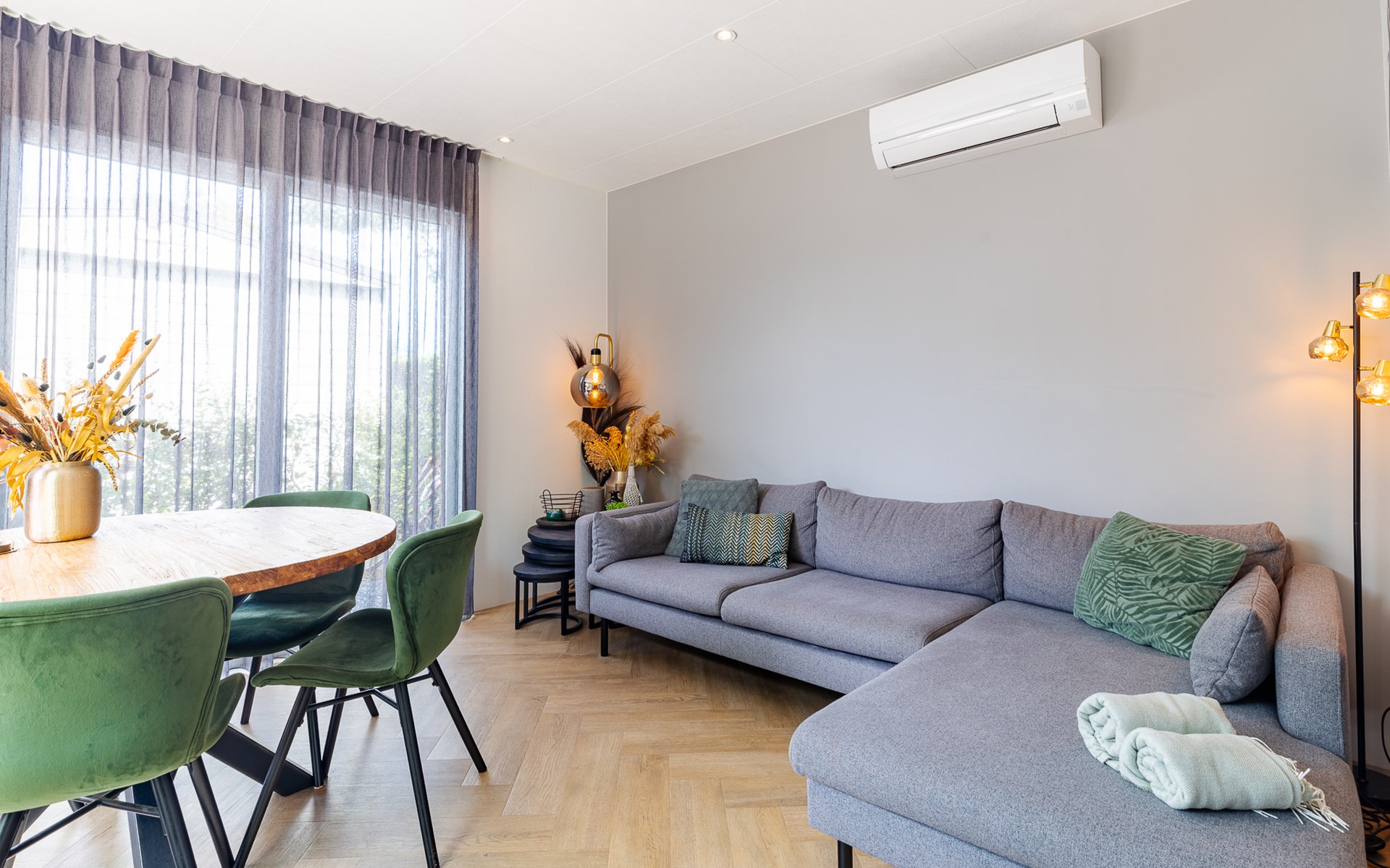 De badkamer is verrassend ruim en biedt een regendouche, handdouche, wastafelmeubel met veel kastruimte, toilet en een handdoekradiator. Dankzij de airco in de woonkamer én beide slaapkamers is het altijd aangenaam binnen, zelfs op warme zomerdagen.