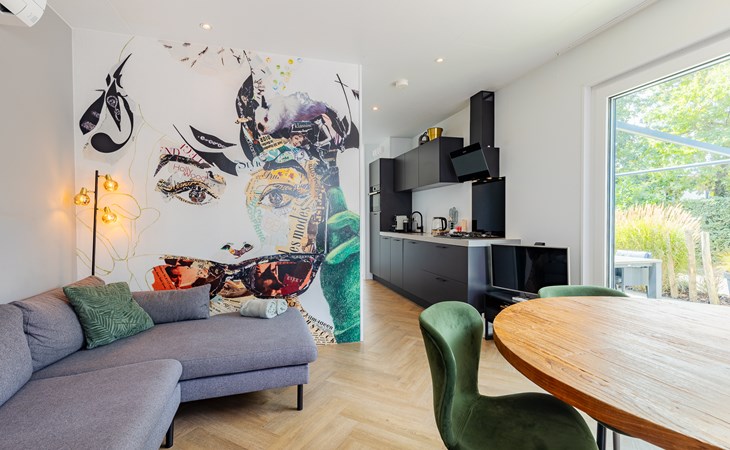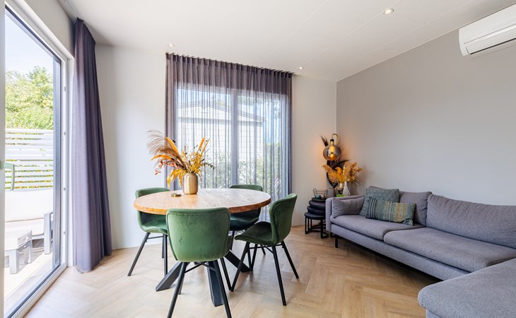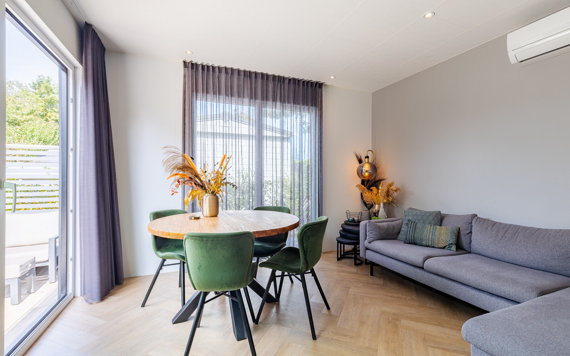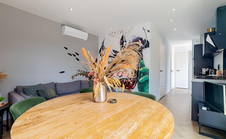 Het chalet is in 2021 gebouwd en volledig op maat ontworpen met hoogwaardige materialen. Alles klopt: de moderne inrichting, de praktische indeling en de warme sfeer maken dat je je hier snel thuis voelt. De woonkamer is ruim en licht dankzij de schuifpui naar het terras. Relax op de comfortabele hoekbank met smart-tv of geniet van een heerlijke maaltijd of speel een spelletje aan de gezellige ronde eethoek met vier stoelen.