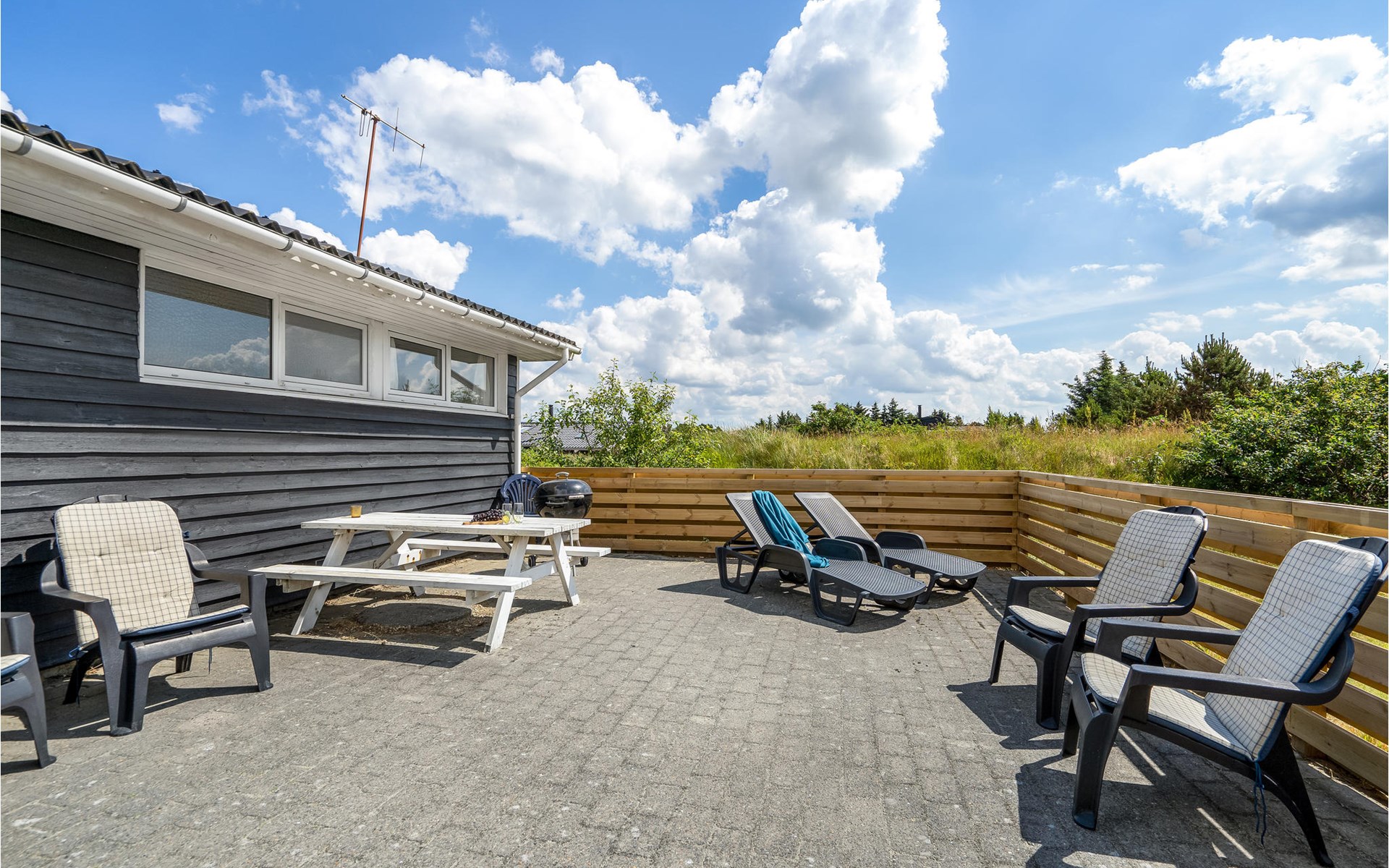 Breng de dag buiten door op het grote terras met comfortabele ligstoelen en zitmeubilair. Geniet hier van een ontspannen ontbijt of een rustige avond met het gezin. Het overdekte deel van het terras nodigt je uit om te blijven hangen en te genieten van een gezellig samenzijn, ongeacht het weer.