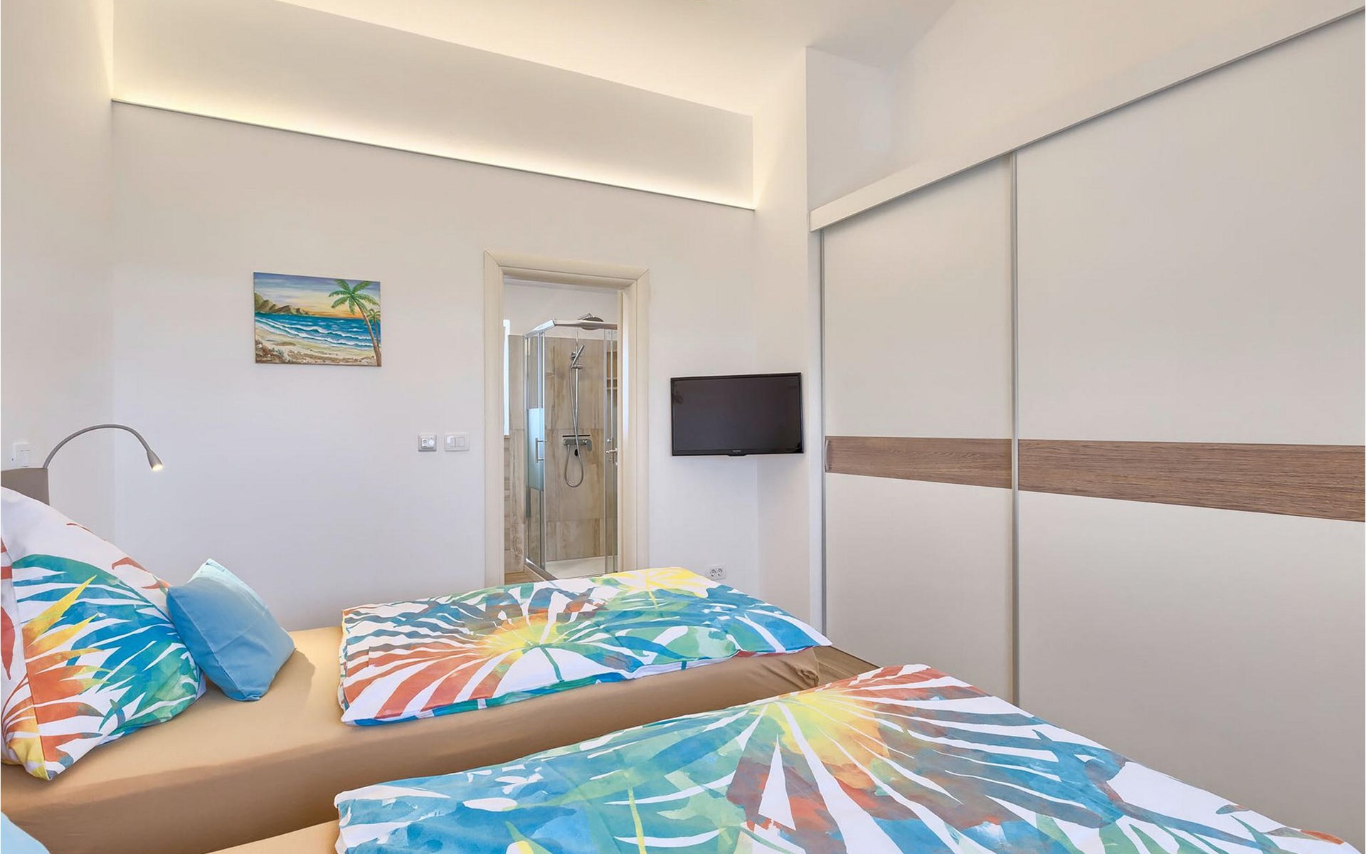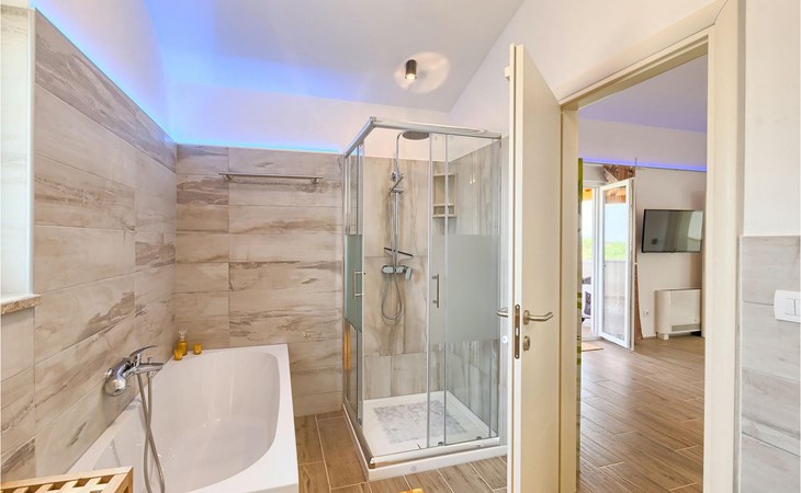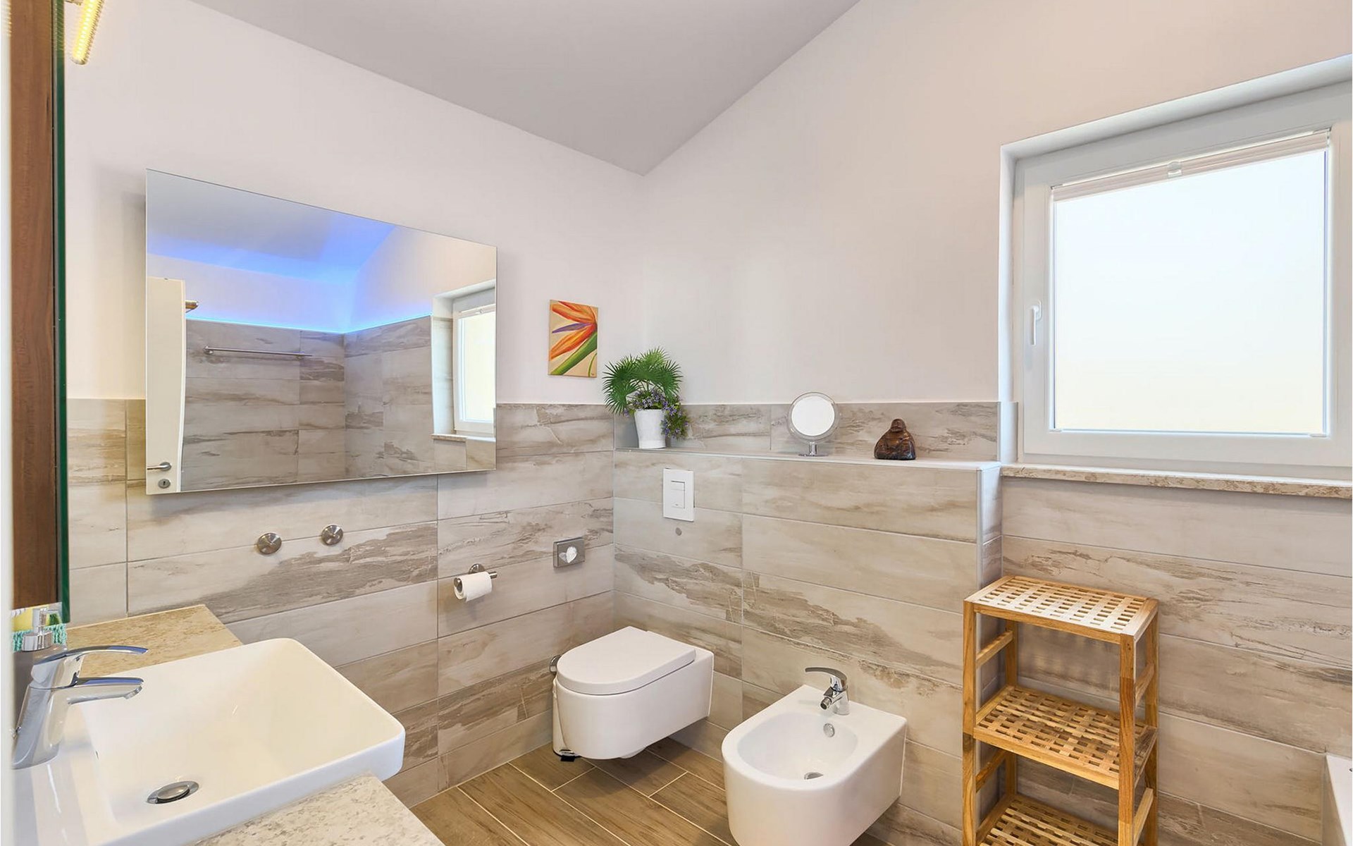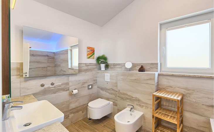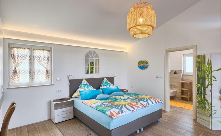 Twee van de slaapkamers - allemaal met airconditioning en flatscreen tv's - bevinden zich op de bovenverdieping, met twee prachtige en-suite badkamers met vloerverwarming en een ruim terras vanwaar je kunt genieten van een prachtig uitzicht over olijfgaarden naar de zee. De lichte, ruime benedenverdieping met open indeling is smaakvol verdeeld in een keuken, eet- en woonkamer met een gezellige open haard en vormt het sociale centrum van het huis. Hier bevindt zich ook de derde slaapkamer, ook met airconditioning en een flatscreentelevisie, evenals een en-suite badkamer. Bijna alle kamers en badkamers zijn uitgerust met sfeervolle LED-verlichting die kan worden aangepast aan de stemming.